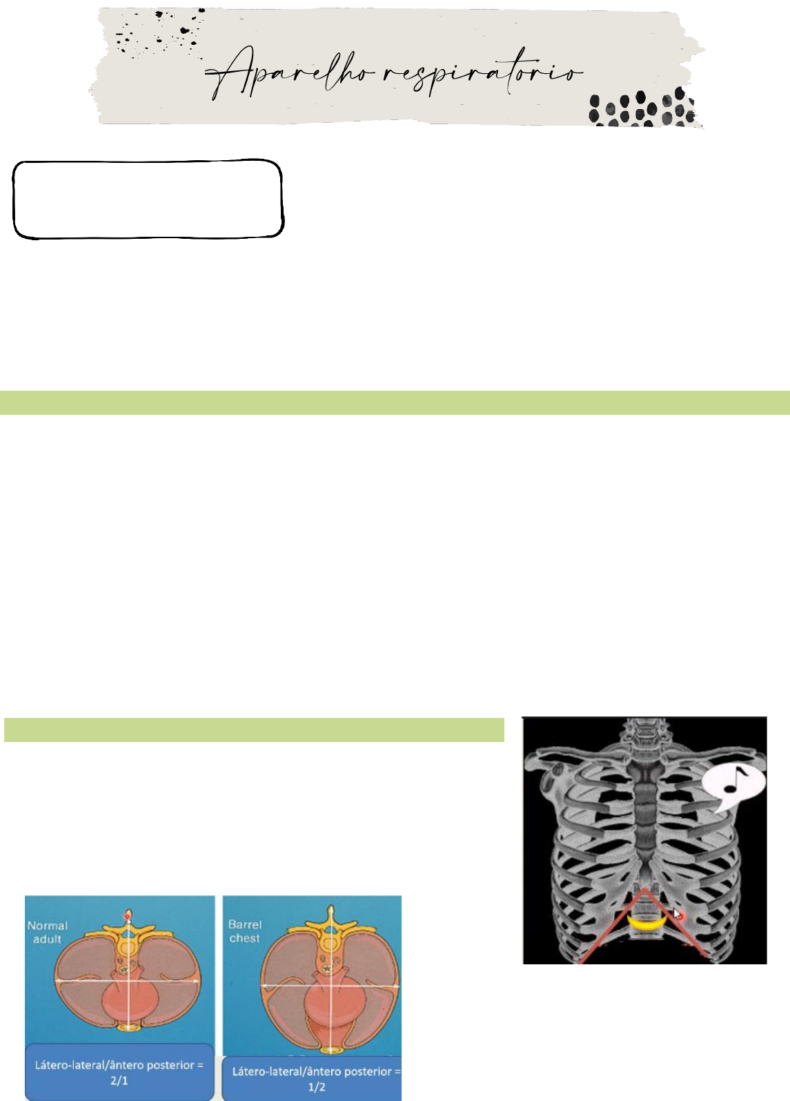 Inspeção estática • Tórax descoberto ou nu • Paciente em pé ou sentado, em atitude cômoda • Médico deve ficar a 2 metros de distância • Músculos relaxados, membros superiores caídos ao longo das faces laterais do tórax • Iluminação adequada Estruturas componentes da caixa torácica: • Mamas • Pulmões • Coração • Mediastino • Pele • Tecido celular subcutâneo • Linfonodos • Panículo adiposo • Musculatura • Sistema vascular superificial • Ossos Formas do tórax: Normais • Picnico ou brevelíneo – ângulo de Charpy > 90º • Atlético ou normolíneo – ângulo de Charpy = 90º • Astênico ou longilíneo – ângulo de Charpy < 90 º → Diâmetro látero-lateral/diâmetro antero-posterior = 2/1 Tórax do enfisema pulmonar – “tórax em barril” Abaulamentos e retrações: • Relatar assimetrias • Relatar retrações Inspeção dinâmica Tipos respiratórios: costal superior, costo-abdominal ou misto → Costal superior: da mulher, predominante a parte costal superior → Costo-abdominal: do homem, movimenta mais a parte inferior do abdome • Patologias: ascite (costal superior), pneumonia (costo-abdominal) Ritmo respiratório: • Normalmente os ciclos são iguais • Dispneia suspirosa (de repente o paciente dá uns suspiros, extremamente ligado à ansiedade) • Cantani-Kussmaul – paciente em acidose metabólica, aumenta a respiração para diminuir a acidose. O pulmão faz isso devido à estimulação do bulbo frente ao aumento do CO2 • Cheyne-Stockes – alteração do fluxo cerebral nos centros respiratórios devido a alteração do fluxo sanguíneo cerebral, paciente tem momentos de apneia (ocorre em aterosclerose, ICC, tumor cerebral ou hipertensão intracraniana) • Biot – paciente com meningite ou trauma craniano, o centro respiratório não tem padrão devido ao grave sofrimento cerebral Frequência respiratória (FR): • Adulto normal – 15 a 21 movimentos resp/min • Aumento – chamado de polipneia ou taquipneia → Ocorre por acidose metabólica ou respiratória: amplitude aumentada, mas a FR não aumenta muito → Anóxia: amplitude diminuída e FR aumentada • Diminuição – chamado de bradipneia (poucas excursões e lentas) Expansibilidade: • Raios visuais dirigidos nos 2º intercostais, na linha hemiclavicular e nas últimas costelas na linha axilar anterior (somente pela região anterior do tórax) • Variações fisiológicas: exercício físico e no sono fisiológico • Patologias bilaterais: → Aumento – acidose metabólica ou respiratória → Diminuição – anóxia, rigidez torácica por anquilose das cartilagens costais, enfisema, dor torácica, lesões extensas dos pulmões • Patologias unilaterais: não existe aumento! → Diminuição – derrame, paquipleuris, fibrose pleural, pneumotórax, pneumonia, fibrose pulmonar, bronquiectasias Cornagem ou traqueísmo: • Respiração ruidosa: obstáculos à passagem do ar • Causas: obstruções inflamatórias ou neoplásicas da laringe e da traqueia, edema de glote, espasmo laríngeo (coqueluche ou corpo estranho) • Ver se a cartilagem cricoide abaixa junto com a respiração, nesse caso o paciente aspirou alguma coisa. Sem abaixamento o paciente pode ter aspirado algo que foi parar em algum bronquio ou bronquíolo • Ver se a cartilagem cricoide abaixa junto com a respiração, nesse caso o paciente aspirou alguma coisa. Sem abaixamento o paciente pode ter aspirado algo que foi parar em algum bronquio ou bronquíolo Tiragem: • Retração dinâmica respiratória durante toda a inspiração (quando mais falta de ar, mais retração) • Locais de inspeção: intercostos, regiões supra-esternais, supra-claviculares, epigástrica, hipocôndrios, lombares Sinal de Lemos Torres: • Paciente sentado, respiração tranquila • Médico por detrás do paciente observando a linha axilar posterior, últimos intercostais • Decúbito lateral oposto e observar se desaparece o abaulamento (diferenciar de enfisema ou cavidades pulmonar em hipertensão) • Abaulamento expiratório localizado 1, 2 ou 3 últimos intercostos (9º, 10º, 11º na linha axilar posterior, 5 a 10 cm de extensão, desaparecendo no DL oposto) • Derrames de médio a pequeno volume Palpação: • Sensibilidade, expansibilidade, elasticidade e frêmitos (vibrações) • Semiotécnica: usar sempre a mesma mão, sempre de cima para baixo • Pontos dolorosos: apertar embaixo das costelas, pois os feixes vasculonervosos estão na borda inferior das costelas → Síndrome de Tietze: inflamação das cartilagens que unem as costelas • Manobra de Ruault: exploração dos lobos superiores, as mãos ficam espalmadas sobre as regiões supraclaviculares, extremidades dos polegares na 7ª vértebra cervical. • A exploração das bases pulmonares (face posterior e anterior), coloca as mãos no terço médio (entre as escápulas), pega a parte lateral, ponho os dedos polegares na parte dorsal e ver se tem movimentação semelhante ou não. • Viro o paciente de frente, com o dedo indicador e médio palpar todo o peitoral, na parte lateral. Para verificar a expansibilidade espalmar as mãos no peitoral. Abaixo do peitoral fazer um angulo com as mãos abertas • Manobra de Lasègue: para verificar se o pulmão está elástico, espalmar as duas mãos, uma no peitoral, outra nas escápulas e pedir pro paciente respirar – verificar as regiões infra-claviculares, inter- escapulares, mamárias, hipocôndrios, infra-escapulares → Única situação patológica: diminuição Palpação dos frêmitos respiratórios: • Frêmito brônquico: expressão táctil de perturbação do livre trânsito do ar na luz dos brônquios • Frêmito pleural: vibração no final da inspiração e início da expiração. Faces externas e látero- anteriores – regiões inferiores → O paciente fala 33, se tiver alguma patologia haverá uma vibração maior → A ausculta fica prejudicada s