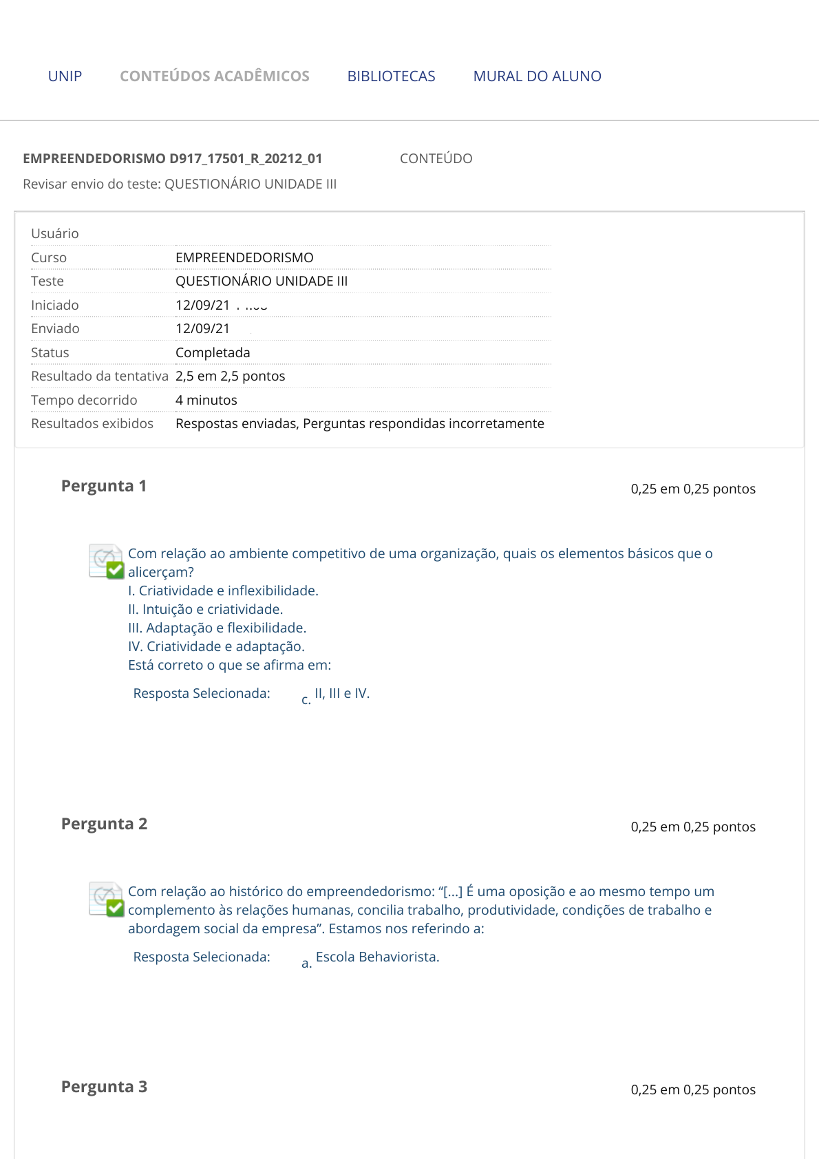 Revisar envio do teste: QUESTIONÁRIO UNIDADE III EMPREENDEDORISMO D917_17501_R_20212_01 CONTEÚDO Usuário RITA DE CASSIA TEIXEIRA Curso EMPREENDEDORISMO Teste QUESTIONÁRIO UNIDADE III Iniciado 12/09/21 14:08 Enviado 12/09/21 14:12 Status Completada Resultado da tentativa 2,5 em 2,5 pontos Tempo decorrido 4 minutos Resultados exibidos Respostas enviadas, Perguntas respondidas incorretamente Pergunta 1 Resposta Selecionada: c. Com relação ao ambiente competitivo de uma organização, quais os elementos básicos que o alicerçam? I. Criatividade e in�exibilidade. II. Intuição e criatividade. III. Adaptação e �exibilidade. IV. Criatividade e adaptação. Está correto o que se a�rma em: II, III e IV. Pergunta 2 Resposta Selecionada: a. Com relação ao histórico do empreendedorismo: “[...] É uma oposição e ao mesmo tempo um complemento às relações humanas, concilia trabalho, produtividade, condições de trabalho e abordagem social da empresa”. Estamos nos referindo a: Escola Behaviorista. Pergunta 3 UNIP BIBLIOTECAS MURAL DO ALUNOCONTEÚDOS ACADÊMICOS 0,25 em 0,25 pontos 0,25 em 0,25 pontos 0,25 em 0,25 pontos Resposta Selecionada: d. Conforme estudado no texto, empreendedorismo pode ser ensinado? Assinale abaixo a alternativa correta: O processo empreendedor pode ser ensinado e entendido por qualquer pessoa. Pergunta 4 Resposta Selecionada: a. De acordo com Dorneles (2008), as habilidades requeridas de um empreendedor podem ser classi�cadas em: Habilidades técnicas, gerenciais e características pessoais. Pergunta 5 Resposta Selecionada: d. Dentro de uma empresa, aquele colaborador que inova, identi�ca e cria oportunidades de negócio é chamado de: Intraempreendedor. Pergunta 6 Resposta Selecionada: b. Existem vários mitos sobre empreendedorismo, conforme Dornelas (2008). Assinale a alternativa correta: Empreendedores são natos, nascem para o sucesso. Pergunta 7 O empreendedor, além dos atributos do administrador, também possui características extras. Essas características podem ser identi�cadas conforme descritas abaixo: I. Decisão e responsabilidade. II. Volúvel e indecisão. III. Não aceitação dos riscos. IV. Ser voltado para a equipe. 0,25 em 0,25 pontos 0,25 em 0,25 pontos 0,25 em 0,25 pontos 0,25 em 0,25 pontos Domingo, 12 de Setembro de 2021 14h12min43s BRT Resposta Selecionada: c. Está correto o que se a�rma em: I e IV. Pergunta 8 Resposta Selecionada: a. O movimento do empreendedorismo no Brasil começou a tomar forma quando entidades como o SEBRAE e a Softex foram criadas. Em que década isso ocorreu? Assinale a alternativa correta: Década de 1990. Pergunta 9 Resposta Selecionada: b. O processo empreendedor é composto por fases, que são elas: I. 1° fase: Identi�car e avaliar uma oportunidade. II. 2° fase: Ideias criativas. III. 3° fase: Determinar e captar os recursos necessários. IV. 4° fase: Gerenciar a empresa criada. Está correta a alternativa: I, III e IV. Pergunta 10 Resposta Selecionada: b. Para ajudar a vencer e a driblar a competitividade dos tempos modernos, o empreendedor deve focar nos quatro pilares da educação, que são: I. Aprender a conhecer. II. Aprender a fazer. III. Aprender a trabalhar individualmente. IV. Aprender a ser. Está correto o que se a�rma em: I, II e IV. ← OK 0,25 em 0,25 pontos 0,25 em 0,25 pontos 0,25 em 0,25 pontos Powered by TCPDF (www.tcpdf.org) http://www.tcpdf.org