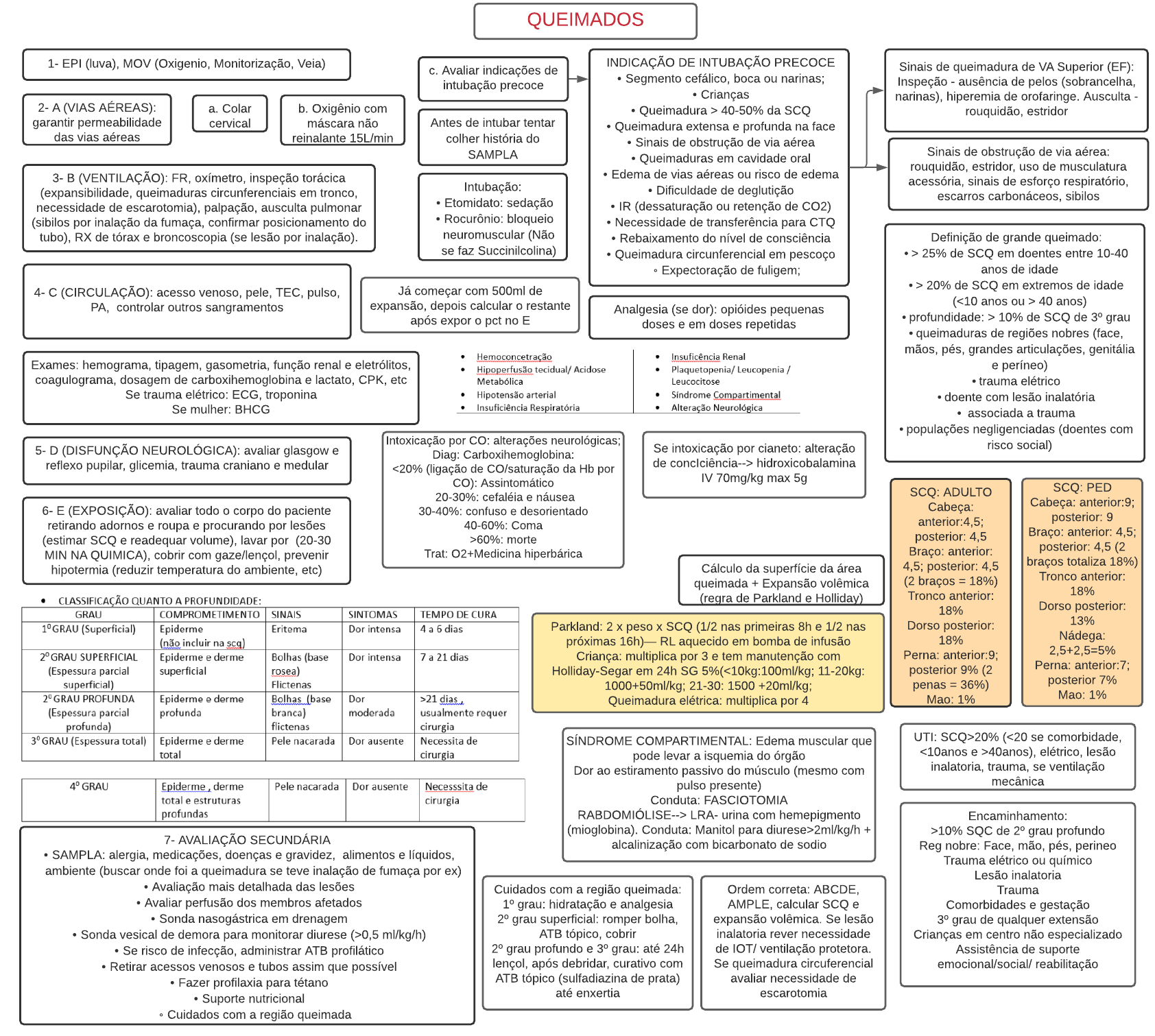 2- A (VIAS AÉREAS): garantir permeabilidade das vias aéreas 3- B (VENTILAÇÃO): FR, oxímetro, inspeção torácica (expansibilidade, queimaduras circunferenciais em tronco, necessidade de escarotomia), palpação, ausculta pulmonar (sibilos por inalação da fumaça, confirmar posicionamento do tubo), RX de tórax e broncoscopia (se lesão por inalação). 4- C (CIRCULAÇÃO): acesso venoso, pele, TEC, pulso, PA, controlar outros sangramentos 1- EPI (luva), MOV (Oxigenio, Monitorização, Veia) 5- D (DISFUNÇÃO NEUROLÓGICA): avaliar glasgow e reflexo pupilar, glicemia, trauma craniano e medular 6- E (EXPOSIÇÃO): avaliar todo o corpo do paciente retirando adornos e roupa e procurando por lesões (estimar SCQ e readequar volume), lavar por (20-30 MIN NA QUIMICA), cobrir com gaze/lençol, prevenir hipotermia (reduzir temperatura do ambiente, etc) Sinais de obstrução de via aérea: rouquidão, estridor, uso de musculatura acessória, sinais de esforço respiratório, escarros carbonáceos, sibilos Sinais de queimadura de VA Superior (EF): Inspeção - ausência de pelos (sobrancelha, narinas), hiperemia de orofaringe. Ausculta - rouquidão, estridorb. Oxigênio com máscara não reinalante 15L/min c. Avaliar indicações de intubação precoce a. Colar cervical Exames: hemograma, tipagem, gasometria, função renal e eletrólitos, coagulograma, dosagem de carboxihemoglobina e lactato, CPK, etc Se trauma elétrico: ECG, troponina Se mulher: BHCG Cálculo da superfície da área queimada + Expansão volêmica (regra de Parkland e Holliday) INDICAÇÃO DE INTUBAÇÃO PRECOCE - Segmento cefálico, boca ou narinas; - Crianças - Queimadura > 40-50% da SCQ - Queimadura extensa e profunda na face - Sinais de obstrução de via aérea - Queimaduras em cavidade oral - Edema de vias aéreas ou risco de edema - Dificuldade de deglutição - IR (dessaturação ou retenção de CO2) - Necessidade de transferência para CTQ - Rebaixamento do nível de consciência - Queimadura circunferencial em pescoço - Expectoração de fuligem; Antes de intubar tentar colher história do SAMPLA Intubação: - Etomidato: sedação - Rocurônio: bloqueio neuromuscular (Não se faz Succinilcolina) Analgesia (se dor): opióides pequenas doses e em doses repetidas 7- AVALIAÇÃO SECUNDÁRIA - SAMPLA: alergia, medicações, doenças e gravidez, alimentos e líquidos, ambiente (buscar onde foi a queimadura se teve inalação de fumaça por ex) - Avaliação mais detalhada das lesões - Avaliar perfusão dos membros afetados - Sonda nasogástrica em drenagem - Sonda vesical de demora para monitorar diurese (>0,5 ml/kg/h) - Se risco de infecção, administrar ATB profilático - Retirar acessos venosos e tubos assim que possível - Fazer profilaxia para tétano - Suporte nutricional - Cuidados com a região queimada Ordem correta: ABCDE, AMPLE, calcular SCQ e expansão volêmica. Se lesão inalatoria rever necessidade de IOT/ ventilação protetora. Se queimadura circuferencial avaliar necessidade de escarotomia Já começar com 500ml de expansão, depois calcular o restante após expor o pct no E Cuidados com a região queimada: 1º grau: hidratação e analgesia 2º grau superficial: romper bolha, ATB tópico, cobrir 2º grau profundo e 3º grau: até 24h lençol, após debridar, curativo com ATB tópico (sulfadiazina de prata) até enxertia Parkland: 2 x peso x SCQ (1/2 nas primeiras 8h e 1/2 nas próximas 16h)? RL aquecido em bomba de infusão Criança: multiplica por 3 e tem manutenção com Holliday-Segar em 24h SG 5%(<10kg:100ml/kg; 11-20kg: 1000+50ml/kg; 21-30: 1500 +20ml/kg; Queimadura elétrica: multiplica por 4 Encaminhamento: >10% SQC de 2º grau profundo Reg nobre: Face, mão, pés, perineo Trauma elétrico ou químico Lesão inalatoria Trauma Comorbidades e gestação 3º grau de qualquer extensão Crianças em centro não especializado Assistência de suporte emocional/social/ reabilitação UTI: SCQ>20% (<20 se comorbidade, <10anos e >40anos), elétrico, lesão inalatoria, trauma, se ventilação mecânica SCQ: ADULTO Cabeça: anterior:4,5; posterior: 4,5 Braço: anterior: 4,5; posterior: 4,5 (2 braços = 18%) Tronco anterior: 18% Dorso posterior: 18% Perna: anterior:9; posterior 9% (2 penas = 36%) Mao: 1% Definição de grande queimado: - > 25% de SCQ em doentes entre 10-40 anos de idade - > 20% de SCQ em extremos de idade (<10 anos ou > 40 anos) - profundidade: > 10% de SCQ de 3º grau - queimaduras de regiões nobres (face, mãos, pés, grandes articulações, genitália e períneo) - trauma elétrico - doente com lesão inalatória - associada a trauma - populações negligenciadas (doentes com risco social) SÍNDROME COMPARTIMENTAL: Edema muscular que pode levar a isquemia do órgão Dor ao estiramento passivo do músculo (mesmo com pulso presente) Conduta: FASCIOTOMIA RABDOMIÓLISE--> LRA- urina com hemepigmento (mioglobina). Conduta: Manitol para diurese>2ml/kg/h + alcalinização com bicarbonato de sodio Se intoxicação por cianeto: alteração de concIciência--> hidroxicobalamina IV 70mg/kg max 5g Intoxicação por CO: alterações neurológicas; Diag: Carboxihemoglobina: <20% (ligação de CO/saturação da Hb por CO): Assintomático 20-30%: cefaléia e náusea 30-40%: confuso e desorientado 40-60%: Coma >60%: morte Trat: O2+Medicina hiperbárica SCQ: PED Cabeça: anterior:9; posterior: 9 Braço: anterior: 4,5; posterior: 4,5 (2 braços totaliza 18%) Tronco anterior: 18% Dorso posterior: 13% Nádega: 2,5+2,5=5% Perna: anterior:7; posterior 7% Mao: 1% QUEIMADOS Queimaduras Page 1