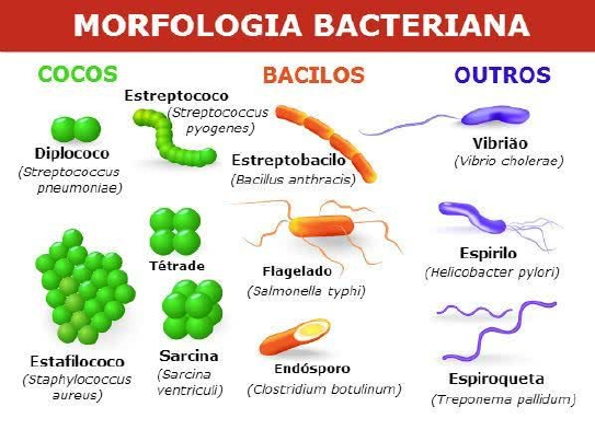 Classificação dos seres vivos e Citologia Bacteriana ● Características Gerais das Bactérias: ➢ São seres unicelulares, sem carioteca, ou seja, sem membrana nuclear. Há um único compartimento, o citoplasma. ➢ O DNA está enovelado na região central, sem qualquer separação do resto do conteúdo citoplasmático. Suas paredes celulares quase sempre contém o polissacarídeo complexo peptídeoglicano. Usualmente se dividem por fissão binária, durante esse processo, o DNA é duplicado e a célula se divide em duas. !O peptidioglicano é formado por dois tipos de açúcares e alguns aminoácidos. É a estrutura que confere rigidez à parede celular de bactérias, determina a forma da bactéria e protege da lise osmótica, quando em meio hipotônico. ● Morfologia: Apresentam uma das três formas básicas: cocos, bacilos e espirilos. 1 – Cocos: são células geralmente arredondadas, mas podem ser ovoides ou achatadas. Quando se dividem para se reproduzir, podem permanecer unidos uns aos outros, o que os classificam em: a) Diplococos – são os que permanecem em pares após a divisão. b) Estreptococos - se dividem e permanecem ligados em forma de cadeia. c) Tétrades – se dividem em dois planos e permanecem em grupos de quatro. d) Estafilococos - se dividem em múltiplos planos e formam cachos (forma de arranjo). e) Sarcinas - se dividem em três planos, permanecendo unidos em forma de cubo com oito bactérias. 2 – Bacilos: são células cilíndricas ou em forma de bastão. Existem diferenças em comprimento e largura entre as várias espécies de bacilos. As porções terminais são quadradas, outras arredondadas e, ainda, outras são afiladas ou pontiagudas. 3 – Espirilos: são bactérias de forma espiralada (como um saca-rolhas). Algumas formas são rígidas e outras flexíveis (espiroquetas). Uma forma que se parece com uma vírgula chama-se vibrião. ● Estruturas Bacterianas: Com a ajuda do microscópio, pode-se observar uma diversidade de estruturas, funcionando juntas numa célula bacteriana. A parede celular e a membrana citoplasmática são comuns a todas as células bacterianas. ➢ Parede Celular: é uma estrutura rígida que mantém a forma característica de cada célula bacteriana. É essencial para o crescimento e divisão da célula. As paredes celulares das células bacterianas não são estruturas homogêneas, apresentam camadas de diferentes substâncias que variam de acordo com o tipo de bactéria. A parede celular também serve como barreira para algumas substâncias, previne a evasão de certas enzimas, assim como a entrada de certas substâncias químicas e enzimas indesejáveis. Nutrientes líquidos necessários à célula têm passagem permitida. ➢ Membrana Citoplasmática: é o local onde ocorre a atividade enzimática e do transporte de moléculas para dentro e para fora da célula. É muito mais seletiva à passagem de substâncias externas que a parede celular. ● Estruturas externas à parede celular: ➢ Glicocálice: – é um envoltório externo à membrana plasmática que ajuda a proteger a superfície celular contra lesões mecânicas e químicas. É composto de moléculas de açúcar associadas aos fosfolipídios e às proteínas dessa membrana. É descrito como uma cápsula. Em certas espécies, as cápsulas são importantes no potencial de produção de doenças da bactéria, ou seja, protegem as bactérias patogênicas da fagocitose pelas células do hospedeiro. ➢ Flagelos e Cílios: – longo apêndice filamentoso que serve para locomoção. Se as projeções são poucas e longas em relação ao tamanho da célula, são denominados flagelos. Se as projeções são numerosas e curtas lembrando pelos, são denominados cílios. Existem quatro tipos de arranjos de flagelos: - Monotríquio (um único flagelo polar). - Anfitríquio (um único flagelo em cada extremidade da célula). - Lofotríquio (dois ou mais flagelos em cada extremidade da célula). - Peritríquio (flagelos distribuídos por toda célula).
