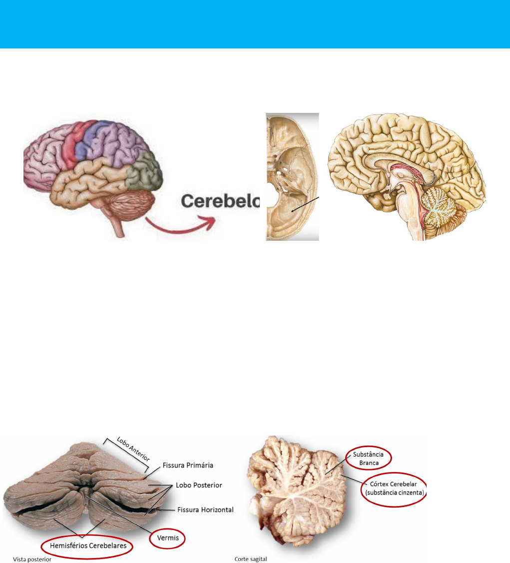 Atividade 6 – Anatomia Humana: Cerebelo e vias cerebelares Maria Laura Gonçalves Vieira – T XIV Cerebelo Localização: parte posterior do encéfalo Sintopia: · Inferior ao lobo occipital · Póstero-inferior ao mesencéfalo · Infratentorial · Póstero-superior ao bulbo Funções: · Manutenção do equilíbrio e da postura. · Controle do tônus muscular. · Controle dos movimentos voluntários. · Aprendizagem motora. · Funções cognitivas específicas. Estruturas anatômicas Vermes do cerebelo: união dos dois hemisférios cerebelares (direito e esquerdo) Lobo anterior (paleocerebelo): centro de tratamento de informação proprioceptiva (regula tônus muscular e postura). Lobo posterior (caudal): responsável pela coordenação de movimentos finos e cognição. Lobo flóculonodular (arquicerebelo): equilíbrio e movimento ocular. É formado pelo nódulo e flóculo Fissuras do cerebelo: · Primária: separa lobo anterior do posterior · Póstero-lateral: separa lobo posterior do lobo floculonodular Pedúnculos cerebelares (face inferior): liga o cerebelo ao tronco encefálico · Pedúnculo superior: função predominantemente eferente (liga ao mesencéfalo) · Pedúnculos médio e inferior: função aferente e eferente (médio liga à ponte e o inferior liga ao bulbo) Núcleos centrais do cerebelo: · Núcleo fastigial: recebem informações aferentes e projetam informações eferentes · Núcleos interpósito e denteado: projetam informações eferentes (interpósito = emboliforma e globoso) Face superior: Face inferior: Lesões no cerebelo Ataxia (alteração de equilíbrio na marcha). Assinergia (incapacidade de coordenação motora exata). Hipotonia (diminuição do tônus muscular). Dismetria (perda do controle velocidade e distância – teste dedo nariz). Disdiadococinesia (perde a capacidade de fazer movimentos rítmicos e alternados – alternância das mãos). Vias cerebelares Conexões aferentes do cerebelo Fibras aferentes de origem vestibular – via vestibulocerebelar Fibras aferente de origem medular – via espinocerebelar Fibras aferente de origem pontina – via pontinocerebelar ou cerebrocerebelar Vias vestibulocerebelar Integração do equilíbrio e controle da posição cabeça e olho Cóclea núcleos vestibulares da ponte flóculo Via espinocerebelar Informações dos músculos e articulações dos membros superiores, inferiores e tronco. Coordenação do movimento e na manutenção da postura (propriocepção). Via espinocerebelar anterior Informação dos músculos e articulações dos membros superiores e inferiores (propriocepção inconsciente). Ex: fechar os olhos e pensar na posição do joelho Informação cruzada. Substância cinzenta intermédia (lombar e sacral) tronco encefálico (mesencéfalo) pedúnculo cerebelar superior Via espinocerebelar posterior Informação dos músculos e articulações dos membros inferiores e tronco (propriocepção inconsciente). Ex: fechar os olhos e pensar na posição do joelho Informação homolateral Coluna intermédia do corno posterior (torácicos) tronco encefálico (mesencéfalo) pedúnculo cerebelar inferior Via pontinocerebelar ou cerebrocerebelar Envolvidas no controle dos movimentos (planejamento e organização motora) Córtex pré-motor e motor suplementar (lobo frontal) núcleos pontinhos pedúnculo cerebelar médio Conexões eferentes do cerebelo Vias eferentes da zona medial Controle da musculatura axial e proximal dos membros Via espinocerebelar e vestibulocerebelar chegam até a zona medial núcleos fastigiais e vestibular medula espinal Vias eferentes da zona intermédia Controla a atividade motora homolateral Via espinocerebelar chega até a zona intermédia núcleos emboliforme e globoso tálamo e formação reticular córtex motor Vias eferentes da zona lateral Controla a atividade motor homolateral Via cerebrocerebelar chega até a zona lateral núcleo denteado tálamo córtex motor