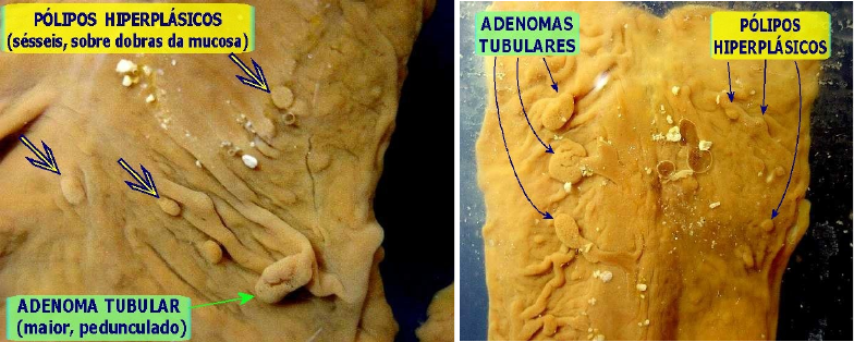 Pólipos Gástricos Os pólipos, nódulos ou massas que se projetam acima do nível da mucosa circundante, são identificados em até 5% das endoscopias do trato gastrointestinal superior. Os pólipos podem se desenvolver como resultado de hiperplasia de células epiteliais e estromais, inflamação, ectopia ou neoplasia. Pólipos Inflamatórios e Hiperplásicos Aproximadamente 75% de todos os pólipos gástricos são pólipos inflamatórios ou hiperplásicos. Mais comumente, eles acometem pessoas entre 50-60 anos de idade, geralmente provenientes de um fundo de gastrite crônica que inicia a lesão e a hiperplasia reativa que causa o crescimento do pólipo. Se associados a gastrite por H. pylori, os pólipos podem regredir após erradicação da bactéria. MORFOLOGIA No estômago, pólipos inflamatórios e hiperplásicos são essencialmente a mesma entidade, com a distinção baseada unicamente no grau de inflamação. Os pólipos frequentemente são múltiplos e caracteristicamente de forma ovoide, menores do que 1 cm de diâmetro, cobertos por uma superfície lisa. Ao exame microscópico, os pólipos têm glândulas foveolares irregulares, cisticamente dilatadas e alongadas. A lâmina própria é tipicamente edematosa, com graus variáveis de inflamação aguda e crônica, e erosões superficiais podem estar presentes. A frequência com que a displasia, uma lesão pré-cancerosa in situ, desenvolve-se em pólipos inflamatórios ou hiperplásicos correlaciona-se com o tamanho; há aumento significativo do risco em pólipos maiores que 1,5 cm. Pólipos Intestinais Pólipos Hiperplásicos Os pólipos hiperplásicos colônicos são proliferações epiteliais comuns tipicamente descobertos na sexta e sétima décadas de vida. A patogenia dos pólipos hiperplásicos não é completamente compreendida, mas acredita-se que a formação dessas lesões resulta de redução do turnover de células epiteliais e do atraso na eliminação de células epiteliais de superfície, levando a um “amontoado” de células caliciformes. Embora essas lesões não tenham potencial maligno, elas devem ser distinguidas dos adenomas sésseis serrilhados, lesões histologicamente semelhantes que têm potencial de malignidade, como descrito adiante. MORFOLOGIA Os pólipos hiperplásicos são mais comumente encontrados no cólon esquerdo e, normalmente, têm menos de 5 mm de diâmetro. Eles são protrusões nodulares lisas da mucosa, frequentemente sobre as cristas das pregas da mucosa. Podem ocorrer isoladamente, mas mais frequentemente são múltiplos, em particular no cólon sigmoide e reto. Histologicamente, os pólipos hiperplásicos são compostos de células caliciformes e absortivas maduras. A eliminação tardia dessas células leva à aglomeração que cria a arquitetura de superfície serrilhada, que é a marca morfológica dessas lesões (Fig. 14-32). Pólipos Hamartomatosos Os pólipos hamartomatosos ocorrem esporadicamente e como componentes de várias síndromes geneticamente determinadas ou adquiridas (Tabela 14-6). Como descrito anteriormente, hamartomas são crescimentos desorganizados, semelhantes a tumores compostos de tipos de células maduras normalmente presentes no local em que o pólipo se desenvolve. Síndromes de polipose hamartomatosa são raras, mas importantes para serem reconhecidas devido a manifestações intestinais e extraintestinais associadas e a necessidade de triar os membros da família. Pólipos Juvenis Os pólipos juvenis são o tipo mais comum de pólipos hamartomatosos. Eles podem ser esporádicos ou sindrômicos. Em adultos, a forma esporádica por vezes é também chamada de pólipo inflamatório, particularmente quando infiltrados inflamatórios densos estão presentes. A grande maioria dos pólipos juvenis ocorre em crianças com menos de cinco anos de idade. Os pólipos juvenis são caracteristicamente localizados no reto, e a maioria se manifesta com sangramento retal. Em alguns casos, o prolapso ocorre e o pólipo sobressai através do esfíncter anal. Os pólipos juvenis esporádicos são geralmente solitários, mas em pessoas com a síndrome autossômica dominante de polipose juvenil o número varia de três até cerca de 100. Ocorre displasia em pequena proporção de pólipos juvenis (a maior parte associada à síndrome), e a síndrome de polipose juvenil está associada a um risco aumentado de desenvolvimento de adenocarcinoma do cólon. MORFOLOGIA Pólipos juvenis esporádicos e sindrômicos isolados são muitas vezes indistinguíveis. Eles geralmente são lesões pedunculadas, de superfície lisa, avermelhadas, que têm menos de 3 cm de diâmetro e exibem espaços císticos típicos em cortes. O exame microscópico mostra os espaços que são glândulas dilatadas preenchidos com mucina e detritos inflamatórios (Fig. 14-31, A). Alguns dados sugerem que a hiperplasia da mucosa é o evento inicial no desenvolvimento de pólipo, e esse mecanismo é compatível com a descoberta de que as mutações nas vias que regulam o crescimento celular, como sinalização do fator de crescimento transformador b (TGF-b), estão associados à polipose juvenil dominante autossômica. Síndrome de Peutz-Jeghers A síndrome de Peutz-Jeghers é um transtorno autossômico dominante raro definido pela presença de múltiplos pólipos hamartomatosos gastrointestinais e hiperpigmentação mucocutânea que carrega risco aumentado de várias neoplasias malignas, como cânceres de cólon, pâncreas, mama, pulmão, ovários, útero e testículos, bem como outras neoplasias incomuns. Mutações heterozigóticas de perda de função na linha germinativa estão presentes em cerca de metade dos pacientes com a forma familiar da síndrome de Peutz-Jeghers, bem como um subconjunto de pacientes com a forma esporádica. Os pólipos intestinais são mais comuns no intestino delgado, embora também possam ocorrer no estômago e cólon, e raramente na bexiga e pulmões. Na avaliação macroscó