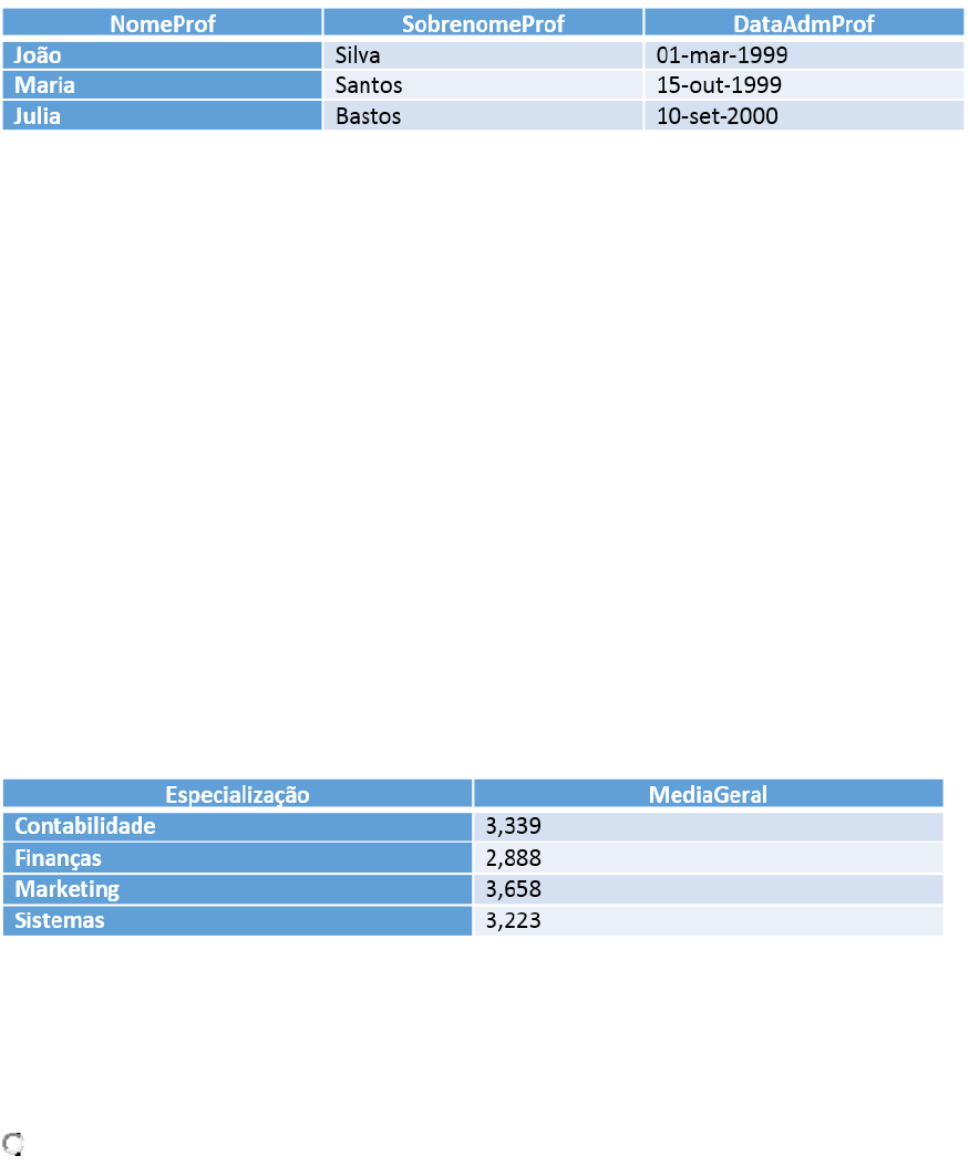 Quando da utilização da instrução SELECT para consultas em banco de dados, podemos utilizar vários argumentos de sintaxe para compor e estruturar a consulta das informações as quais são necessárias. Um destes argumentos é o BETWEEN-AND, um operador de atalho para testar uma coluna de data ou numérica em relação a uma gama de valores. Aponte qual das opções a seguir contém a sintaxe SQL correta para a "saída" conforme a figura abaixo, onde o objetivo é listar o Nome e a Data de contratação dos professores, contratados entre 1999 e 2000. A. SELECT NomeProf, SobrenomeProf, DataAdmProf FROM Professor WHERE DataAdmProf BETWEEN #1/1/1999# AND #31/12/2000# Por que esta resposta é a correta? Esta opção trata exatamente a sintaxe SQL conforme a necessidade de consulta expressa no enunciado da questão. 2. O argumento GROUP BY pode ser utilizado junto à instrução SELECT para consultas em banco de dados quando se deseja agrupar informações a partir de determinadas colunas. Aponte qual das opções a seguir contém a sintaxe SQL correta para a "saída" conforme a figura abaixo, onde o objetivo é consultar a média geral de notas dos estudantes, agrupados por especialização. B. SELECT Especialização, AVG(MediaAluno) AS MediaGeral FROM Aluno GROUP BY Especialização Por que esta resposta é a correta? Esta opção trata exatamente da sintaxe SQL conforme a necessidade de consulta expressa no enunciado da questão. 3. O argumento GROUP BY pode ser utilizado junto a instrução SELECT para consultas em banco de dados; junto a este argumento, podemos utilizar também a instrução HAVING, que serve para aplicar uma determinada condição de seleção junto aos registros agrupados. Aponte qual das opções a seguir contém a sintaxe SQL correta para a "saída" conforme a figura abaixo, onde o objetivo é consultar a quantidade e o valor das faturas de cada conveniada, porém, somente quando o valor da fatura for superior a 30.000. C. SELECT cod_conveniada, count (num_fatura), sum(vlr_fatura) FROM Fatura GROUP BY cod_conveniada HAVING sum (vlr_fatura) > 30000 Por que esta resposta é a correta? Esta opção trata exatamente da sintaxe SQL conforme a necessidade de consulta expressa no enunciado da questão. 4. Quando da utilização da instrução SELECT para consultas em banco de dados, podemos utilizar vários argumentos de sintaxe para compor e estruturar a consulta das informações as quais são necessárias. Um destes argumentos é o NULL (IS NULL ou IS NOT NULL) que é utilizado para consultar valores nulos ou não nulos. Aponte qual das opções a seguir contém a sintaxe SQL correta para a "saída" conforme a figura abaixo, onde o objetivo é consultar o código (num_pessoa_pf) das pessoas cujo estado civil NÃO foi cadastrado (nulo). D. SELECT num_pessoa_pf FROM pessoa_fisica WHERE cod_estado_civil IS NULL Por que esta resposta é a correta? Esta opção trata exatamente da sintaxe SQL conforme a necessidade de consulta expressa no enunciado da questão. 5. Quando utilizamos a instrução SELECT para consultas em banco de dados, podemos utilizar também os argumentos de sintaxe MIN (mínimo), MAX (máximo) e AVG (média). Aponte qual das opções a seguir contém a sintaxe SQL correta para a "saída" conforme a figura abaixo, onde o objetivo é consultar a fatura com maior valor, a fatura com menor valor e o valor médio entre todas as faturas .