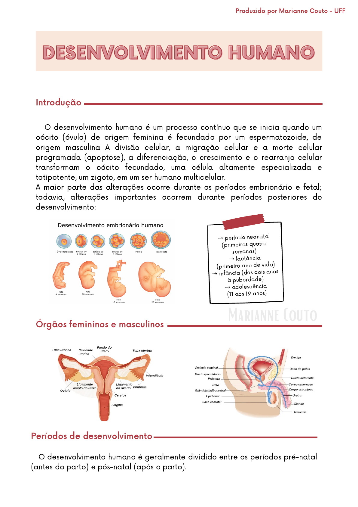 Introdução Períodos de desenvolvimento O desenvolvimento humano é um processo contínuo que se inicia quando um oócito (óvulo) de origem feminina é fecundado por um espermatozoide, de origem masculina A divisão celular, a migração celular e a morte celular programada (apoptose), a diferenciação, o crescimento e o rearranjo celular transformam o oócito fecundado, uma célula altamente especializada e totipotente, um zigoto, em um ser humano multicelular. A maior parte das alterações ocorre durante os períodos embrionário e fetal; todavia, alterações importantes ocorrem durante períodos posteriores do desenvolvimento: → período neonatal (primeiras quatro semanas) → lactância (primeiro ano de vida) → infância (dos dois anos à puberdade) → adolescência (11 aos 19 anos) O desenvolvimento humano é geralmente dividido entre os períodos pré-natal (antes do parto) e pós-natal (após o parto). DESENVOLVIMENTO HUMANODESENVOLVIMENTO HUMANO Órgãos femininos e masculinos Marianne Couto Produzido por Marianne Couto - UFF Estágios do Desenvolvimento Embrionário Período pré-natal O estágio um começa na fecundação e o desenvolvimento embrionário termina no estágio 23, que ocorre no 56° dia. Os períodos mais críticos de desenvolvimento ocorrem durante o primeiro trimestre (13 semanas), quando o desenvolvimento embrionário e o desenvolvimento fetal inicial estão ocorrendo. IMPORTANTE → Um trimestre é um período de três meses. → Um terço do período de nove meses da gestação O desenvolvimento pré-natal humano extende-se por 40 semanas após a Fertilização, dentro das quais, as primeiras 08 semanas são caracterizadas por intensas alterações morfológicas do embrião. Período pós-natal O período pós-natal é definido como as primeiras seis semanas após o parto. Pré-natal Pós-natal Marianne Couto Produzido por Marianne Couto - UFF Infância Puberdade Esse é o período de vida extrauterina entre o primeiro ano de vida e a puberdade. Os dentes primários (decíduos) continuam a surgir, sendo posteriormente substituídos por dentes secundários (permanentes). Durante o início da infância, ocorre uma ossificação ativa (formação dos ossos), mas à medida que a criança fica mais velha, a taxa de crescimento corporal desacelera. Imediatamente antes da puberdade, contudo, o crescimento se acelera – o estirão de crescimento pré-puberal. Este é o período no qual os seres humanos se tornam funcionalmente capazes de procriar (reprodução). A reprodução é o processo pelo qual o organismo produz a prole. No sexo feminino, os primeiros sinais de puberdade podem ocorrer após a idade de oito anos; no sexo masculino, a puberdade comumente se inicia na idade de nove anos. Período pós-natal A obtenção do crescimento completo e da maturidade geralmente é atingida entre as idades de 18 e 21 anos. A ossificação e o crescimento estão virtualmente completos durante o início da idade adulta (21 a 25 anos). Período lactância Esse é o período de vida extrauterina que ocorre, aproximadamente, durante o primeiro ano após o nascimento. É nessa fase que o bebê entra na fase do desenvolvimento de habilidades cognitivas e percepções do mundo. O leite materno é tão importante, que é o único alimento necessário à vida do bebê pelos próximos seis meses Marianne Couto Produzido por Marianne Couto - UFF