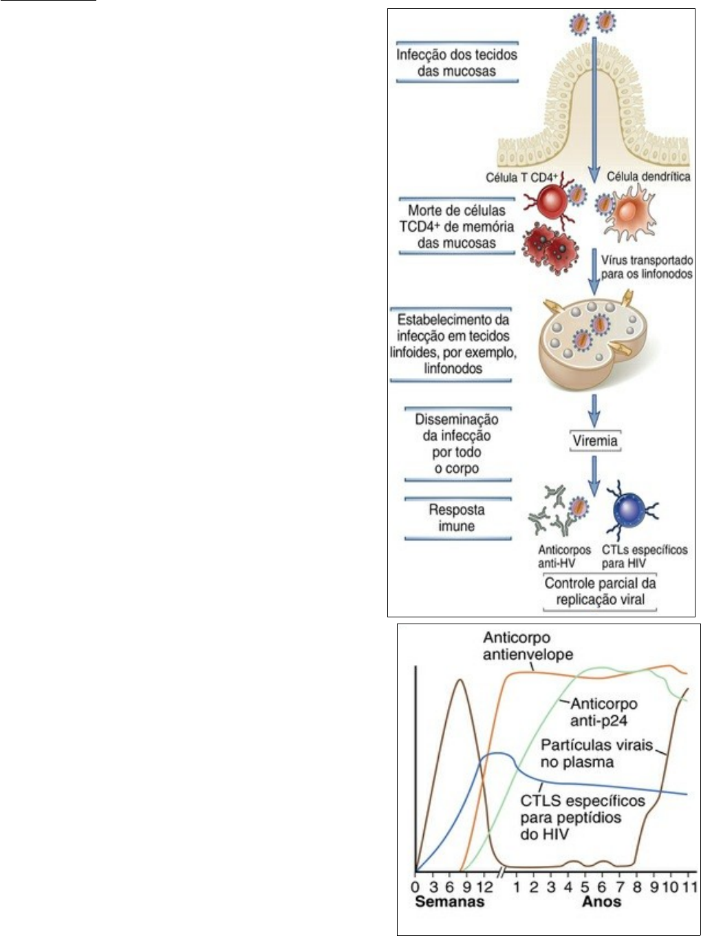 PATOGÊNESE DA INFECÇÃO PELO HIV E AIDS Fase Aguda: O vírus penetra os epitélios da mucosa, que é o principal reservatório de células T. A partir dessa infecção inicial, há uma queda considerável no n° de linfócitos e cerca de 2 semanas após a infecção, uma grande fração dos TCD4+ infectadas pode estar destruída.7 As células dendríticas do epitélio local expressam uma proteína com um domínio de lectina ligante de manose (DC-SIGN) que é responsável por se ligar no envelope do HIV e transportar o vírus para dentro dos linfonodos. No interior dos linfonodos ocorre a transmissão viral pelo contato direto célula-célula, seguida de um aumento na replicação viral. Com o aumento do número de partículas do HIV ocorre a viremia, a qual é importante para a disseminação da infecção por todo o corpo e vai ser acompanhada pela presença de uma Síndrome aguda do HIV (sinais e sintomas inespecíficos). Nesse momento o sistema imune ainda é capaz de combater essa infecção, de forma celular e humoral, ou seja, vai haver ação de CTLs específicos para o HIV e a produção de anticorpos anti-HIV. Dessa forma, a [ ] viral vai cair para níveis muito baixos após a 12° semana da infecção. Fase crônica: Nessa fase tem o Período de Latência Clínica no qual o sistema imune ainda consegue combater a maioria das infecções e não se observa nenhum sinal ou sintoma da infecção pelo HIV. Apesar disso, no interior do baço e dos linfonodos há uma constante replicação viral e um contínuo declínio no número de células TCD4+, estima-se que o HIV destrua certa de 1-2x109 por dia, mas consegue substituir quase tão rapidamente quando elas são destruídas. Com o passar dos anos, o o ciclo contínuo de infecção pelo vírus, morte de células T e nova infecção leva a uma perda considerável de células T CD4 + dos tecidos linfoides e circulantes.
