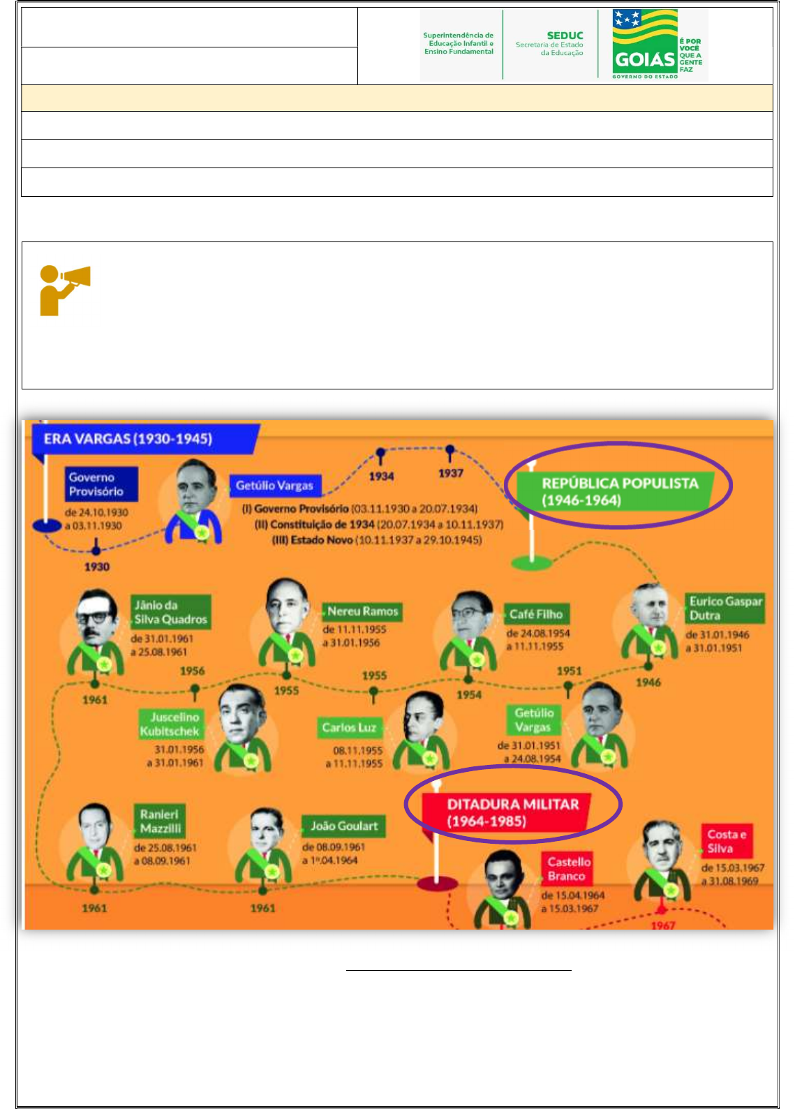 ATIVIDADES Brasil de 1946 a 1964, foi conhecido como a Quarta República Brasileira e foi um período que também ficou conhecido por ter sido um período de democracia liberal, República Populista, Governo Populista, Regime Liberal Populista. A Quarta República, no entanto, ficou marcada por disputas políticas que abalaram as estruturas da democracia do país, tendo como resultado o Golpe de 1964. Na figura abaixo temos uma linha histórica de todos os governos que conduziram o Brasil durante este período, bem como os governos e o momento que antecede e que sucede este período. Disponível em: https://www.politize.com.br/presidentes-do-brasil/> acesso em 21 de ago. de 2020 [adaptada] O REGIME LIBERAL POPULISTA - (QUARTA REPÚBLICA-1946 A 1964) Em 1945, a queda de Getúlio Vargas foi seguida pela reestruturação do regime democrático no Brasil. Naquele mesmo ano, os cidadãos brasileiros voltaram às urnas para escolherem o seu próximo presidente. No entanto, as grandes transformações sociais e econômicas vividas na América Latina, a partir da década de 9º ANO HISTÓRIA ATIVIDADE 12 Tema: O Brasil da era JK e o ideal de uma nação moderna. NOME: UNIDADE ESCOLAR: 1930, trouxeram à tona uma diversidade de movimentos políticos e ideologias que ocasionaram maiores tensões ao cenário político brasileiro. O nacionalismo, os partidos comunistas, os grupos liberais fizeram do jogo político nacional uma delicada teia de interesses e alianças. Ao mesmo tempo, os processos de industrialização e urbanização fizeram com que os centros de disputa pelo poder saíssem das mãos das antigas e conservadoras elites agrárias e se “despedaçasse” entre profissionais liberais, operários, militares, funcionários públicos..., no entanto, essa pluralidade de grupos e ideologias viveu ao lado de lideranças políticas arrebatadoras. Foi nesse momento que alguns políticos buscaram o apoio dos diferentes setores de uma sociedade em pleno processo de modernização. O carisma, os discursos melodramáticos e o uso da propaganda massiva produziram ícones da política que, ainda hoje, inspiram os hábitos e comportamentos das lideranças políticas. Os estudiosos dessa época definiram tal período histórico como o auge do populismo no Brasil. Sob o aspecto teórico, o governante populista fundamentava seu discurso em projetos de inclusão social que, em sua aparência, legitimavam a crença na construção de uma nação promissora. Definindo seus aliados como imprescindíveis ao progresso nacional, o populismo saudava valores e ideias que colocavam o “grande líder” como porta-voz das massas. Suas ações não mais demonstravam sua natureza individual, mas transformavam-no em “homem do progresso”, “defensor da nação” ou “representante do povo”. Construía-se a imagem do indivíduo que desaparecia em prol de causas coletivas. O primeiro líder populista a ter grande destaque no Brasil foi Getúlio Vargas (1930 – 1945/ 1951 – 1954) que, por meio de amplas alianças e o controle dos meios de comunicação, se transformou em uma grande unanimidade política. Seu discurso nacionalista e a concentração de poderes políticos lhe ofereceram uma longa carreira presidencial. Como exemplo da pluralidade de ideias desse período, podemos notar que Vargas conseguia, ao mesmo tempo, ser considerado o “pai dos pobres” e a “mãe dos ricos”. Esses slogans expressavam com clareza como o apelo popular tornou-se instrumento indispensável para construção de uma promissora carreira política. Jânio Quadros (1961), durante sua campanha presidencial, abraçava desconhecidos e comia com seus eleitores. Chegando ao poder elegeu a vassoura como símbolo de um governo que “varreria” a corrupção do país. Suas medidas oficiais causavam muita polêmica. Moralista, Jânio Quadros proibiu as rinhas de galo e o uso de biquíni em desfiles de moda. Ao renunciar, alegou a presença de “forças terríveis” que ameaçaram seu mandato. Outro famoso governo populista foi o de Juscelino Kubitschek (1956 – 1961). Prometendo realizar “cinquenta anos de progresso em cinco anos de governo”, JK ficou afamado pela construção de um país moderno. Abrindo portas para as indústrias multinacionais estrangeiras, elevou o padrão de consumo e conforto das populações urbanas com a introdução de aparelhos eletrodomésticos e dos primeiros carros populares. Além disso, o ousado e dispendioso projeto de construção da nova capital, Brasília, fez com que o empreendedorismo fosse a marca maior de sua administração. Mesmo dando a ideia de que os líderes populistas fossem “irresistíveis” não podemos deixar de dizer que certos grupos políticos também fizeram forte oposição a esses líderes nacionais. O crescimento populacional brasileiro e a abertura dos novos desafios conviviam com a polarização da política internacional, que dividiu as nações do mundo entre o capitalismo e o comunismo. Desta forma, grupos ultraconservadores e setores de esquerda encontravam-se em pontos longínquos do cenário conciliador do fenômeno populista brasileiro. Jânio Quadros em meio os eleitores: uma prática comum dos governantes populistas. Getúlio Vargas (de óculos escuros) e Juscelino Kubistchek (no canto direito) foram dois dos maiores nomes da política brasileira da Quarta República. “Comunas” e “reaças” eram representantes de uma tensão política que colocou, nesse mesmo período, a democracia em xeque. A ascensão da Revolução Cubana, em 1959, trouxe medo e esperança a diferentes grupos da nossa sociedade. Ao mesmo tempo, grupos militares instituíram a urgência de uma intervenção política que impedisse a formação de um governo socialista no Brasil. Viveu-se em uma economia que sabia muito bem promover a prosperidade e aumentar a miséria. Foi nesse momento que, durante o Governo de João Goulart (1961 – 1964), os movimentos pró e antirrevolucion