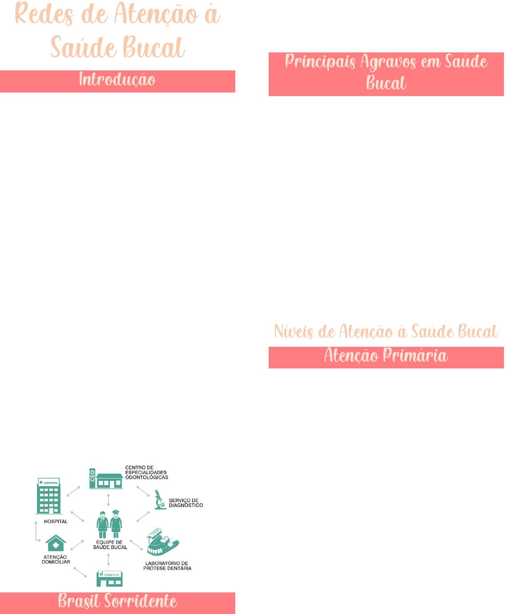 → Arranjos organizativos de ações e serviços de saúde, de diferentes densidades tecnológicas, que integradas por meio de sistemas de apoio técnico, logístico e de gestão, buscam garantir a integralidade do cuidado; → Nas RAS, a concepção de hierarquia é substituída pela de poliarquia e o sistema organiza- se sob a forma de uma rede horizontal de atenção à saúde; → Na Rede de Atenção à Saúde Bucal, definem-se como pontos de Atenção Especializada Ambulatorial e Hospitalar, respectivamente, os Centros de Especialidades Odontológicas (CEO) e os hospitais que realizam atendimento odontológico sob anestesia geral e tratamento do câncer de boca; → A rede pode ter organização local, distrital, municipal ou regional e ser composta por Unidades Básicas de Saúde (UBS), Centros de Especialidades Odontológicas (CEO), Centros de Apoio Diagnóstico (CAD), Laboratórios Regionais de Prótese Dentária (LRPD), Unidades de Pronto Atendimento (UPA), farmácias e hospitais de referência; → Fortalecimento da Saúde Bucal na Atenção Primária; → Ampliou a rede assistencial de Saúde Bucal; → Implantação de novos serviços; → Reorientou o modelo assistencial; → Níveis de atenção; → Fortalecimento de ações multidisciplinares, multiprofissionais e intersetoriais. → Cárie Dentária; → Doença Periodontal; → Edentulismo; → Maloclusão; → Câncer de Boca; → Fluorose Dentária; → Traumatismos Dentoalveolares. Outras patologias também são monitoradas em âmbito mundial e podem ser alvo das equipes de saúde, dependendo das peculiaridades locais. Destacam-se entre elas: erosão dental, alterações bucais relacionadas ao vírus da imunodeficiência humana (HIV) e alterações congênitas. → Equipes multiprofissionais compostas por médicos, enfermeiros, cirurgiões- -dentistas (CD), auxiliar em Saúde Bucal (ASB) e/ou técnico em Saúde Bucal (TSB), auxiliar de Enfermagem ou técnico de Enfermagem e agentes comunitários de saúde (ACS), entre outros profissionais em função da modalidade e da realidade epidemiológica, institucional e das necessidades de saúde da população; Os profissionais de saúde bucal que compõem as equipes de Saúde da Família podem se organizar nas seguintes modalidades: • Modalidade I: dois profissionais: CD + ASB ou TSB. • Modalidade II: três profissionais: CD + TSB + ASB ou TSB. • Modalidade III: profissionais das modalidades I ou II que operam em Unidade Odontológica Móvel. → Sugere-se um fluxo para o acesso do cidadão que é guiado pelos atributos da AB em saúde e estabelece uma visão sistêmica do cuidado, que envolve: integração dos setores e trabalho em equipe; definição de necessidades; resolutividade na AB; e referência aos demais pontos da rede de atenção. 1. Organização do Processo de Trabalho Cada equipe de AB está vinculada a um contingente populacional e a uma região geográfica específica e deve seguir os quatro atributos essenciais preconizados para a Atenção Primária/Básica: primeiro contato, longitudinalidade, integralidade e coordenação. E dois atributos derivados: centralização familiar e orientação comunitária. 2. Planejamento e Organização do Processo de Trabalho da Equipe Baseado na epidemiologia, sugere levantamentos como percentual de crianças livres de cárie. 3. A Equipe de Saúde Bucal e as Atribuições na Atenção Primária 4. Territorialização e População de Referência O reconhecimento do território surge como elemento essencial para o planejamento de ações em saúde e uma ferramenta de gestão que influi no processo saúde- -doença da população e na criação de ambientes saudáveis (Figura 10). Assim, a territorialização, enquanto um dos instrumentos de trabalho da AB, implica processar e sistematizar dados que alimentarão Sistemas de Informação em Saúde. 5. Promover o Acesso a Ações e Serviços em Saúde Bucal 6. Acolher com Identificação de Necessidades Institui um modo de acolher a população e priorizar a clientela de maior vulnerabilidade, busca diminuir as desigualdades, respeitando as necessidades dos diferentes indivíduos ou grupos populacionais. 7. Tipos de Atendimento e Consulta • Demanda espontânea e demanda programada; • Consulta/atendimento de urgência; • Primeira consulta odontológica programada; • Consulta de retorno ou manutenção; • Alta clínica – tratamento concluído; • Atendimento domiciliar 8. Organização de Prontuários É um instrumento de trabalho que garante o registro das informações dos profissionais da saúde e permite, de forma ágil, o acesso às ações realizadas pela equipe de saúde, incluindo a de saúde bucal, além de servir para subsidiar a melhoria da qualidade no cuidado, contribuindo para a realização de diagnóstico precoce. 9. Organização de Agendas A agenda dos profissionais torna-se recurso-chave tanto para garantir a retaguarda para o acolhimento quanto para a continuidade do cuidado. 10. Grupo de Acesso a Saúde Bucal Ele pode constituir-se como uma forma de acesso ao tratamento odontológico ou ser parte integrante do tratamento odontológico para aqueles cidadãos que já se encontram em acompanhamento pela eSB. 11. Classificação das Necessidades de Saúde Bucal Deve ser entendido como instrumento de vigilância e ser utilizado com finalidade para o planejamento e o monitoramento das ações em saúde bucal, subsidiando, fundamentalmente, o acesso ao cuidado de pessoas, famílias e comunidades. 12. Reunião da Equipe Os profissionais de saúde bucal devem participar com os demais profissionais da AB em reuniões periódicas (semanal ou quinzenal). 13. Participação e Controle Social Devem ser estimuladas e apoiadas pela gestão, com a participação de profissionais das equipes, usuários e representantes de movimentos sociais, a formação de conselhos locais de saúde estruturados e vinculados às UBS; a formação de comissões de co