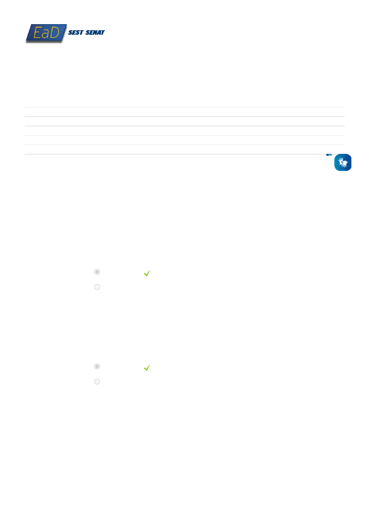 28/07/2021 Avaliação - Módulo 1 https://ead.sestsenat.org.br/ava/mod/quiz/review.php?attempt=2550256&cmid=45 1/4 (/meu-ambiente/) (https://ead.sestsenat.org.br/ava) Meus cursos Pt_br Questão 1 Correto Atingiu 1,00 de 1,00 Questão 2 Correto Atingiu 1,00 de 1,00 Julgue a a�rmativa em verdadeiro ou falso. Redação técnica é redigir com observância a um conjunto de procedimentos, ordens e métodos estabelecidos. Escolha uma opção: a. Verdadeiro b. Falso Julgue a a�rmativa em verdadeiro ou falso. Argumentar é apresentar fatos, ideias, razões lógicas, provas etc. que comprovem uma a�rmação, uma tese. Escolha uma opção: a. Verdadeiro b. Falso Iniciado em quarta, 28 Jul 2021, 23:30 Estado Finalizada Concluída em quarta, 28 Jul 2021, 23:39 Tempo empregado 8 minutos 28 segundos Avaliar 10,00 de um máximo de 10,00(100%) Comentários Parabéns! Você foi aprovado no curso. Para concluir o curso e liberar o seu certi�cado, responda nossa “Avaliação de Reação”. Obrigado. H id e si de ba rs Buscar cursos Caio https://ead.sestsenat.org.br/meu-ambiente/ https://ead.sestsenat.org.br/ava https://ead.sestsenat.org.br/ava/mod/quiz/review.php?attempt=2550256&cmid=45&lang=pt_br 28/07/2021 Avaliação - Módulo 1 https://ead.sestsenat.org.br/ava/mod/quiz/review.php?attempt=2550256&cmid=45 2/4 Questão 3 Correto Atingiu 1,00 de 1,00 Questão 4 Correto Atingiu 1,00 de 1,00 Questão 5 Correto Atingiu 1,00 de 1,00 Questão 6 Correto Atingiu 1,00 de 1,00 Julgue a a�rmativa em verdadeiro ou falso. Comunicação é um processo que envolve a transmissão e recepção de mensagens entre uma fonte emissora e um destinatário receptor, no qual as informações, transmitidas por intermédio de recursos físicos (fala, audição, visão...) ou de aparelhos ou dispositivos técnicos, são codi�cadas na fonte e decodi�cadas no destino com o uso de sistemas convencionados de signos ou símbolos sonoros, escritos, iconográ�cos, gestuais etc. Escolha uma opção: a. Verdadeiro b. Falso Julgue a a�rmativa em verdadeiro ou falso. Leitura exploratória é quando, com base no texto, concebemos nossas próprias ideias. Escolha uma opção: a. Falso b. Verdadeiro Julgue a a�rmativa em verdadeiro ou falso. Axiomas são verdades inquestionáveis, universalmente válidas, muitas vezes utilizadas como princípios na construção de uma teoria ou como base para uma argumentação. Escolha uma opção: a. Verdadeiro b. Falso Julgue a a�rmativa em verdadeiro ou falso. Clareza, concisão e correção são as qualidades indispensáveis a qualquer texto técnico. Escolha uma opção: a. Falso b. Verdadeiro H id e si de ba rs 28/07/2021 Avaliação - Módulo 1 https://ead.sestsenat.org.br/ava/mod/quiz/review.php?attempt=2550256&cmid=45 3/4 Questão 7 Correto Atingiu 1,00 de 1,00 Questão 8 Correto Atingiu 1,00 de 1,00 Questão 9 Correto Atingiu 1,00 de 1,00 Questão 10 Correto Atingiu 1,00 de 1,00 Julgue a a�rmativa em verdadeiro ou falso. Leitura exploratória é quando, com base no texto, concebemos nossas próprias ideias. Escolha uma opção: a. Verdadeiro b. Falso Julgue a a�rmativa em verdadeiro ou falso. Axiomas são verdades inquestionáveis, universalmente válidas, muitas vezes utilizadas como princípios na construção de uma teoria ou como base para uma argumentação. Escolha uma opção: a. Falso b. Verdadeiro Julgue a a�rmativa em verdadeiro ou falso. Clareza é adotar a norma culta de linguagem, com sua correção gramatical, como instrumento geral de comunicação, de forma a estabelecer um padrão único de linguagem diante da diversidade decorrente de fatores individuais, sociais, temporais e geográ�cos. Escolha uma opção: a. Falso b. Verdadeiro Julgue a a�rmativa em verdadeiro ou falso. Argumentar é apresentar fatos, ideias, razões lógicas, provas etc. que comprovem uma a�rmação, uma tese. Escolha uma opção: a. Falso b. Verdadeiro ◄ Aula Interativa - Módulo 1 (https://ead.sestsenat.org.br/ava/mod/scorm/view.php?id=44&forceview=1) Seguir para... H id e si de ba rs https://ead.sestsenat.org.br/ava/mod/scorm/view.php?id=44&forceview=1 28/07/2021 Avaliação - Módulo 1 https://ead.sestsenat.org.br/ava/mod/quiz/review.php?attempt=2550256&cmid=45 4/4 Apostila - Módulo 2 ► (https://ead.sestsenat.org.br/ava/mod/resource/view.php?id=72&forceview=1) Copyright © EaD SEST SENAT. Todos os direitos reservados. H id e si de ba rs https://ead.sestsenat.org.br/ava/mod/resource/view.php?id=72&forceview=1