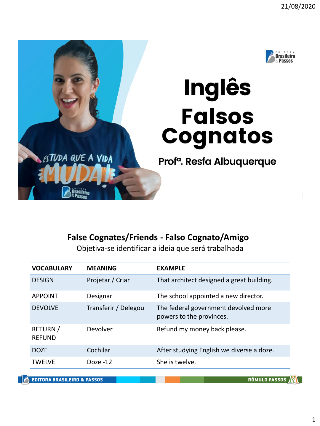21/08/2020 1 VOCABULARY MEANING EXAMPLE DESIGN Projetar / Criar That architect designed a great building. APPOINT Designar The school appointed a new director. DEVOLVE Transferir / Delegou The federal government devolved more powers to the provinces. RETURN / REFUND Devolver Refund my money back please. DOZE Cochilar After studying English we diverse a doze. TWELVE Doze -12 She is twelve. False Cognates/Friends - Falso Cognato/Amigo Objetiva-se identificar a ideia que será trabalhada Natacha Fydryzewski Teixeira - 02763572057 21/08/2020 2 VOCABULARY MEANING EXAMPLE CHEF Chefe de cozinha You became an amazing chef. BOSS /CHIEF Chefe He is my boss. CIGAR Charuto Cigar is not allowed here neither Cigarettes. CIGARETTE Cigarro XXX COMPHREENSIVE Abrangente / Extenso It is a conphreensive subject. UNDERSTANDING Acordo/Compreensivo The politicians finally reached an understanding. False Cognates/Friends - Falso Cognato/Amigo Objetiva-se identificar a ideia que será trabalhada 1. O substantivo PARENTS, por exemplo, caracteriza-se como um cognato verdadeiro para o substantivo parentes. ( ) Certo ( ) Errado Natacha Fydryzewski Teixeira - 02763572057 21/08/2020 3 2. In the excerpt “ensuring that those who come will actually be immersed”, the word “actually” is: a) a false cognate which means “in reality” b) a true cognate which means “at present” c) a false cognate which means “at present” d) a true cognate which means “in reality” 3. What is the best definition for false cognates ? a) Words that don’t exist in a language. b) Antonym words. c) Words that cannot be used in the beginning of texts. d) Words that are alike in language. Natacha Fydryzewski Teixeira - 02763572057 21/08/2020 4 4. All of the words in bold are false cognates. The word that is used INCORRECTLY in the sentences below is: I did not realize until just now that you are actually in a lot of pain. I pretend to take you to the hospital for exams immediately. I promise to assist you in any way possible. I’ll be waiting for you in the cafeteria. a) realize. b) actually. c) pretend. d) assist. e) cafeteria. 5. In the sentence: “She realizes the restrooms actually the name for a public bathroom” the words REALIZES and ACTUALLY mean, respectively: a) realiza / atualmente. b) entende / atualmente. c) percebe / na verdade. d) realiza / realmente e) percebe / na atualidade. Natacha Fydryzewski Teixeira - 02763572057 21/08/2020 5 6. Choose the alternative in which the bold word is not classified as a false cognate. a) The university welcomes applications from foreign students. b) Many scientific studies intend to prove that there is life on other planets. c) We realized that he was a bad boy. d) The new scientists should learn how to accept criticism. e) Our team apologizes for making such a huge mistake. 7. The sentence(s) in which the underlined word is a false cognate is(are) I. The team of astronauts had the potential to execute the experiments. II. The university library will be closed until the end of the week. III. The results of the experiments are different. a) II, only. b) I and II, only. c) III, only. d) I and III, only. e) I, II and III. Natacha Fydryzewski Teixeira - 02763572057 21/08/2020 6 8. Escolha a alternativa onde o Falso Cognato em negrito, representa a melhor tradução para a sentença: There is a very exquisite car parked outside. a) extremely dangerous. b) extremely old. c) extremely strange. d) extremely beautiful. He`d better resume the LECTURE É melhor ele recomeçar a conferência. You`ll find LECTURES selected Você encontrará palestras selecionadas. I WONDER if I’ll be home by the time the game starts Me pergunto se estarei em casa na hora em que o jogo começar This girl is a WONDER. She’s always surprising me with her talents Essa garota é uma maravilha. Ela está sempre me surpreendendo com seus talentos After leaving, please CLOSE the door Ao sair, por favor, feche a porta We need to bring this discussion to a CLOSE Precisamos chegar ao fim dessa discussão Vocabularies/Watch out Natacha Fydryzewski Teixeira - 02763572057 21/08/2020 7 We live CLOSE to each other since we were little kids Nós moramos perto um do outro desde que éramos criancinhas It’s been a long time since I wrote a LETTER Faz muito tempo desde que eu escrevi uma carta My name starts with the LETTER M Meu nome começa com a letra M Vocabularies/Watch out I love eating TURKEY on the day after Christmas. Eu amo comer peru no dia depois do Natal I chose Europe as my next vacation destination. I’ll go to some nice places, like Greece and TURKEY . Escolhi a Europa como próximo destino das férias. Vou para alguns lugares legais, como Grécia e Turquia. I think we became friends fast because we share an INTEREST in astrology. Eu acho que ficamos amigos rapidamente porque compartilhamos um interesse em astrologia I’m saving some money at the bank to see if the INTERESTS are high enough. Estou juntando dinheiro no banco para ver se os juros são altos o suficiente Vocabularies/Watch out Natacha Fydryzewski Teixeira - 02763572057 21/08/2020 8 This is something for the BOARD of directors Isso é algo que compete ao o grupo de diretores Passengers of the flight to Atlanta, it’s time to BOARD! Passageiros do vôo para Atlanta, é hora de embarcar! There’s a LIGHT that never goes out Há uma luz que nunca se apaga There’s a LIGHT that never goes out Há uma luz que nunca se apaga Vocabularies/Watch out I was holding a pile of plates and I dropped it all on the floor. They all BROKE. Eu estava segurando uma pilha de pratos e derrubei tudo no chão. Todos eles quebraram”. We were on a BREAK . Nós estávamos dando um tempo . When I go to Asia, I really want to visit CHINA. Quando eu for para a Ásia, eu realmente quero visitar a China When I go to Asia, I really want to visit CHINA. Quando eu for para a Ásia, eu realmente quero visitar a China The girls won their first MATCH of the season! As gar