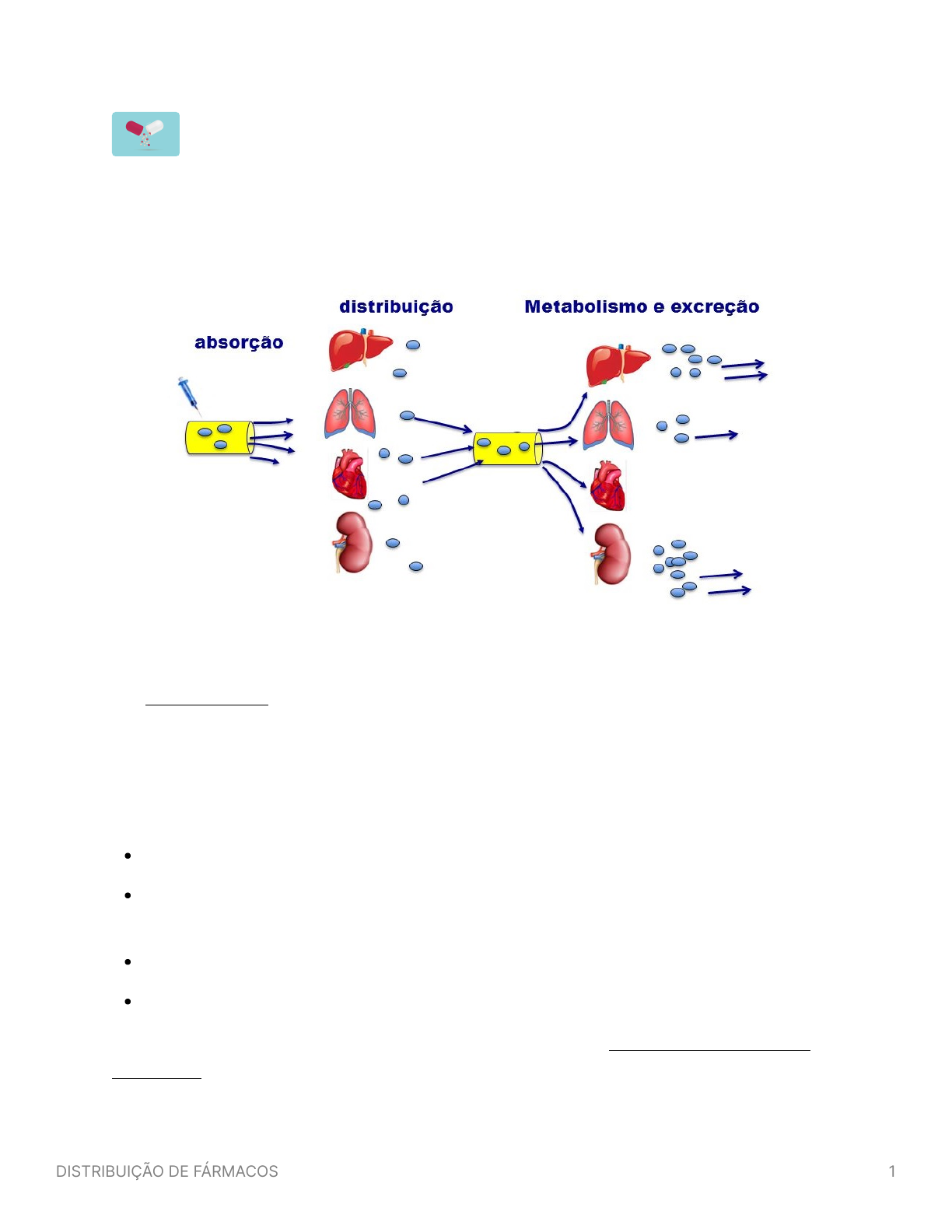 DISTRIBUIÇÃO DE FÁRMACOS 1 DISTRIBUIÇÃO DE FÁRMACOS ↳ A distribuição dos fármacos nada mais é do que a passagem de um xenobiótico (compostos que não não são endógenos, produzidos pelo organismo, mas que frequentemente entramos em contato com eles .: o fármaco é um tipo de xenobiótico) da circulação para os tecidos e o seu local de ação farmacológica ↳ Fatores que interferem Fluxo sanguíneo dos tecidos Permeabilidade do endotélio capilar - BHE e barreira placentária Lipossolubilidade e grau de ionização Ligação à proteínas plasmáticas ↳ O movimento do fármaco existirá até que a equilibração seja atingida entre a concentração plasmática e a concentração DISTRIBUIÇÃO DE FÁRMACOS 2 tissular/tecidual do fármaco não-ligado a proteínas plasmáticas, logo, do plasma livre FLUXO SANGUÍNEO DOS TECIDOS ↳ Dessa forma, órgãos mais irrigados entram em equilíbrio com o plasma mais rapidamente .: a difusão do fármaco para o líquido intersticial ocorre rapidamente, tendo em vista a natureza altamente permeável da membrana dos capilares PERMEABILIDADE DO ENDOTÉLIO CAPILAR ↳ Tal ponto encontra-se intimamente relacionado ao tipo de capilar que compõem cada endotélio DISTRIBUIÇÃO DE FÁRMACOS 3 CONTÍNUO ⤷ Tipo mais comum de capilar ⤷ Possibilita a passagem apenas das moléculas que possuírem diâmetro inferior a 10nm ⤷ Seletividade por gradiente iônico FRENESTRADO ⤷ Apresenta "janelas", que acabam oferecendo uma passagem fácil para grande moléculas cujo tamanho é na ordem de 10- 100nm ⤷ Mais encontrados nos rins, fígado, pâncreas, vesícula biliar, glândulas endócrinas de maneira mais geral BHE - BARREIRA HEMATOENCEFÁLICA ⤷ O cérebro é inacessível para a maioria dos fármacos, uma vez que a BHE (barreira hematoencefálica) possui junções contínuas DISTRIBUIÇÃO DE FÁRMACOS 4 (oclusões e não fenestrações) e capilares recobertos pelos astrócitos e células gliais. ⤷ Fatores como o processo inflamatório podem alterar a permeabilidade de certas substâncias em relação a BHE, uma vez que a inflamação pode romper a integridade da barreira hematoencefálica, possibilitando a passagem de substâncias que em condições normais não atravessariam essa barreira ⤷ Algumas substâncias hidrossolúveis podem atravessar a BH por difusão simples/passiva se obtiverem um pequeno peso molecular, ponto que se efetiva com o álcool e a ureia, por exemplo. ⤷ Algumas outras substâncias também podem atravessar a BHE através de sistemas transportadores, como a glicose por exemplo, pelos famosos GLUT (transportadores de glicose) ⤷ Transportadores : Transportadores de influxo LAT1 → permite a entrada de L- DOPA e gabapentina CNT2 → permite a entrada de nucleotídeos purímicos e purimidínicos Transportadores de efluxo Glicoproteína P (MRD1) → atua na expulsão da doxorubicin, paclitaxel, loperamida, ciclosporina, ..., do sistema nervoso central MRPD → expulsar a fenitoína OAT → expulsar o ácido valpróico DISTRIBUIÇÃO DE FÁRMACOS 5 BARREIRA PLACENTÁRIA ⤷ É importante salientar a permeação em relação a barreira placentária, uma vez que alguns compostos podem causar anomalias no desenvolvimento do feto ⤷ Dessa forma, a lipossolubilidade, a extensão da ligação plasmática e o grau de ionização desses fármacos, serão determinantes no que tangue sua transferência, ou não, à barreira placentária LIPOSSOLUBILIDADE E GRAU DE IONIZAÇÃO ↳ Fator físico-químico do fármaco: Coeficiente de Partição Efetivo (CPE) Esse coeficiente nada mais é do que uma medida quantitativa, fornecendo informações a respeito da polaridade do fármaco, e ditar a distribuição desse fármaco nos diferentes espaços biológicos do organismo [Forma não-ionizada] X Coeficiente de participação lipídeo / água CP = concentração da substância na fase lipídica / concentração da substância na fase aquosa (substâncias bifásicas) Logo, quanto maior o valor do CP, mais lipofílico, logo, maior a distribuição tecidual ⇡ lipossolubilidade do fármaco .: ⇡ a taxa de penetração no SNC DISTRIBUIÇÃO DE FÁRMACOS 6 LIGAÇÃO À PROTEÍNAS PLASMÁTICAS Albumina → liga-se predominantemente a substâncias ácidas α-glicoglobulinas → liga-se predominantemente a substâncias de caráter básico OBS: Alguns fármacos, podem ainda se ligar à proteínas que funcionam como carreadores de hormônios, como o estrogênio, a testosterona, e a tiroxina, por exemplo ↳ Ao se ligar às proteínas plasmáticas, os fármacos vão chegar mais lentamente aos tecidos extra-vasculares, sendo sua distribuição mais lenta ⇡ afinidade do fármaco com as proteínas plasmáticas .: ⇣ distribuição pelos tecidos extra-vasculares .: ⇣ metabolização e eliminação do fármaco .: ⇡ duração de ação do fármaco DISTRIBUIÇÃO DE FÁRMACOS 7 OBS: somente a fração livre dos fármacos é distribuída ↳ Pode haver certa competição entre dois fármacos, ou, entre fármacos e ligantes endógenos (hormônio), pela mesma proteína plasmática A presença do fármaco B aumenta a fração livre do fármaco A, aumentando a distribuição da droga A Hipoalbuminemia (casos de doença hepática ou síndrome nefrótica) → resulta em uma redução da ligação dos fármacos com a albumina .: ⇡ forma livre do fármaco .: ⇡ de efeitos adversos, por exemplo ⇡ α-glicoglobulinas (decorrente de casos de câncer, infarto do miocárdio e artrite, por exemplo) → ⇡ a forma complexada do fármaco com essas proteínas, o que pode acabar retardando o efeito farmacológico IMPORTANTE "É necessário corrigir a dose do fármaco a ser administrado de acordo com o grau de ligação a proteína plasmática" DISTRIBUIÇÃO DE FÁRMACOS 8 ↳ Alguns fármacos se acumulam nos tecidos em concentrações mais altas do que as detectadas nos líquidos extracelulares e no sangue Em geral, a ligação tecidual dos fármacos