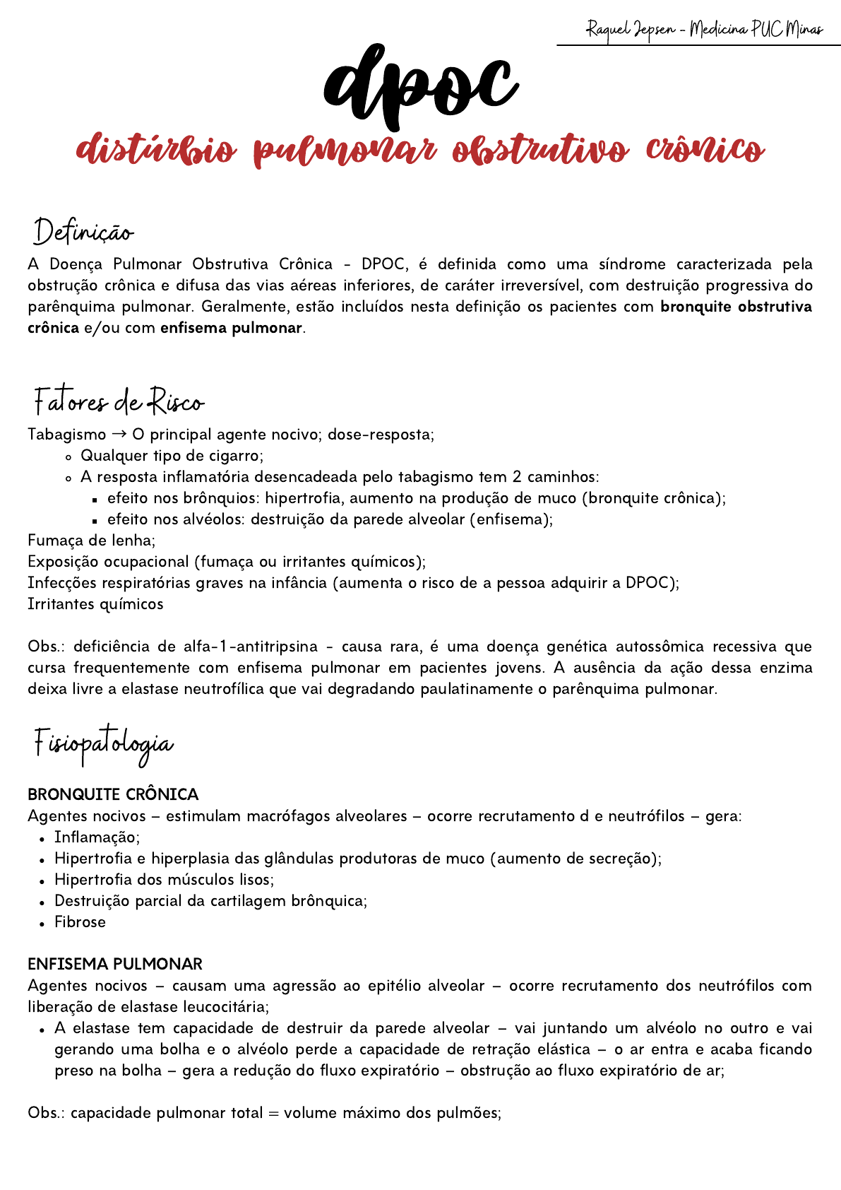 Qualquer tipo de cigarro; A resposta inflamatória desencadeada pelo tabagismo tem 2 caminhos: efeito nos brônquios: hipertrofia, aumento na produção de muco (bronquite crônica); efeito nos alvéolos: destruição da parede alveolar (enfisema); Inflamação; Hipertrofia e hiperplasia das glândulas produtoras de muco (aumento de secreção); Hipertrofia dos músculos lisos; Destruição parcial da cartilagem brônquica; Fibrose A elastase tem capacidade de destruir da parede alveolar – vai juntando um alvéolo no outro e vai gerando uma bolha e o alvéolo perde a capacidade de retração elástica – o ar entra e acaba ficando preso na bolha – gera a redução do fluxo expiratório – obstrução ao fluxo expiratório de ar; A Doença Pulmonar Obstrutiva Crônica - DPOC, é definida como uma síndrome caracterizada pela obstrução crônica e difusa das vias aéreas inferiores, de caráter irreversível, com destruição progressiva do parênquima pulmonar. Geralmente, estão incluídos nesta definição os pacientes com bronquite obstrutiva crônica e/ou com enfisema pulmonar. Tabagismo → O principal agente nocivo; dose-resposta; Fumaça de lenha; Exposição ocupacional (fumaça ou irritantes químicos); Infecções respiratórias graves na infância (aumenta o risco de a pessoa adquirir a DPOC); Irritantes químicos Obs.: deficiência de alfa-1-antitripsina - causa rara, é uma doença genética autossômica recessiva que cursa frequentemente com enfisema pulmonar em pacientes jovens. A ausência da ação dessa enzima deixa livre a elastase neutrofílica que vai degradando paulatinamente o parênquima pulmonar. BRONQUITE CRÔNICA Agentes nocivos – estimulam macrófagos alveolares – ocorre recrutamento d e neutrófilos – gera: ENFISEMA PULMONAR Agentes nocivos – causam uma agressão ao epitélio alveolar – ocorre recrutamento dos neutrófilos com liberação de elastase leucocitária; Obs.: capacidade pulmonar total = volume máximo dos pulmões; dpoc Raquel Jepsen - Medicina PUC Minas Definição Fatores de Risco distúrbio pulmonar obstrutivo crônico Fisiopatologia Por causa do processo inflamatório que o paciente está sofrendo, ocorre uma remodelação vascular com aumento da musculatura lisa medial, fibrose da intima e destruição do leito capilar – que também culmina com aumento da resistência vascular pulmonar; Ocorre um aumento da pressão nas câmaras direitas – pode evoluir com IC – falência do coração direito, quadro conhecido como cor pulmonale; A tosse é produtiva porque tem aumento na produção de muco; Definição arbitraria porque todo mundo começa a doença uma hora (se o paciente vier com a tosse há 1 mês, pode ser DPOC), mas muito usada; Predomina o quadro de dispneia; Enfisematosos (pink puffer) x bronquíticos (blue bloater): já sabemos que não existe mais essa divisão na DPOC, entretanto, pode haver o predomínio de uma das classificações no paciente; Conceito clássico, mas sem aplicabilidade clinica real – não existe um que seja 100% enfisematoso ou bronquítico; Mistura de sintomas Predomínio de um dos padrões é possível; Bronquite = predomina mais a tosse produtiva, muitas vezes acompanhada de pigarro; ou somente o pigarro; Enfisema = chama mais atenção a dispneia. Dispneia; Muitas vezes o paciente não chega dizendo para você que está com falta de ar, porque às vezes ele não percebe – é lento, são anos de evolução. Ele pode vir com limitação progressiva das atividades físicas; Percebida como “cansaço” Tosse crônica; Mais característico do bronquítico; Produção de escarro: tosse, pigarro; A tosse pode ser produtiva, principalmente pela manhã porque a secreção fica acumulando durante a noite e fica mais seca durante o dia; “Ele tem pigarro porque ele fuma, é normal” = não é normal!! Sibilância: sinal de obstrução de via aérea (irreversível ou pode ter um componente de asma) – principalmente expiratório; HIPERTENSÃO PULMONAR O paciente que tem um bloqueio do fluxo expiratório acaba fazendo hipoxemia crônica – gera vasoconstrição arteriolar – causa aumento da resistência vascular pulmonar; Bronquite crônica: tosse produtiva por 3 meses em pelo menos 2 anos consecutivos; Enfisema: termo patológico que descreve algumas mudanças estruturais associadas à DPOC; Asma: componente de broncoespasmo reversível, comum a vários pacientes com DPOC (overlap – sobreposição de DPOC com asma) – também pode fazer parte do quadro; Raquel Jepsen - Medicina PUC Minas Componentes clínicos Manifestações clínicas Respiração com lábios semicerrados; Uso de musculatura acessória; Posição do tripé; Sinais clínicos e radiológicos de síndrome de hiperinsuflação; Sinais de ICC (direita); Baqueteamento digital – pode ter na DPOC , mas não é comum – tem que pesquisar o câncer de pulmão (principal complicação da DPOC), porque ele faz mais baqueteamento digital que a DPOC. Pacientes: Enfisema: retenção de CO2, porque tem um bloqueio ao fluxo de ar expiratório – o bulbo dispara o sinal compensatório para eliminar o CO2 (que é a taquipneia) – fica muito taquipneico, consegue compensar e não faz tanta hipóxia – fica rosado e soprando “pink puffer); Esforço respiratório muito grande: posição de tripé, uso musculatura acessória, emagrecido (dispneia muito intensa, inclusive para comer; consome massa muscular nesse esforço da taquipneia); Bronquite: acumula o CO2, mas por um mecanismo que não se sabe explicar, o bulbo do paciente se torna tolerante ao CO2 e não dispara a resposta compensatória → O paciente faz hipercapenia → e faz hipóxia → fica azul → faz vasoconstricção arteriolar → faz hipertensão pulmonar → pode fazer cor pulmonale – incha (blue bloater) – também pode ter obesidade; Identificação: profissão QP: sintomas (dispneia, sibilo, tosse com pigarro) HDA: Gravidade do distúrbio obstrutivo Frequênci