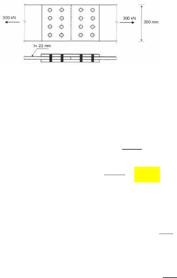 Exemplo 1: Duas chapas 22x300 mm são emendadas por meio de talas com 2x8 parafusos de diâmetro igual a 22 mm. Verifique se as dimensões das chapas são satisfatórias, admitindo-se aço MR250 e combinação normal, considerando a carga oriunda da ocupação. Cálculo da solicitação de projeto: 𝑁𝑑 = 300 ∗ 1,50 = 450 𝑘𝑁 1 – Resistência ao escoamento da seção bruta 𝐴𝑔 = 30 ∗ 2,2 = 66 𝑐𝑚² 𝑅𝑑𝑡 = 𝐴𝑔 ∗ 𝑓𝑦 𝛾𝑎1 𝑅𝑑𝑡 = 66 ∗ 25 1,1 = 1500 𝑘𝑁 2 – Resistência a ruptura da seção líquida 𝑑𝑓 = 2,2 + 0,35 = 2,55 𝑐𝑚 𝐴𝑛 = [𝑏 − ∑(𝑑 + 3,5 𝑚𝑚) + ∑ 𝑠2 4 ∗ 𝑔 ] ∗ 𝑡 𝐴𝑛 = [30 − 4 ∗ (2,55)] ∗ 2,2 = 43,56 𝑐𝑚² 𝐴𝑛 = 𝐴𝑔 + [− ∑(𝑑 + 3,5 𝑚𝑚) + ∑ 𝑠2 4 ∗ 𝑔 ] ∗ 𝑡 𝐴𝑛 = 66 + [−4 ∗ (2,55)] ∗ 2,2 = 43,56 𝑐𝑚² 𝐴𝑛,𝑒𝑓 = 𝐶𝑡 ∗ 𝐴𝑛 𝐴𝑛,𝑒𝑓 = 1 ∗ 43,56 = 43,56 𝑐𝑚² 𝑅𝑑𝑡 = 𝐴𝑛,𝑒𝑓 ∗ 𝑓𝑢 𝛾𝑎2 𝑅𝑑𝑡 = 43,56 ∗ 40 1,35 = 1290,67 𝑘𝑁 A resistência à tração na chapa é de 1290,67 kN, sendo superior a solicitação de 450 kN. Portanto, as dimensões são satisfatórias. Exemplo 2: Duas chapas de 28 cm x 20 mm são emendadas por transpasse, com parafusos de 20 mm, sendo os furos realizados por punção. Calcular o esforço resistente de projeto de tração das chapas, admitindo-as submetidas à tração axial. Aço ASTM A36. 1 – Resistência ao escoamento da seção bruta 𝐴𝑔 = 28 ∗ 2 = 56 𝑐𝑚² 𝑅𝑑𝑡 = 𝐴𝑔 ∗ 𝑓𝑦 𝛾𝑎1 𝑅𝑑𝑡 = 56 ∗ 25 1,1 = 1272,73 𝑘𝑁 2 – Resistência a ruptura da seção líquida 𝑑𝑓 = 2 + 0,35 = 2,35 𝑐𝑚 Caminho 1: 𝐴𝑛 = [𝑏 − ∑(𝑑 + 3,5 𝑚𝑚) + ∑ 𝑠2 4 ∗ 𝑔 ] ∗ 𝑡 𝐴𝑛1 = [28 − 2 ∗ (2,35)] ∗ 2 = 46,6 𝑐𝑚² Caminho 2: 𝐴𝑛 = [𝑏 − ∑(𝑑 + 3,5 𝑚𝑚) + ∑ 𝑠2 4 ∗ 𝑔 ] ∗ 𝑡 𝐴𝑛2 = [28 − 4 ∗ (2,35) + 2 ∗ 7,52 4 ∗ 5 ] ∗ 2 = 48,45 𝑐𝑚² Caminho 3: 𝐴𝑛 = [𝑏 − ∑(𝑑 + 3,5 𝑚𝑚) + ∑ 𝑠2 4 ∗ 𝑔 ] ∗ 𝑡 𝐴𝑛3 = [28 − 5 ∗ (2,35) + 4 ∗ 7,52 4 ∗ 5 ] ∗ 2 = 55 𝑐𝑚² 𝐴𝑛,𝑒𝑓 = 𝐶𝑡 ∗ 𝐴𝑛 𝐴𝑛,𝑒𝑓 = 1 ∗ 46,6 = 46,6 𝑐𝑚² 𝑅𝑑𝑡 = 𝐴𝑛,𝑒𝑓 ∗ 𝑓𝑢 𝛾𝑎2 𝑅𝑑𝑡 = 46,6 ∗ 40 1,35 = 1380,74 𝑘𝑁 A resistência à tração na chapa é de 1272,73 kN. Exemplo 3: Para o perfil U 381 x 50,4 kg/m, em aço AR350, indicado na figura, calcule o esforço resistente à tração da ligação, considerando parafusos comuns de 22 mm de diâmetro. 1 – Resistência ao escoamento da seção bruta 𝐴𝑔 = 64,2 𝑐𝑚² 𝑅𝑑𝑡 = 𝐴𝑔 ∗ 𝑓𝑦 𝛾𝑎1 𝑅𝑑𝑡 = 64,2 ∗ 35 1,1 = 2042,73 𝑘𝑁 2 – Resistência a ruptura da seção líquida 𝑑𝑓 = 2,2 + 0,35 = 2,55 𝑐𝑚 𝐴𝑛 = 𝐴𝑔 + [− ∑(𝑑 + 3,5 𝑚𝑚) + ∑ 𝑠2 4 ∗ 𝑔 ] ∗ 𝑡 𝐴𝑛 = 64,2 + [−4 ∗ (2,55)] ∗ 1,02 = 53,80 𝑐𝑚² 𝐴𝑛,𝑒𝑓 = 𝐶𝑡 ∗ 𝐴𝑛 𝐶𝑡 = 1 − 𝑒 𝑙 ≥ 0,60 𝐶𝑡 = 1 − 2 7,5 = 0,73 𝐴𝑛,𝑒𝑓 = 0,73 ∗ 53,80 = 39,27 𝑐𝑚² 𝑅𝑑𝑡 = 𝐴𝑛,𝑒𝑓 ∗ 𝑓𝑢 𝛾𝑎2 𝑅𝑑𝑡 = 39,27 ∗ 45 1,35 = 1309 𝑘𝑁 3 – Resistência ao cisalhamento do bloco 𝐴𝑔𝑣 = 15 ∗ 1,02 ∗ 2 = 30,6 𝑐𝑚² 𝐴𝑛𝑣 = (15 − 1,5 ∗ (2,55)) ∗ 1,02 ∗ 2 = 22,8 𝑐𝑚² 𝐴𝑛𝑡 = (25,5 − 3 ∗ (2,55)) ∗ 1,02 = 18,21 𝑐𝑚² 𝑅𝑑1 = 1 𝛾𝑎2 ∗ (0,60 ∗ 𝑓𝑢 ∗ 𝐴𝑛𝑣 + 𝐶𝑡𝑠 ∗ 𝑓𝑢 ∗ 𝐴𝑛𝑡) 𝑅𝑑1 = 1 1,35 ∗ (0,60 ∗ 45 ∗ 22,8 + 1 ∗ 45 ∗ 18,21) = 1063 𝑘𝑁 𝑅𝑑2 = 1 𝛾𝑎2 ∗ (0,60 ∗ 𝑓𝑦 ∗ 𝐴𝑔𝑣 + 𝐶𝑡𝑠 ∗ 𝑓𝑢 ∗ 𝐴𝑛𝑡) 𝑅𝑑2 = 1 1,35 ∗ (0,60 ∗ 35 ∗ 30,6 + 1 ∗ 45 ∗ 18,21) = 1083 𝑘𝑁 Resistência para o cisalhamento do bloco é de 1063 kN. 4 – Resistência ao cisalhamento dos conectores 𝑅𝑛𝑣 = 0,42 ∗ 𝐴𝑔 ∗ 𝑓𝑢 𝑅𝑛𝑣 = 0,42 ∗ (𝜋 ∗ 2,22 4 ) ∗ 41,5 = 66,26 𝑘𝑁 𝑅𝑑𝑡 = 66,26 ∗ 8 1,35 = 392,65 𝑘𝑁 5 – Resistência ao rasgamento e pressão de apoio 𝑑′ = 2,2 + 0,15 = 2,35 𝑐𝑚 Parafusos externos 𝑎1 = 7,5 − 2,35 2 = 6,325 𝑐𝑚 2 ∗ 𝑑 = 2 ∗ 2,2 = 4,4 𝑐𝑚 6,325 𝑐𝑚 > 4,4𝑐𝑚 − − − 𝑃𝑟𝑒𝑠𝑠ã𝑜 𝑑𝑒 𝑎𝑝𝑜𝑖𝑜 𝑅𝑛2 = 2,4 ∗ 𝑑 ∗ 𝑡 ∗ 𝑓𝑢 𝑅𝑛2 = 2,4 ∗ 2,2 ∗ 1,02 ∗ 45 = 242,35 𝑘𝑁 Parafusos internos 𝑎2 = 7,5 − 2,35 = 5,15 𝑐𝑚 5,15 𝑐𝑚 > 4,4𝑐𝑚 − − − 𝑃𝑟𝑒𝑠𝑠ã𝑜 𝑑𝑒 𝑎𝑝𝑜𝑖𝑜 𝑅𝑑𝑡 = ∑ 𝑅𝑛1 + ∑ 𝑅𝑛2 𝛾𝑎2 𝑅𝑑𝑡 = 0 + 8 ∗ 242,35 1,35 = 1436,15 𝑘𝑁 A resistência à tração na ligação é de 392,65 kN. Exemplo 4: Calcule o esforço resistente para a ligação com uma cantoneira tracionada de contraventamento L 50 x 50 x 6 mm, ligada à chapa de nó por parafusos comuns de 9,5 mm. Aço MR250. 1 – Resistência ao escoamento da seção bruta 𝐴𝑔 = 5 ∗ 0,6 + 4,4 ∗ 0,6 = 5,64 𝑐𝑚² 𝑅𝑑𝑡 = 𝐴𝑔 ∗ 𝑓𝑦 𝛾𝑎1 𝑅𝑑𝑡 = 5,64 ∗ 25 1,1 = 128,18 𝑘𝑁 2 – Resistência a ruptura da seção líquida 𝑑𝑓 = 0,95 + 0,35 = 1,3 𝑐𝑚 𝐴𝑛 = 𝐴𝑔 + [− ∑(𝑑 + 3,5 𝑚𝑚) + ∑ 𝑠2 4 ∗ 𝑔 ] ∗ 𝑡 𝐴𝑛 = 5,64 + [−1 ∗ (1,3)] ∗ 0,6 = 4,86 𝑐𝑚² 𝐴𝑛,𝑒𝑓 = 𝐶𝑡 ∗ 𝐴𝑛 𝐶𝑡 = 1 − 𝑒 𝑙 ≥ 0,60 𝑒 = 𝑥𝐶𝐺 = (5 ∗ 0,6) ∗ 0,3 + (4,4 ∗ 0,6) ∗ 2,8 (5 ∗ 0,6) + (4,4 ∗ 0,6) 𝑒 = 𝑥𝐶𝐺 = 1,47 𝑐𝑚 𝐶𝑡 = 1 − 1,47 10 = 0,85 𝐴𝑛,𝑒𝑓 = 0,85 ∗ 4,86 = 4,13 𝑐𝑚² 𝑅𝑑𝑡 = 𝐴𝑛,𝑒𝑓 ∗ 𝑓𝑢 𝛾𝑎2 𝑅𝑑𝑡 = 4,13 ∗ 40 1,35 = 122,37 𝑘𝑁 3 –
