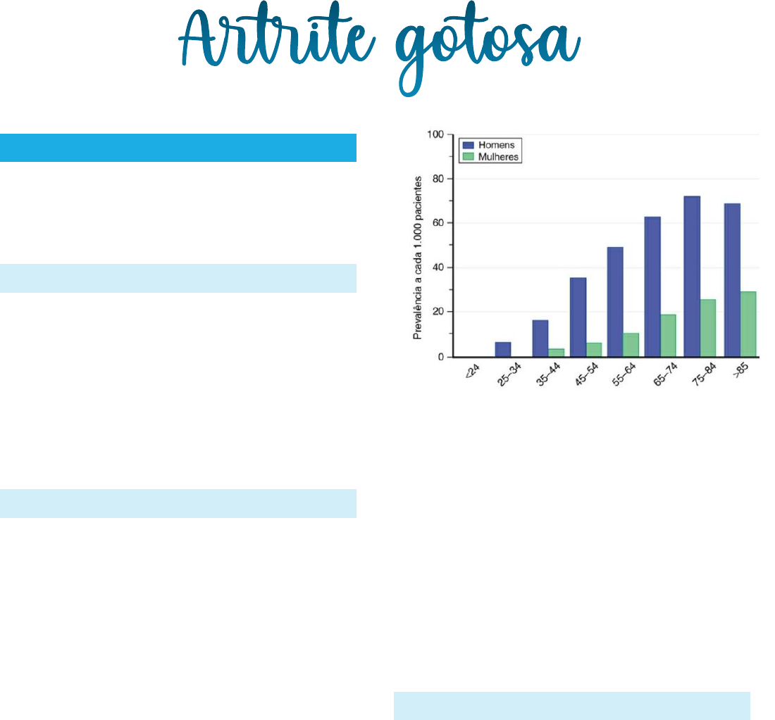 OBJETIVOS: Analisar a artrite gotosa Descrever os diagnósticos diferenciais para gota Explicar a hiperuricemia CONCEITO: Gota é uma artrite inflamatória de origem metabó- lica Gota é uma artrite progressiva que começa como uma monoartrite ou oligoartrite intermitente nas ex- tremidades inferiores e pode progredir durante anos ou décadas para uma poliartrite debilitante, crônica e destrutiva envolvendo qualquer articulação perifé- rica do corpo EPIDEMIOLOGIA A hiperuricemia é muito comum nas culturas oci- dentais, com uma prevalência de até 15% a 20% em alguns estudos populacionais recentes A incidência de gota anual relatada em indivíduos com níveis séricos de urato basal de 9 mg/dL ou mais é de 4,9%, em comparação a apenas 0,5% para aqueles com níveis séricos de urato de 7,0 a 8,9 mg/dL. Vários estudos têm relatado que os homens são de três a seis vezes mais propensos a desenvolverem gota do que as mulheres e a idade tem um impacto aparente na prevalência da doença. Os homens por possuírem mais ácido úrico que nas mulheres e por não terem o fator protetor do estró- geno, como as mulheres, apresentam cerca de 95% dos casos e as mulheres 5%. Estas são mais aco- metidas no pós menopausa, devido à redução dos níveis de estrógeno. Também há acentuada variação dentro dos países, dependendo de fatores sociodemográficos outros além de sexo e idade. Houve um aumento na incidência, devido à modifi- cação dos hábitos de vida que contribuem para esta doença, como obesidade, alcoolismo, dietas, hiper- tensão arterial A hiperuricemia é caracterizada por nível sérico de urato superior a 6,8 mg/dL nos homens e nas mu- lheres. Embora a hiperuricemia seja um pré-requi- sito necessário para o desenvolvimento de gota, apenas 20% de todos os indivíduos hiperuricêmicos desenvolverão gota. Afro-americanos tem níveis mais elevados de ácido úrico em relação aos caucasianos FATORES DE RISCO Sexo masculino (7:1) Estilo de vida 1. Obesidade é um dos maiores riscos para hi- peruricemia e gota, ao reduzir a excreção de ácido úrico e aumentando a produção de purinas. 2. Ingesta aumentada de carnes vermelhas, frutos do mar e peixes, parece ter um efeito de aumento da incidência de gota 3. O aumento de ingesta de gorduras satura- das está relacionado com aumento da resis- tência insulínica, a qual reduz a excreção re- nal de urato. 4. Ingesta de bebidas alcoólicas está associ- ada com aumento de risco de gota de forma dependente da dose, independentemente do tipo de bebida alcoólica. O álcool induz hiperuricemia tanto pelo aumento da produ- ção de uratos quanto pela redução da excre- ção. 5. Consumo de café reduz o nível de ácido úrico a longo prazo, ao bloquear a ação da xantina-oxidase, além de reduzir os níveis de insulina e aumentar a sensibilidade do orga- nismo à insulina 6. Alta ingesta de vitamina C também reduziu o nível sérico de ácido úrico 7. Certas medicações podem afetar nos níveis de ácido úrico no organismo. Baixas doses de salicilato, fenofibrato, losartana e bloque- adores de canais de cálcio reduzem os ní- veis séricos de ácido úrico. Betabloqueado- res e tiazídicos aumentam níveis de ácido úrico sérico. 8. Exposição crônica ao chumbo pode causar gota mesmo em pequena monta ETIOLOGIA E FISIOPATOLOGIA GOTA PRIMÁRIA: O ácido úrico é o produto final do metabolismo de purina nos humanos. Este possui função antioxidante, por conseguir re- mover radicais livres tão efetivamente quanto a vita- mina C, sendo o antioxidante mais abundante no corpo humano. O ácido úrico pode agir na vigilância imune, atuando como adjuvante endógeno para dis- parar a resposta imune inata e específica, ao ser li- berado por células em processo de morte celular Os níveis de urato são influenciados por vários fato- res, incluindo temperatura, pH, concentração de cá- tions, nível de desidratação e outros, que podem al- terar o risco de gota relacionado com uma elevação no nível de urato, além de explicar o porquê de ser a primeira metatarso-falangeana uma articulação co- mumente atingida (onde a temperatura é mais baixa). A quantidade de urato depende da ingesta, síntese e taxa de excreção Na maioria dos mamíferos, o catabolismo das puri- nas é levado uma etapa adiante via enzima urato oxidase ou uricase, com o produto final da purina nessas espécies sendo alantoína que é muito solú- vel. Os seres humanos perderam a capacidade de pro- duzir a enzima uricase, consequentemente, é possí- vel o acúmulo de ácido úrico. Seja ocasionado por superprodução de ácido úrico ou por menor excre- ção pelos rins, esse acúmulo causa a supersatura- ção de íon de urato no sangue e a precipitação de cristais UMS no líquido sinovial, nos tecidos moles e nos órgãos. Urato é produzido pela conversão de uma molécula muito solúvel, a hipoxantina, na menos solúvel xan- tina que, por sua vez, é convertida em ácido úrico muito solúvel por oxidações de anéis de purina cata- lisadas pela enzima xantina oxidase. A xantina oxi- dase está presente em vários órgãos, mas a maioria das atividades ocorre no fígado e no intestino. As purinas são mais abundantes em comidas e be- bidas e podem contribuir para a deposição. A grande massa vem da síntese endógena, principal- mente no fígado. Em condições normais, o excesso de ácido úrico é balanceado pela excreção renal, cerca de 2/3 do total. A secreção pelo intestino del- gado e sua consequente quebra pelas bactérias do intestino corresponde ao 1/3 restante Em razão de seu potencial para causar doença, a eliminação de urato é muito importante. A dose to- tal diária de acúmulo de ácido úrico de síntese de novo, degradação do nucleotídeo e o consumo die- tético está entre 800 e 1.200 mg/dia e é equili- brada pela excreção renal de aproximadamente dois terços da quantidade total e pela eliminaç