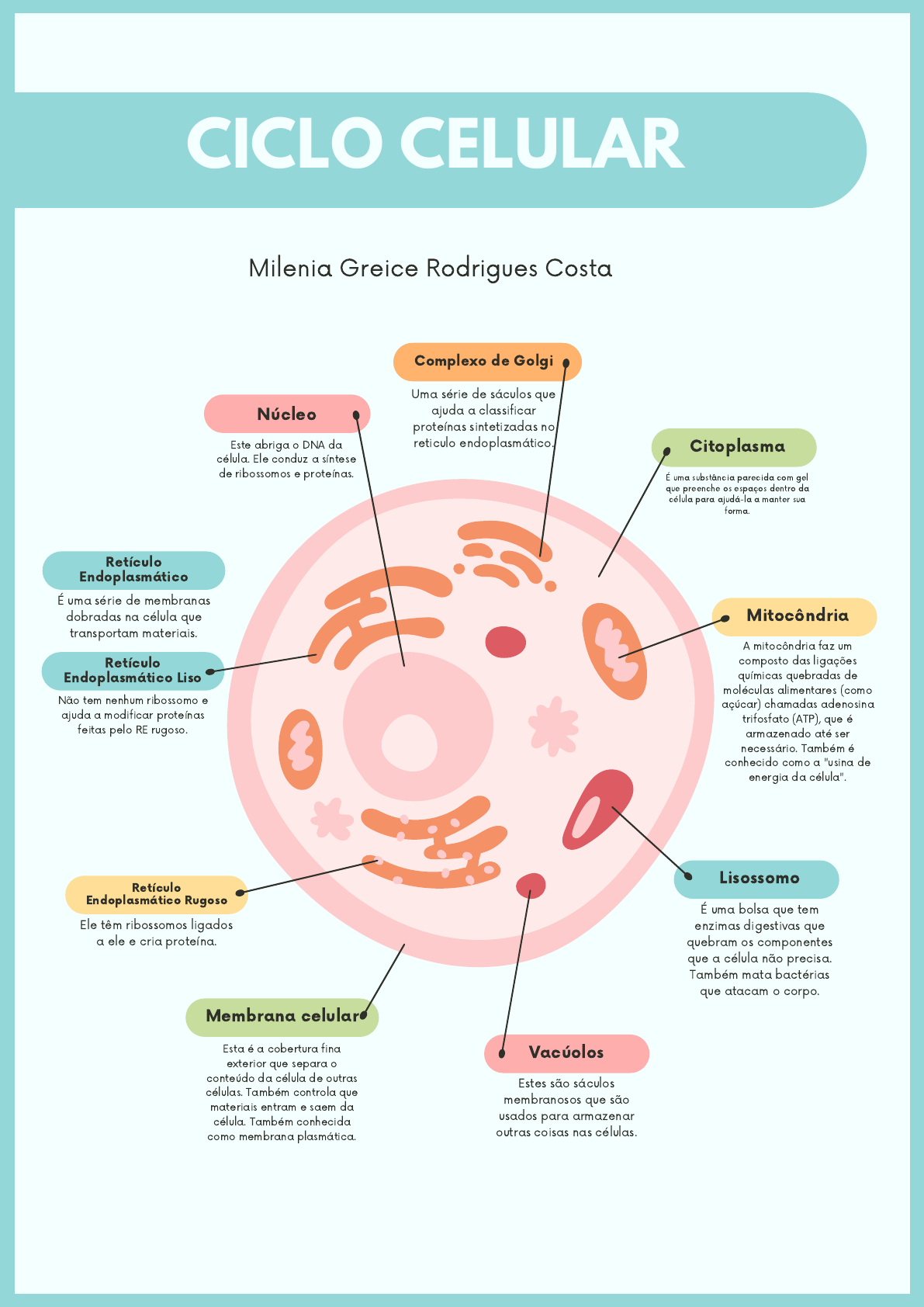 Este abriga o DNA da célula. Ele conduz a síntese de ribossomos e proteínas. Uma série de sáculos que ajuda a classificar proteínas sintetizadas no reticulo endoplasmático. É uma substância parecida com gel que preenche os espaços dentro da célula para ajudá-la a manter sua forma. A mitocôndria faz um composto das ligações químicas quebradas de moléculas alimentares (como açúcar) chamadas adenosina trifosfato (ATP), que é armazenado até ser necessário. Também é conhecido como a "usina de energia da célula". É uma bolsa que tem enzimas digestivas que quebram os componentes que a célula não precisa. Também mata bactérias que atacam o corpo. Estes são sáculos membranosos que são usados para armazenar outras coisas nas células. Ele têm ribossomos ligados a ele e cria proteína. Não tem nenhum ribossomo e ajuda a modificar proteínas feitas pelo RE rugoso. É uma série de membranas dobradas na célula que transportam materiais. Esta é a cobertura fina exterior que separa o conteúdo da célula de outras células. Também controla que materiais entram e saem da célula. Também conhecida como membrana plasmática. Núcleo Complexo de Golgi Citoplasma Mitocôndria Lisossomo Vacúolos Retículo Endoplasmático Rugoso Retículo Endoplasmático Liso Retículo Endoplasmático Membrana celular CICLO CELULAR Milenia Greice Rodrigues Costa CICLO CELULAR Milenia Greice Rodrigues Costa Definição: É constituído pela série de estágios de crescimento e desenvolvimento da célula desde o seu nascimento – formação pela divisão de uma célula mãe – até a reprodução – divisão para gerar duas células f ilhas idênticas. É o principal mecanismo pelo qual todos os seres vivos se reproduzem. A mitose (divisão nuclear) corresponde à separação dos cromossomos e normalmente finalizando com a divisão celular (citocinese). Durante a interfase, ocorre, de maneira ordenada, o crescimento celular e a replicação do DNA. Esta parte é subdividida em três fases: G1, S e G2. A fase S (síntese) é responsável pela duplicação do material genético. Durante a fase G1, a célula é metabolicamente ativa e continua crescendo, mas não duplica seu DNA. Em seguida, na fase G2, o crescimento celular continua e as proteínas são sintetizadas em preparação para a mitose. Ocorre uma sequência comum de eventos: crescimento celular; replicação do material genético (DNA); distribuição do material genético para as células-filhas; e divisão celular. Esse processo, que geralmente se completa em 24 horas nas células humanas, é dividido em duas partes básicas: mitose (fase M) e interfase. Então nota-se: G1: funciona como um importante mecanismo para a regulação da quantidade de células no corpo – se mais células são necessárias, sinais extracelulares estimulam o ponto G1 a prosseguir com o ciclo celular e quando não são necessárias mais células, a divisão é bloqueada. É regulada principalmente por fatores de crescimentos extracelulares que sinalizam a proliferação celular e pela disponibilidade suficiente de nutrientes. Transição de G2 para a fase M: onde o sistema de controle dispara um evento mitótico precoce que leva ao alinhamento de cromossomos no eixo mitótico na metáfase. Esse ponto assegura que as células não entrem em mitose até que um DNA danificado possa ser reparado e a replicação de DNA esteja completa. Mitose: assegura que os cromossomos replicados estejam ligados apropriadamente a uma maquinaria citoesquelética chamada de fuso mitótico, antes que o fuso separe os cromossomos e os distribua para as duas células-filhas. Sistema controle do ciclo celular Definição: rede complexa de proteínas reguladoras, que garante que os eventos do ciclo celular ocorram em uma sequência determinada e que cada processo tenha sido completado antes que o próximo inicie. PONTOS DE CHECAGEM OBS: Em animais, muitas células permanecem em G0 a menos que sejam chamadas para proliferar por fatores de crescimento apropriados ou outros sinais extracelulares. Por exemplo, f ibroblastos da pele ficam bloqueados em G0 até que sejam estimulados a se dividirem para reparar danos resultantes de um ferimento. A proliferação destas células é desencadeada por fatores de crescimento derivados de plaquetas, liberados durante a coagulação, e sinalizam a proliferação de fibroblastos nas vizinhanças do tecido ferido. Os sinais extracelulares, produzidos por outras células, que estimulam a multiplicação celular são chamados de mitógenos. As proteínas-cinase dependentes de ciclinas (Cdks) A atividade de cada uma dessas cinases aumenta e diminui de maneira cíclica, levando a mudanças na fosforilação de proteínas intracelulares que iniciam ou regulam os principais eventos do ciclo celular. Existem quatro classes de ciclinas, cada uma definida pelo estágio do ciclo celular no qual se ligam às Cdks e em que atuam: • G1/S-ciclinas: Ativam as Cdks no final de G1, formando o complexo G1/S-Cdk, e com isso, ajudam a desencadear a progressão ao Início, monitorando a entrada no ciclo celular. Seus níveis diminuem na fase S. • S-ciclinas: Se ligam a Cdks logo após a progressão ao Início e ajudam a estimular a duplicação dos cromossomos, formando o complexo S-Cdk. Seus níveis permanecem elevados até a mitose, e elas contribuem ao controle de alguns eventos mitóticos iniciais. • M-ciclinas: Ativam as Cdks que estimulam a entrada na mitose na transição G2/M, por meio do complexo M-Cdk. Os níveis de M-ciclinas diminuem na metade da mitose. • G1-ciclinas: na maioria das células, elas ajudam a regulam as atividades das G1/S-ciclinas. CICLO CELULAR Milenia Greice Rodrigues Costa OBS 1: As Cdks não são apenas reguladas pela ligação das ciclinas, mas também pela ativação ou inibição por fosforilação. Juntos, esses eventos de regulação asseguram que as cinases serão ativadas no estágio correto do ciclo celular. OBS