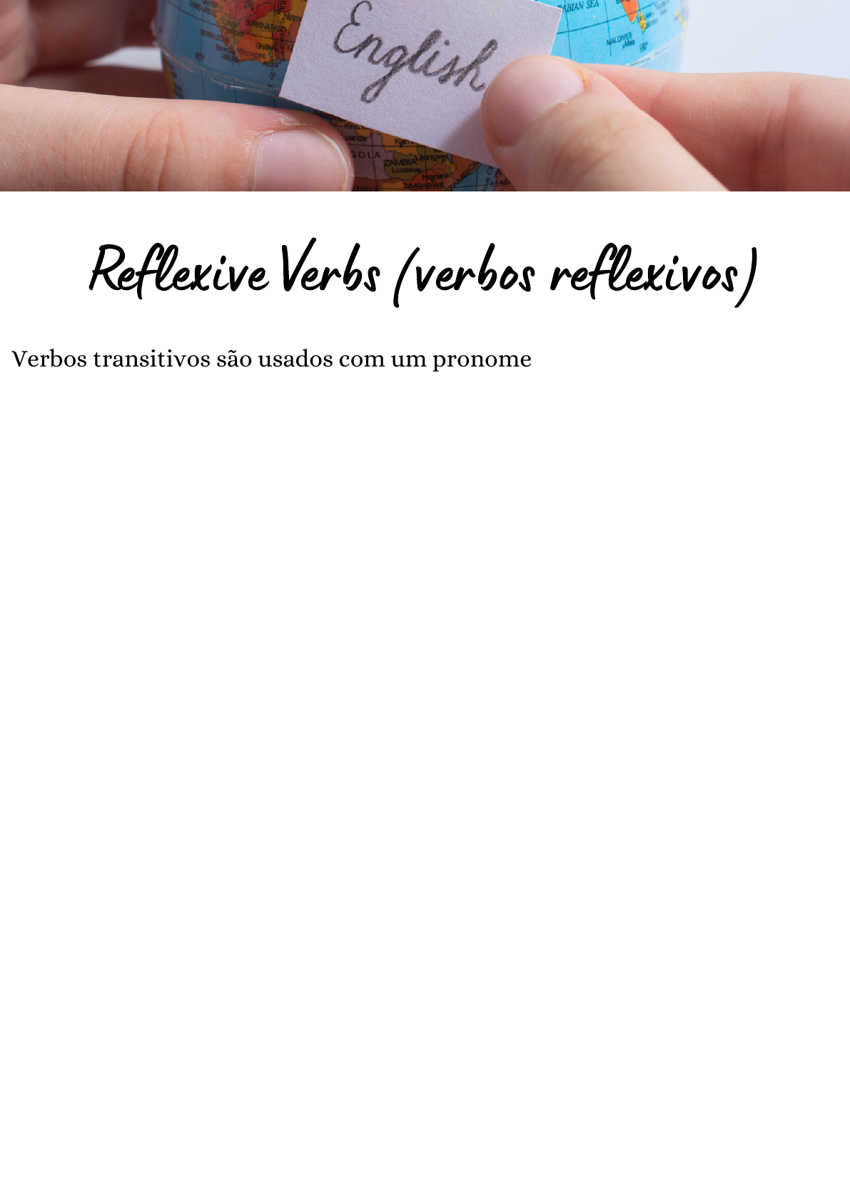 Reflexive Verbs (verbos reflexivos) Verbos transitivos são usados com um pronome reflexivo para indicar que o objeto é o mesmo que o sujeito. Alguns verbos que normalmente não tem uma pessoa como objeto, podem ter um pronome reflexivo como objeto. 1. Usa-se um pronome reflexivo depois de um verbo transitivo para indicar que o objeto é o mesmo que o sujeito. Ex. - He blamed himself for his friend’s death. (Ele se culpou pela morte do amigo) - I taught myself French. (Eu ensinei Francês a mim mesmo) Verbos como “dress” (vestir), “shave” (barbear) e “wash” (lavar), que descrevem ações que as pessoas fazem por elas mesmas, geralmente não são usadas com um pronome reflexivo em Inglês, embora se use em outras línguas (como no Português, observe a tradução dos exemplos). Com estes verbos, os pronomes reflexivos são usados só para dar ênfase à ação. - I usually shave before breakfast. (Geralmente eu me barbeio antes do café- da-manhã) - He prefers to shave himself, even with that broken arm. (Ele prefere barbear-se a si mesmo, mesmo com aquele braço quebrado) - She washed very quickly and rushed downstairs. (Ela lavou-se muito rápido e precipitou-se para o andar de baixo.)