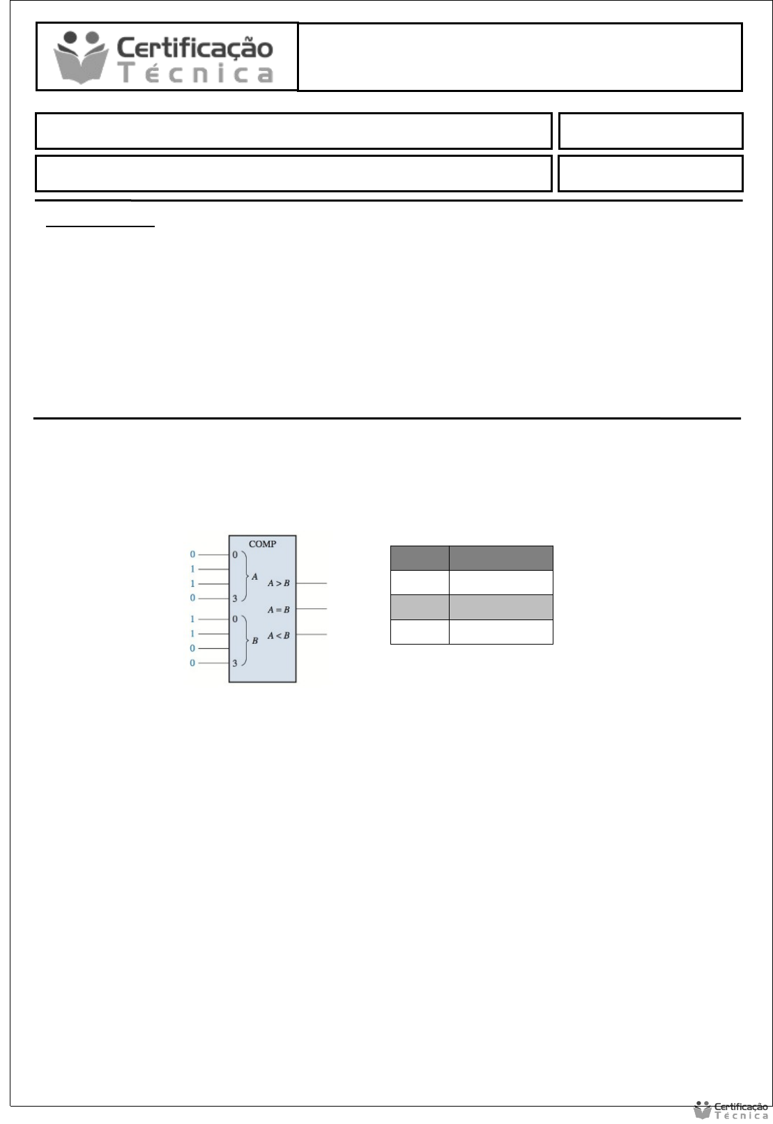 Eletrônica Digital - sg Data: / / . Aluno (a): Atividade Pratica Final INSTRUÇÕES: · Esta Atividade contém 4 (quatro) questões, totalizando 10 (dez) pontos; · Baixe o arquivo disponível com a Atividade Pratica Final; · Você deve preencher dos dados no Cabeçalho para sua identificação: · Nome / Data de entrega. · As respostas devem ser digitadas abaixo de cada pergunta; · Ao terminar grave o arquivo com o nome Atividade Prática; · Quando solicitado · Envio o arquivo pelo sistema no local indicado; · Em caso de dúvidas consulte o seu Tutor. 1. Dado o comparador abaixo, faça uma pequena pesquisa sobre o assunto, explique resumidamente como funciona este equipamento e indique o resultado da operação. Resultado A > B A = B A < B 2. Cite 5 exemplos de sinais analógicos e seus respectivos equipamentos de medição. Sinal de rádio – Frequencímetro Resistencia elétrica – Ohmímetro Corrente Elétrica – Amperímetro Tensão – Voltímetro Ar comprimido – Manômetro 3. O que são transistores, porque eles são importantes para a eletrônica digital? Indique pelo menos 2 exemplos de uso deste equipamento. São basicamente chaves que são abertas ou fechadas quando são polarizadas Corretamente, componentes utilizados em processadores para a comutação de Sinais elétricos e são utilizados para ganho de sinal elétrico em alguns circuitos. Exemplos: Microprocessadores e Amplificadores 4. Obtenha a expressão booleana e desenhe o circuito cuja saída pode ser representada pela seguinte tabela verdade: A B C S 0 0 0 0 0 0 1 0 0 1 0 1 0 1 1 1 1 0 0 0 1 0 1 0 1 1 0 0 1 1 1 1 A.B.C+A.B.C+A.B.C=S