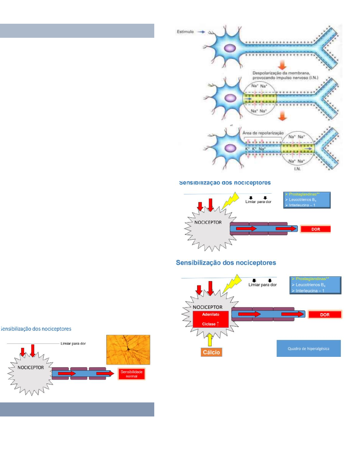 MECANISMO DE AÇÃO DOS ANESTÉSICOS LOCAIS Dor É uma experiência sensorial ou emocional desagradável que ocorre em diferentes graus de intensidade – do desconforto leve à agonia total; No Brasil, estima-se que anualmente são realizados, aproximadamente, 250-300 milhões de anestesias odontológicas, com raros relatos de algum tipo de reação adversa grave. Dor nociceptiva Lesão tecidual. Liberação de mediadores químicos. Sensibilização periférica. Transmissão central. Dor neuropática Possui origem de uma lesão ou irritação do nervo. Expressas como ardentes, penetrantes e lancinantes. Ex: nevralgia do trigêmeo. Dor psicogênica Ocorre quando nenhum mecanismo nociceptivo ou neuropático pode ser identificado e há sintomas psicológicos suficientes para estabelecer critérios de distúrbio doloroso. Propagação do impulso nervoso O impulso elétrico promove a entrada de íons positivos (Na+) para dentro do neurônio “despolarização”. Após a despolarização, abertura dos canais de K+, promovendo a “repolarização” (voltar ao repouso). Há, então, a inversão dos íons através da bomba de Na+/K+. Envolve gasto de energia (ATP). O que é anestesia local? É a perda da sensação de uma área causada pela depressão da excitação nas terminações nervosas. Perda de sensibilidade sem a perda da consciência. Características desejáveis em um anestésico local (AL) Não ser irritante. Não causar alterações permanentes no nervo. Toxicidade baixa. Eficaz independente do tecido infiltrado. Baixo tempo para início da ação. Longo suficiente para terminar o procedimento. Não causar alergias. Potência suficiente antes da dose máxima. Ser estéril. Características gerais dos AL Base fraca. Pouco solúveis em água. Instáveis quando expostos ao ar. É adicionado ácido clorídrico (pH ácido). Efeitos farmacológicos dos AL Uso principal → depressão da condução nervosa periférica. Interferência na transmissão dos impulsos em qualquer tecido excitável. Sistema cardiovascular Sistema nervoso central Como agem os AL Anestésico não ionizado atravessa a membrana. Ligam-se nos canais de sódio. Bloqueio da condução nervosa. Mecanismo de ação A sequência a seguir é um mecanismo proposto de ação dos anestésicos locais: 1. Deslocamento de íons de cálcio do sítio receptor dos canais de sódio, o que permite... 2. A ligação da molécula de anestésico local a esse sítio receptor, o que então produz... 3. O bloqueio do canal de sódio, e uma... 4. Diminuição na condutância de sódio, que leva à... 5. Depressão da taxa de despolarização elétrica, e a... 6. Falha em obter o nível do potencial de limiar, juntamente com uma... 7. Falta de desenvolvimento dos potenciais de ação propagados, o que é chamado... 8. Bloqueio de condução. Anestésicos locais Fármacos que bloqueiam reversivelmente a condução nervosa com perda de sensações em área circunscrita do organismo, sem alteração do nível de consciência. Diferença entre os tipos de AL Ester Instáveis em solução. Maior potencial alergênico. Rápida hidrólise (enzimas no plasma). Amida Estáveis em solução. Baixo potencial alergênico. Lenta biotransformação hepática. Composição dos anestésicos locais Sais anestésicos – lidocaína, mepivacaína, bupivacaína, articaína e prilocaína. Vasoconstritor – adrenalina, noradrenalina, fenilefrina e felipressina. Estabilizante de vasoconstritor (ação antioxidante) – bissulfito de sódio. **Conservante da solução (ação bactericida) – metilparabeno. Cloreto de sódio. Água. Em casos de alergia, a alergia é do estabilizante de vasoconstrição. Aminas simpatomiméticas: adrenalina, noradrenalina e fenilefrina. Reações alérgicas Metilparabeno FDA (1984): retirou das soluções de AL com finalidade odontológica devido a não reutilização. Pode desencadear reação alérgica imediata ou tardia nos pacientes. É um antibacteriano encontrado em alguns tubetes plásticos. Bissulfito de sódio Reduz a oxidação do vasoconstritor do tipo amina simpatomimética. É usado como conservante de alimentos industrializados. Sempre perguntar para o paciente se ele tem alergia a alimentos enlatados, pois o bissulfito de sódio está presente neles. Cuidado e manuseio Os cartuchos odontológicos de vidro e de plástico não devem ser submetidos à autoclave. Devem ser armazenados em seu recipiente original e em temperatura ambiente. Não devem ficar expostos a luz solar direta, porque alguns de seus componentes podem vir a apresentar deterioração acelerada. Não é necessário aquecer os cartuchos, pois causa desconforto para o paciente durante a injeção e acelera a degradação do vasopressor. Não deve ser imergido em nada. O diafragma semipermeável permite a difusão das soluções para o interior do cartucho odontológico, contaminando-o. Recomenda- se que os cartuchos sejam mantidos em seu recipiente original até que sejam utilizados.