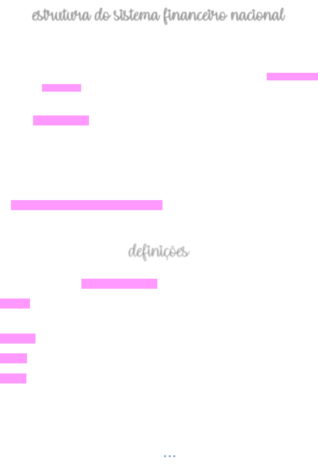 1 estrutura do sistema financeiro nacional Essa estrutura está prevista na Constituição Federal, em seu art. 192. Art. 192. O Sistema Financeiro Nacional, estruturado de forma a promover o desenvolvimento equilibrado do País e a servir aos interesses da coletividade, em todas as partes que o compõem, abrangendo as cooperativas de crédito, será regulado por leis complementares que disporão, inclusive, sobre a participação do capital estrangeiro nas instituições que o integram. Pode ser perguntado, em prova, a forma como o Sistema Financeiro Nacional é regulado. Perceba que é por lei complementar. Quando a Constituição entrou em vigor, em 1988, já havia sido editada a Lei n. 4.595/1964, que continua em vigência e dispõe sobre o SFN. Durante muito tempo não foi editada nenhuma lei sobre o tema. Mas, em fevereiro de 2021, surgiu a Lei Complementar 179, que alterou algumas informações da Lei n. 4.595/1964. A principal mudança foi conceder autonomia ao Banco Central do Brasil. definições É importante entender o significado das palavras. Estrutura: modo como as diferentes partes de um todo estão dispostas. Há diferentes partes no SFN, e elas precisam se organizar. Financeiro: tem a ver com finanças, que vem a ser a ciência e a profissão do manejo do dinheiro. Nacional: pertencente ou relativo a uma nação. Sistema: conjunto de partes, componentes, que interagem entre si, de forma ordenada, a fim de atingir um objetivo comum. Veremos como um sistema funciona na prática, em diferentes exemplos. Assim, podemos fazer as seguintes associações: 2 Analisando o Sistema Financeiro Nacional, temos como sistema: O SFN promove a mudança de lugar do dinheiro e cria mecanismos para que as finanças circulem em toda a nação. Alguns estudiosos, porém, consideram essa definição de objetivo acima muito simplória, considerando mais o objetivo, de fato, é o “encontro dos superavitários com os deficitários”. 3 O superavitário é aquele que tem sobra de dinheiro. Para esse dinheiro não desvalorizar, ele leva esse valor para o banco, que vai repassar esse dinheiro para o deficitário (aquele que precisa de mais dinheiro além do que ganha). O ideal é que todos estivessem no primeiro caso, pudessem ter dinheiro suficiente para atender as necessidades de consumo e ainda tivessem dinheiro para investir. Mas nem sempre é assim. composição e segmentos do sistema financeiro nacional Vendo a tabela acima, percebemos que o sistema segue 3 ramos básicos, compostos por uma série de integrantes. Abaixo, segue a mesma tabela de forma esquematizada: 4 O termo mercado monetário está relacionado à moeda. A parte de seguros privados envolve também a previdência aberta e título de capitalização. 5 Órgãos normativos O órgão normativo sobre a parte de moeda, crédito, capitais e câmbio é o Conselho Monetário Nacional (CMN), que é o órgão normativo mais importante do Sistema Financeiro Nacional. No entanto, ele, como os outros conselhos, tem poder, mas não executa coisa alguma. Esses conselhos traçam normas, procedimentos e políticas gerais, mas não executam nada. Os outros conselhos são o Conselho Nacional de Seguros Privados (CNSP) e o Conselho Nacional de Previdência Complementar (CNPC). Entidades supervisoras As entidades supervisoras executam o que é estabelecido pelos conselhos. Até a LC 179/2021, o Banco Central do Brasil (Bacen) dependia, em sua totalidade, das normas vindas do CMN. Desde a publicação da lei complementar, esse órgão tem autonomia, mas ainda há algumas regras que o Bacen executa vindas do CMN. Outra entidade supervisora é a Comissão de Valores Mobiliários (CVM). Vinculada ao CMN, também tem uma certa autonomia. Há ainda a Superintendência de Seguros Privados (Susep) e Superintendência Nacional de Previdência Complementar (Previc). Algo importante: todas as entidades supervisoras são autarquias federais. Operadores Os operadores (ou intermediários financeiros) são instituições sujeitas à supervisão das entidades supervisoras, que dão autorização para funcionamento, fiscalizam e até punem esses operadores, se for o caso. ▪ Supervisão do Bacen 6 Há diversos bancos: bancos comerciais, bancos de investimento, bancos de desenvolvimento, de câmbio, que podem ser públicos ou privados. Já caixa econômica há apenas uma, a Federal. Durante um bom tempo existiram várias caixas econômicas, que, ao longo dos anos, foram incorporadas pela CEF. Detalhe: a Caixa Econômica Federal não é banco, e sim semelhante a banco. As administradoras de consórcios não são instituições financeiras. São prestadoras de serviços que administram grupos de consorciados para aquisição de bens. Para funcionar, precisam de autorização do Banco Central, e estão sujeitas à supervisão e fiscalização do Bacen. Sobre as corretoras e distribuidoras, dependendo de suas atividades, também são fiscalizadas pela CVM. Quando uma distribuidora ou corretora de títulos e valores mobiliários estiver operando no mercado oferecendo compra e venda dos seus clientes de ações, debêntures, de comércio ou papers, estarão 7 na supervisão da CVM. No entanto, se estiver fazendo operação de câmbio, estará sob o olhar do Bacen. As instituições de pagamento não compõem o SFN, mas são reguladas e fiscalizadas pelo Banco Central, conforme diretrizes estabelecidas pelo CMN. As demais instituições não bancárias são: a sociedade de arrendamento mercantil; a sociedade de crédito, financiamento e investimento (as financeiras); a sociedade de crédito imobiliário. Ao contrário das instituições bancárias, não podem captar depósitos à vista e não podem ter conta corrente. ▪ Supervisão da CVM Além de algumas corretoras e distribuidoras, são bolsas de valores e bolsas de mercadorias e futuros. Na prática, só há uma única bolsa em funcionamento no Brasil: B3 Brasil Bolsa e Balcão. ▪ Supervisão da Susep Segurador