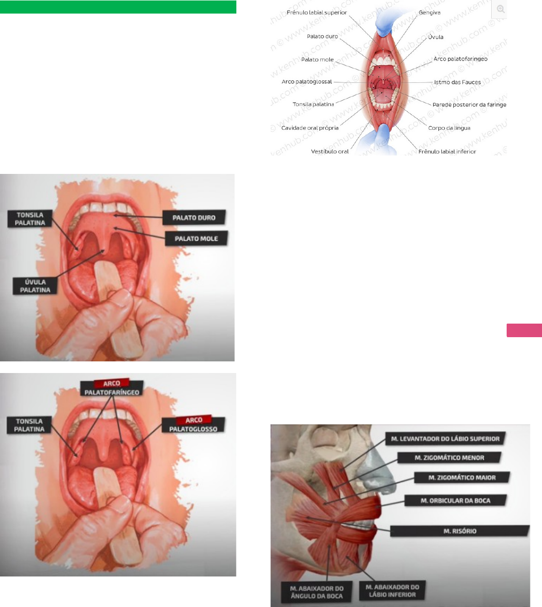 ANATOMIA DA CAVIDADE ORAL Anna Cecília Abreu – Medicina Unit – P2 1 BOCA LOCALIZAÇÃO · Terço inferior da face LIMITES · ANTERIOR: lábios e rima bucal · POSTERIOR: istmo das fauces · LATERAIS: bochechas com corpos adiposos · SUPERIOR: palato duro e palato mole · INFERIOR: assoalho bucal MUSCULATURA PERIORAL -superficiais · Músculo levantador do lábio superior · Músculo zigomático menor · Músculo zigomático maior · Músculo orbicular da boca: permite o grande movimento da boca, manutenção do alimento dentro da boca, fechamento dos lábios · Músculo risório · Músculo abaixador do ângulo da boca · Músculo abaixador do lábio inferior OBS: Região modíolo: região de confluência da musculatura perioral -mais internos · Músculo levantador do ângulo da boca · Músculo bucinador · Músculo mentual DIVISÃO · VESTÍBULO DA BOCA esspaço em forma de fenda limitado externamente pelos lábios e bochechas e internamente pelas gengivas e dentes. possui frênulos labiais ligando os lábios à gengiva. se comunica com o exterior através da rima oral sua mucosa é frouxa para permitir a movimentação dos lábios · CAVIDADE PRÓPRIA DA BOCA espaço entre os dentes e o istmo das fauces limites: delimitações do Istmo Das Fauces SUPERIOR: úvula palatina INFERIOR: dorso da língua LATERAL: arco palatoglosso PAREDES DA BOCA 1)ANTERIOR: LÁBIOS · Duas pregas carnosas que circundam o orifício bucal · Revestidos externamente por pele e internamente por mucosa · Músculo ligado aos lábios -> orbicular da boca 2)LATERAL: BOCHECHAS · É a parte da mucosa bucal que cobre os arcos alveolares nos quais estão implantados os dentes 3)SUPERIOR: PALATO DURO 4)POSTERIOR: PALATO MOLE 5)ASSOALHO DA BOCA DENTES · Estrutura altamente mineralizada · Funções: mastigação, deglutição, estética e fonação · Partes: -coroa -colo -raízes · Tecidos dentários: -esmalte -dentina -cemento -polpa · Dentições -primária ou decídua: 20 dentes -8 incisivos, 4 caninos, 8 molares -secundária ou permanente: 32 dentes -8 incisivos, 4 caninos, 8 pré-molares e 12 molares GLÂNDULAS SALIVARES -3 pares de glândulas que lançam sua secreção na cavidade bucal · Parótidas · Submandiculares · Sublinguais LÍNGUA LOCALIZAÇÃO · Cavidade própria da boca · Seus músculos a fixam ao osso hioide, a mandíbula, osso temporal, palato mole e parede da faringe PARTES · Raiz -tonsilas linguais · Corpo -face dorsal (anterior): sulco mediano, sulco terminal, forame cego e papilas linguais (circunvaladas, filiformes, fungiformes e folheadas) -face ventral (posterior): frênulo lingual mediano, prega franjada e prega sublingual · Ápice FUNÇÕES BÁSICAS · Auxilia na mastigação, deglutição, vocalização e gustação VASCULARIZAÇÃO DA LÍNGUA 1. IRRIGAÇÃO -Irrigada pela artéria carótida externa; mais importante é a artéria lingual que se divide em: artéria dorsal lingual, artéria sublingual e artéria lingual profunda · Corpo e Ápice: artéria lingual (principal) · Raiz: ramos da artéria facial (tonsilar e palatina ascendente) e ramos da artéria faríngea ascendente 2. DRENAGEM VENOSA · Veias dorsais da língua >> Veia lingual profunda >> Veia lingual >> Veia Jugular Interna 3. DRENAGEM LINFÁTICA · Linfonodos submentuais > submandibulares > Linfonodos jugulodigástrico > Linfonodos cervicais profundos INERVAÇÃO 1. SENSITIVA: · Geral: -Nervo vago X: raiz da língua em direção à laringe e da orofaringe. Via ramo interno do nervo laríngeo superior -Nervo glossofaríngeo IX: língua (posterior + lateral) e faringe. Via ramos linguais -Nervo trigêmeo V: porção mais medial da anterior da língua. Via nervo lingual -Nervo Facial (VII): porção mais lateral da anterior da língua. Via nervo lingual · Especializada - Gustativa: -Nervo Facial VII: Via corda do tímpano e -Nervo glossofaríngeo: ramo lingual -Nervo lingual 2. MOTORA: · Nervo lingual · Nervo glossofaríngeo · Nervo hipoglosso · Ramos do plexo cervical MÚSCULUCOS DA LÍNGUA · Extrínsecos: -genioglosso: músculo chato, em forma de leque; serve para protrusão da língua. -hioglosso: origina-se da face lateral do corpo e dirige-se quase verticalmente para a borda lateral da língua; serve para abaixar a língua. -estiloglosso: origina-se das faces anterior e lateral do processo estiloide e penetra nas faces lateral e dorsal da língua; serve para retrair a língua. -palatoglosso: mais associado ao palato mole; serve para elevar a língua. Obs:todos supridos pelos nervos hipoglosso, exceto o palatoglosso inervado pelo ramo do nervo acessório que seguem junto com o nervo vago. · Intrínsecos: -Longitudinal superior -Longitudinal inferior -Transverso -Vertical Obs: todos supridos pelos nervos hipoglosso