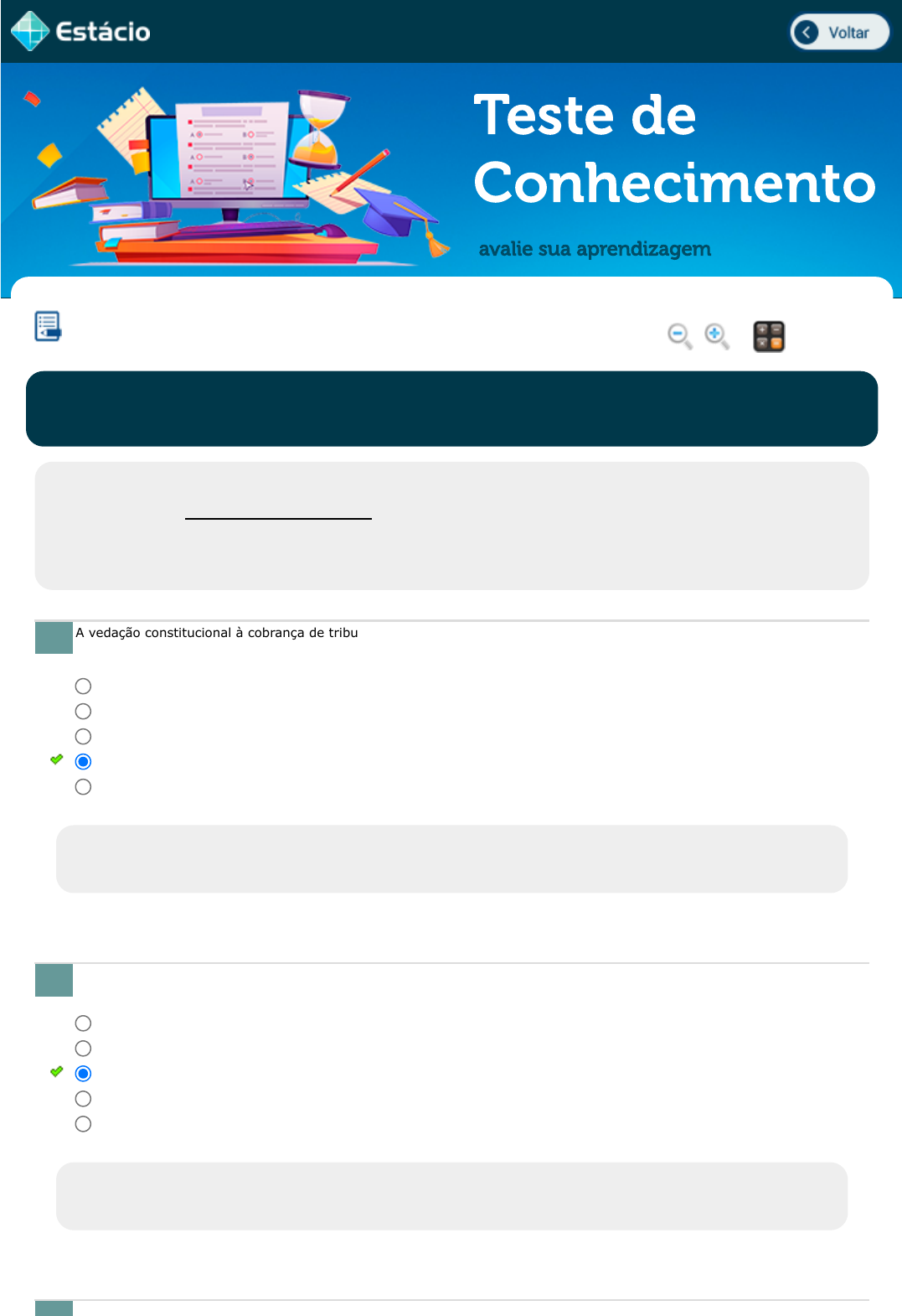 Teste de Conhecimento avalie sua aprendizagem A vedação constitucional à cobrança de tributos antes de decorridos 90 (noventa) dias da data em que tenha sido publicada a lei que os instituiu ou aumentou não se aplica à fixação da base de cálculo do imposto sobre: Não cabe ao Estado instituir imposto sobre: CONTABILIDADE TRIBUTÁRIA I Lupa Calc. EGT0028_202001096991_TEMAS Aluno: LAURA BORBA SILVA DA COSTA LAUREANO Matr.: 202001096991 Disc.: CONT TRIBUTÁRIA 2021.3 EAD (G) / EX Prezado (a) Aluno(a), Você fará agora seu TESTE DE CONHECIMENTO! Lembre-se que este exercício é opcional, mas não valerá ponto para sua avaliação. O mesmo será composto de questões de múltipla escolha. Após responde cada questão, você terá acesso ao gabarito comentado e/ou à explicação da mesma. Aproveite para se familiarizar com este modelo de questões que será usado na sua AV e AVS. 1. transmissão causa mortis e doação. transmissão da propriedade urbana. propriedade territorial rural. propriedade de veículos automotores. serviços de qualquer natureza. Data Resp.: 13/08/2021 16:08:45 Explicação: A resposta correta é: propriedade de veículos automotores. 2. transmissão causa mortis e doação, de quaisquer bens e direitos. circulação de mercadorias. prestação de serviços de transporte municipal. prestação de serviços de transporte interestadual. prestação de serviços de comunicação. Data Resp.: 13/08/2021 16:09:03 Explicação: A resposta correta é: prestação de serviços de transporte municipal. javascript:voltar(); javascript:voltar(); javascript:diminui(); javascript:aumenta(); javascript:calculadora_on(); Cabe ao município instituir imposto sobre: A competência para instituir a contribuição para custeio do serviço de iluminação pública cobrada nas faturas de consumo de energia elétrica é: Há uma norma constitucional que veda a cobrança de tributos em relação aos fatos geradores ocorridos antes do início da vigência da lei que os houver instituído ou aumentado. Essa norma configura o princípio constitucional tributário da: Faz parte da Administração Tributária: 3. circulação de bens. sobre a propriedade rural. transmissão de bens imóveis, por ato inter vivos. prestação de serviços de comunicação. prestação de serviços, incluindo o de transporte. Data Resp.: 13/08/2021 16:09:23 Explicação: A resposta correta é: transmissão de bens imóveis, por ato inter vivos. 4. da Concessionária do Serviço de Fornecimento de Energia Elétrica. da Agência Nacional de Energia Elétrica (ANEEL). da União. estadual. municipal. Data Resp.: 13/08/2021 16:09:44 Explicação: A resposta correta é: municipal. 5. irretroatividade. legalidade. anterioridade. capacidade contributiva. uniformidade. Data Resp.: 13/08/2021 16:10:02 Explicação: A resposta correta é: irretroatividade. INTRODUÇÃO AO DIREITO TRIBUTÁRIO 6. O Ministério da Fazenda A Polícia Federal O Ministério da Economia O Poder Judiciário A Receita Federal Data Resp.: 13/08/2021 16:10:18 A alíquota efetiva aplicada sobre o lucro a fim de estimar o valor a ser recolhido do Imposto de Renda de Pessoa Jurídica e da Contribuição Social Sobre o Lucro Líquido no regime do Lucro Presumido para empresas comerciais é de: Uma empresa emite uma nota fiscal no valor de R$ 120,00 de produtos que adquiriu por R$ 150,00. Quanto será devido de PIS/COFINS pelo regime não cumulativo? Não é de competência da Administração Tributária fiscalizar o pagamento de: A primeira etapa do Processo Administrativo Tributário termina: 7. 32,00% 10,88% 8,00% 2,72% 34,00% Data Resp.: 13/08/2021 16:10:49 8. R$4,38 R$13,88 A empresa não deverá recolher PIS/COFINS nessa nota fiscal. R$11,10 R$5,48 Data Resp.: 13/08/2021 16:10:57 9. Contribuições Impostos Tributos Doações Taxas Data Resp.: 13/08/2021 16:11:18 10. Com a condenação do contribuinte Quando a Administração Tributária lavra o Auto de Infração ou realiza o arquivamento do PAT Quando a Administração Tributária cancela o CNPJ do Contribuinte Quando o contribuinte recorre ao poder judiciário Quando a Administração Tributária realiza a denúncia do contribuinte ao Ministério Público Data Resp.: 13/08/2021 16:11:49 Não Respondida Não Gravada Gravada Exercício inciado em 13/08/2021 16:08:18.