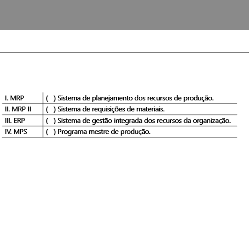 Prova Online Disciplina: 101237 - ADMINISTRAÇÃO DA PRODUÇÃO E DE MATERIAIS Abaixo estão as questões e as alternativas que você selecionou: Parte superior do formulário QUESTÃO 1 Compare as colunas e assinale a opção que associa a sigla ao significado. a ) III, I, IV, II b ) I, II, III, IV c ) IV, I, II, III d ) II, I, III, IV. e ) I, III, IV, I, II Ver justificativa da resposta QUESTÃO 2 Total Quality Management (TQM) - gerenciamento da qualidade total é um programa que tem como objetivo: a ) medir o nível de satisfação dos fornecedores e clientes, com referência ao serviço de atendimento oferecido pela organização. b ) avaliar a conformidade e desempenho dos materiais recebidos e serviços prestados pelos fornecedores. c ) estabelecer programas de medição e avaliação do desempenho dos funcionários da produção e atendimento aos clientes. d ) avaliar o desempenho dos produtos oferecidos pelos fornecedores e como são transportados e entregues. e ) a ênfase nas necessidades do consumidor, na definição de objetivos, no treinamento dos profissionais e no engajamento nas ações da qualidade. Ver justificativa da resposta QUESTÃO 3 Sistemas que buscam aumentar a eficiência da entrega e reposição de produtos, nas quantidades e locais para atender à demanda e operar com o menor custo possível, são chamados de: a ) Sistema de apoio à decisão (SAD). b ) Distribution Requirements Planning (DRP) - planejamento das necessidades de distribuição. c ) Total Quality Management (TQM) - gestão da qualidade total. d ) Material Requirement Planning (MRP) - planejamento das necessidades de materiais. e ) Supply Chain Management (SCM) - gerenciamento da cadeia de suprimentos. Ver justificativa da resposta QUESTÃO 4 Assinale a alternativa que descreve a função procurement. a ) Trata-se de sistema que integra o processo de aquisição, busca de fornecedores e, processo de compra, de forma eletrônica. b ) Trata-se de sistemas que auxiliam o planejamento e a execução das operações de armazenamento. c ) Trata-se de sistema que gerencia os lotes de produção. d ) Trata-se de sistemas de gestão e integração entre empresas por meio dos fluxos de informação. e ) Trata-se de sistemas que interligam os pedidos com as áreas de operações. Ver justificativa da resposta QUESTÃO 5 A seguir, algumas das características do ambiente industrial 4.0. Associe a característica à sua definição e assinale a alternativa que apresenta a ordem correta, de cima para baixo. a ) II, III, I. b ) I, II, III. c ) III, I, II. d ) II, I, III. e ) III, II, I. Ver justificativa da resposta QUESTÃO 6 Qual é o canal de distribuição que adquire grande quantidade de vários itens e os revende em quantidades fracionadas? Assinale a alternativa correta. a ) Supermercado. b ) Atacado. c ) Hipermercado. d ) Varejo. e ) Loja de departamento. Ver justificativa da resposta QUESTÃO 7 Quais são os elementos que compõem o processo ou sistema de produção de forma sintética? Assinale a alternativa correta. a ) Custos, gestão do caixa e planejamento. b ) Abastecimento, compras e distribuição. c ) Triagem, seleção e treinamento de pessoas. d ) Entrada (input), processamento (transformação) e saída (output). e ) Pesquisa de mercado, planejamento e distribuição. Ver justificativa da resposta QUESTÃO 8 A capacidade de produção é o nível _____________ de atividade de transformação realizada em determinado período de tempo (hora, dia, semana). A medição da ___________ de desempenho é calculada na divisão do volume de produção _________ pela capacidade efetiva. Assinale a alternativa que completa as lacunas de forma correta. a ) Máximo, eficiência, real. b ) Mínimo, eficiência, projetada. c ) Máximo, capacidade, nominal. d ) Médio, qualidade, projetada. e ) Mínimo, capacidade, nominal. Parte inferior do formulário
