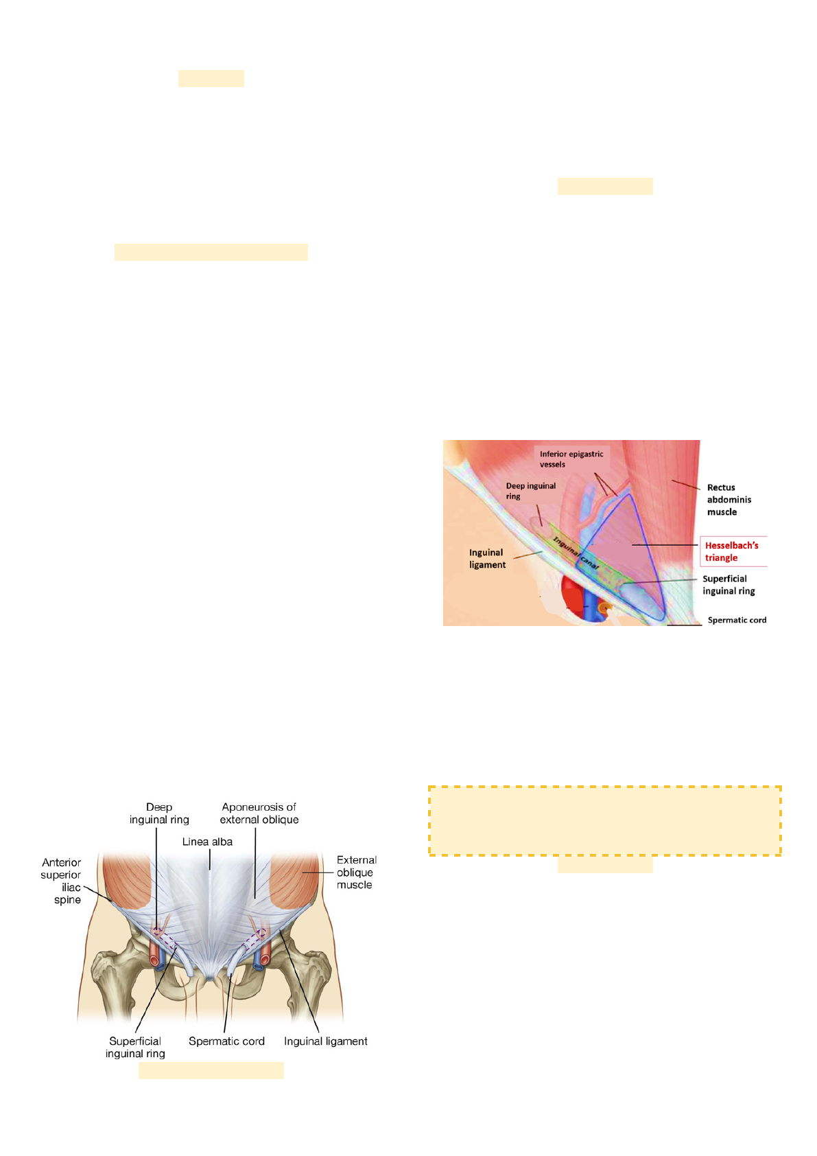 Anatomia das Hérnias Introdução As hérnias são protusões de algum tecido para fora de sua localização anatômica, em virtude de algum defeito naquela parede. Elas são condições cirúrgicas muito comuns e de grande impacto, sendo o conhecimento anatômico essencial para entender sua fisiopatologia e seu tratamento, que visa a reconstrução e reforço da estrutura parietal anatômica. As hérnias podem ocorrer em diversos locais da parede abdominal e se originam de modo congênito ou por exposição ambiental. Anatomia da Parede Abdominal Parede ântero-lateral: a parte muscular da parede ântero-lateral é composta pelo músculo reto abdominal e lateralmente os oblíquos externo e interno e o transverso abdominal, cujas aponeuroses convergem na linha alba. Além disso, essas aponeuroses se distribuem anterior e posterior ao músculo reto abdominal, formando uma bainha do músculo reto, que não se verifica sob a cicatriz umbilical, quando se forma a linha arqueada e somente a porção anterior do músculo reto é recoberta, havendo um ponto de fragilidade anatômica. Fossas inguinais: as estruturas da parede abdominal se unem com os elementos do pedículo testicular (veias do plexo pampiniforme, artéria testicular, artéria cremastérica, nervos e linfáticos), formando o funículo espermático. Essa união ocorre em nível inferior da cavidade abdomino-pélvica, em que também se encontram três fossas: supravesical, inguinal mediana e inguinal lateral, delimitadas pelo ligamento inguinal mediano (resquício do úraco), ligamento inguinal medial (resquícios das artérias umbilicais) e ligamento inguinal lateral (formado pelos vasos epigástricos inferiores). Canal inguinal: além dessas topografias, deve-se entender o trajeto pelo qual passa o funículo espermático que é o próprio canal inguinal. O canal inguinal é o espaço que liga o anel inguinal profundo ao anel inguinal superficial, sendo formado anteriormente pela aponeurose do oblíquo externo, superiormente pelo tendão conjunto, posteriormente pela fáscia do músculo transversal e inferiormente pelo ligamento inguinal, sendo essa região um ponto da parede abdominal com maior fragilidade, sendo predisposta a herniações. Componentes da Hérnia As hérnias verdadeiras são compostas por um saco herniário, que envolve um conteúdo herniário, sendo o local da herniação denominado anel herniário. Apesar desse conceito, algumas hérnias não possuem os três elementos, visto que o conteúdo nem sempre será envolto por um saco (dado que o peritônio não acompanha a formação, geralmente quando pequena), mas continuam a se enquadrar no conceito de hérnia, uma vez que essa é qualquer protrusão visceral que ocorre em uma área de fragilidade da parede abdominal. Hérnia Inguinal É qualquer herniação que ocorre em virtude de um defeito do canal inguinal, podendo ser direta ou indireta. Hérnia inguinal direta: gera protrusão direta sobre a parede abdominal, isso é, ela não se insinua pelo canal inguinal, que já é existente. Elas incidem sobre o trígono de hesselbach, delimitado inferiormente pelo ligamento inguinal, posteriormente pelos vasos epigástricos inferiores e medial e superiormente pelo tendão conjunto dos músculos abdominais. Isso é facilitado porque sob a linha arqueada a aponeurose do reto abdominal se torna incompleta. Essa hérnia é mais comum em homens (em mulheres, prevalece a femoral), pode ser bilateral e é facilmente visibilizada por manobras como a de valsalva, em que se aumenta a pressão intra-abdominal. Hérnia inguinal indireta: ocorre quando um conteúdo se insinua através do canal inguinal, de modo que não gera uma protrusão própria. Ela pode ser congênita porque no momento em que desce para o escroto, o testículo acaba por trazer junto o peritônio e outros elementos parietais, formando o conduto peritôniovaginal, que normalmente se oblitera com a fusão dos folhetos peritoneais primeiros dias do nascimento, mas que, se mantida, pode favorecer herniações por esse espaço. Manobra de Taxe: manobra que se realiza para diagnosticar se a hérnia inguinal é direta ou indireta, pois pressão no canal inguinal reduz a hérnia indireta. Hérnia Femoral Consiste na protrusão de uma víscera através do anel femoral, uma estrutura que é delimitada superiormente pelo ligamento inguinal e o ramo púbico, formando o anel femoral. Nele, passam nervo, artéria e veia femorais, de lateral para medial. Medial à veia, se encontra o canal femoral e o ligamento lacunar, que é a união do ligamento inguinal na crista pectínea do púbis, sendo deslocado nas hérnias para permitir a passagem das vísceras, que descem e se anunciam através do hiato safeno, na região da coxa ou crural. Esse tipo de hérnia é mais comum em mulheres e pode facilmente se tornar irredutível (incapaz de retornar à cavidade abdominal, exigindo tratamento cirúrgico), pois como o ligamento lacunar é fibroso, ele pode impedir o retorno da víscera. Gabriel Torres→ Uncisal→ Med52→ Anatomia das Hérnias Obs.: durante o reforço cirúrgico do ligamento inguinal, que se realiza nesse tipo de hérnia, deve-se atentar para evitar uma compressão excessiva do ligamento, que poderia refletir em uma compressão da artéria femoral, com isquemia, ou da veia, com trombose. Hérnia Epigástrica É uma protrusão de uma estrutura através de uma falha na parede anterior do abdome, na linha alba e acima do umbigo. Esse tipo de hérnia acomoda qualquer protrusão acima da cicatriz umbilical e abaixo do apêndice xifóide, incluindo as hérnias conhecidas como paraumbilicais, que se localiza logo acima da região umbilical. Hérnia Umbilical Consiste na protrusão de qualquer estrutura através de uma falha na cicatriz umbilical, podendo incluir desde tecido adiposo até alças de vísceras. Hérnia umbilical congênita: na vida embrionária, as alças intestinais sofrem um giro para retornar do saco vite