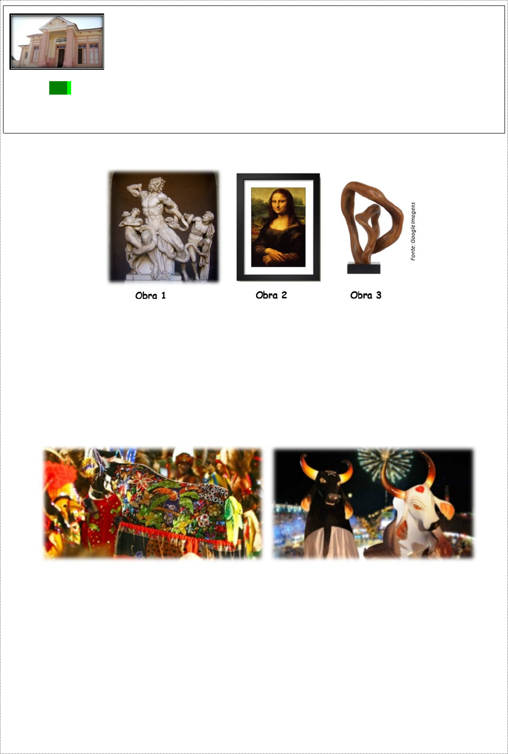“”Educação se constrói com tradição, sabedoria e valores” ESCOLA ESTADUAL “CONSELHEIRO AFONSO PENA” ATIVIDADE COMPLEMENTAR nº01 REANP 1º BIMESTRE/2021 Alu: ____________________________________ Turma: 2° REG Componente Curricular: ARTE Professora Elaine Freire Questão 01 – Observe as obras abaixo: Classificando as obras acima em BIDIMENSIONAL e TRIDIMENSIONAL, temos: A) (1) Bidimensional - (2) Tridimensional - (3) Bidimensional B) (1) Tridimensional - (2) Tridimensional - (3) Bidimensional C) (1) Tridimensional - (2) Bidimensional - (3) Tridimensional ) (1) Bidimensional - (2) Bidimensional - (3) Tridimensional Questão 02 – Observe as imagens: A) As imagens representa o Bumbá-meu-boi. B) As imagens representa o boi da cara preta. C) As imagens representa o festival do boi. D) As imagens representa o carnaval baiano. Questão 03 – Leia as afirmativas abaixo: I - A dança é uma das três mais antigas artes cênicas existentes na Antiguidade, tal como o teatro e a música. II – A dança é uma atividade executada apenas pelos povos brasileiros, em cerimônias, para divertimento e como manifestação artística. Sobre as afirmativas acima, podemos dizer que: A) as afirmativas I e II são verdadeiras. B) apenas a afirmativa II é verdadeira. C) apenas a afirmativa I é verdadeira. D)as afirmativas I e II são falsas. Questão 04 – Leia as afirmativas abaixo: I – O multiculturalismo pode se constituir como um instrumento para a compreensão das diferenças e superação dos estereótipos e preconceitos. II –É pela identidade de um povo que se define a cultura, e pelas múltiplas identidades, o multiculturalismo. Sobre as afirmativas acima, podemos dizer que: A) as afirmativas I e II são verdadeiras e uma completa a outra. B) as afirmativas I e II são verdadeiras e uma não completa a outra. C) apenas a afirmativa I é verdadeira. D)as afirmativas I e II são falsas. Questão 05 – “Esse ritmo que nasce da mistura de estilos musicais, mas que tem suas raízes na cultura africana no Brasil. Tocado com instrumentos de percussão acompanhados de violão e cavaquinho, ele conta a vida e o cotidiano de quem mora nas cidades, principalmente das pessoas mais carentes, sendo considerado uma das principais manifestações culturais brasileiras”. O trecho acima se refere ao A) Bossa nova B) Lundu C) Choro D) Samba Questão 06 –Relacione as colunas. 1- Prólogo 2- Epílogo 3-Rubricas 4-Macrorrubrica: ( )É uma rubrica geral que interessa à peça, ou ao ato e às cenas. ( )são indicações de cena, descrevem o que acontece em cena, se é dia ou noite, o local, etc. ( )é o final, o desfecho e fecha de forma lógica o drama desenvolvido nas cenas anteriores. Ofinal precisa ser aceitável para o espectador e satisfazer de modo inteligente. ( )é um texto inicial usado para situar o leitor do que vai encontrar na peça teatral ou trazer uma introdução aos fatos que ocorrem em seu enredo. A Sequência correta é A)4 – 2 – 3 – 1. B)4 – 3 – 2 – 1. C)4 – 2 – 2 – 3. D)4 – 1 – 2 – 3.
