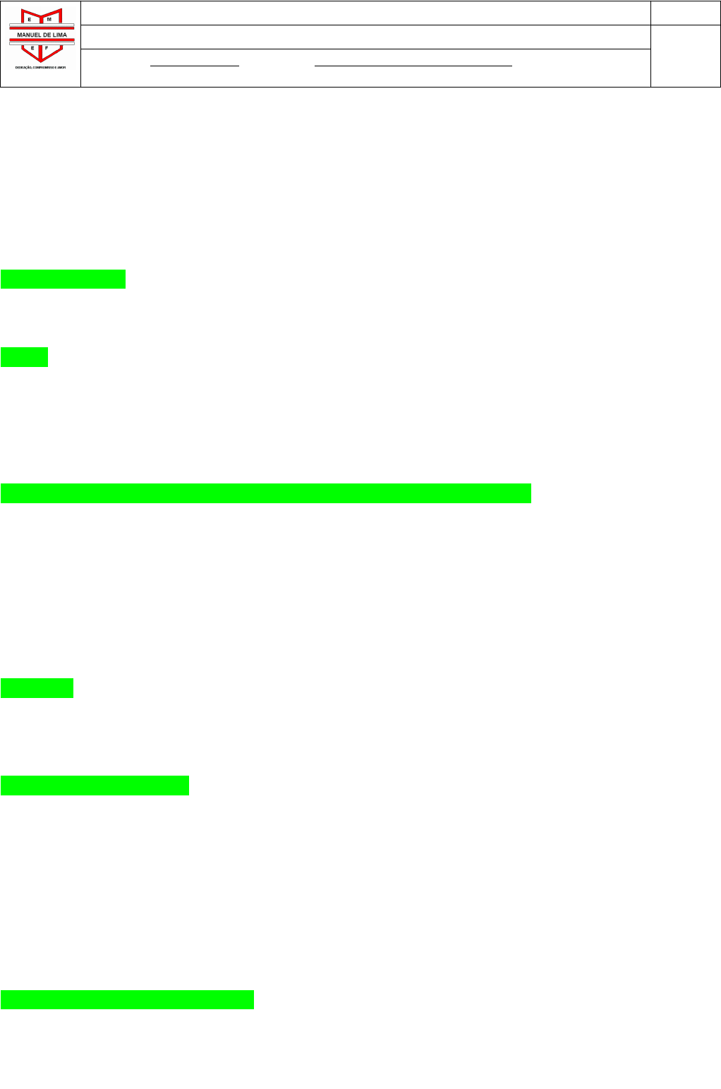 ESCOLA MUNICIPAL DE ENSINO FUNDAMENTAL MANUEL DE LIMA NOTA: ALUNO(A): _____________________________________________ Nº_____ SÉRIE: 7º ANO “U” PROF.: RENATO S. DE ALMEIDA DATA: ___\___\_____ AVALIAÇÃO DE MATEMÁTICA SOBRE ADIÇÃO, SUBTRAÇÃO E MULTIPLICAÇÃO DE NÚMEROS INTEIROS - 1º BIMESTRE 01. Complete: Em uma adição de dois números inteiros, a ordem das _______ não altera a _______. a) somas e parcela b) diferenças e soma c) parcelas e parcela d) parcelas e diferença e) parcelas e soma 02. Complete: O número _______ é o elemento neutro da adição de números inteiros. a) um b) zero c) dois d) cinco e) dez 03. A respeito do produto entre números inteiros, assinale alternativa correta. a) O produto entre dois números inteiros sempre tem resultado positivo. b) O produto entre dois números com sinais diferentes tem resultado negativo. c) O produto entre dois números inteiros com sinais negativos tem resultado negativo. d) O produto entre dois números inteiros com sinais diferentes tem resultado positivo. e) O produto entre dois números com sinais iguais tem resultado negativo. 04. Na multiplicação quando os dois fatores são positivos o sinal do resultado será: a) Menor que b) Negativo c) Maior que d) Multiplicativo e) Positivo 05. Um comerciante fez quatro vendas e teve prejuízo de R$ 15,00 na primeira venda, prejuízo de R$ 5,00 na segunda, lucro de R$ 40,00 na terceira venda e lucro de R$ 12,00 na quarta venda. Podemos calcular o saldo resultante dos quatro negócios efetuados desta maneira: a) -15 + (-5) + 40 + 12 = 32 b) -15 – 5 – 40 – 12 = - 72 c) -15 + 5 – 40 + 12 = - 38 d) 15 – 5 + 40 + (–12) = 38 e) 15 + 5 + 40 + 12 = 72 06. O jogador A ganhou 200 pontos, na 1ª rodada, e perdeu 500 pontos, na 2ª rodada. A sentença matemática correspondente à situação é: a) 200 + (+ 500) = 200 + 500 = 700 b) – 200 + (– 500) = – 200 – 500 = – 700 c) 200 – (– 500) = 200 + 500 = 700 d) 200 + (– 500) = 200 – 500 = – 300 e) – 200 + (+ 500) = – 200 + 500 = 300 07. Determine a subtração de: (-17) - (– 8) = a) -23 b) 9 c) -9 d) 23 e) 20 08. Um submarino encontra-se a 2300 m de profundidade. Depois de algum tempo, estava a 2100 m. Quantos metros este submarino subiu? a) 150 b) -100 c) 200 d) 100 e) -150 09. Em janeiro de determinado ano, uma empresa teve um prejuízo de 5 200 reais, mas em fevereiro do mesmo ano recuperou-se e obteve um lucro de 15 500 reais. Qual foi o lucro dessa empresa nesse bimestre? a) 10 300 b) 15 000 c) -10 300 d) 10 000 e) -10 000 10. Determine o produto de: (+ 8) . (– 6) = a) -13 b) 3 c) 13 d) -48 e) 40 ORIENTAÇÕES AO(A) ALUNO(A) ▪️ A AVALIAÇÃO é composta por 13 questões (3 de identificação + 10 relacionadas ao CAPÍTULO 01); ▪️ Cada questão relacionada ao CAPÍTULO 01 valerá 1 ponto, totalizando 10 pontos; ▪️ Só é permitido que o aluno(a) responda o questionário UMA ÚNICA VEZ. ▪️ Caso o aluno responda mais de uma vez, prevalecerá a MENOR NOTA; ▪️ O(a) aluno(a) terá até o final da aula para realizar A AVALIAÇÃO. Após esse tempo, o sistema não permitirá mais o envio de respostas; ▪️ É obrigatório a permanência do(a) aluno(a) no link da AVALIAÇÃO, de no mínimo 20 minutos. O não cumprimento desse quesito acarretará nas seguintes penalidades: anulação parcial ou total do AVALIAÇÃO; ▪️ Preencher o NÚMERO, NOME COMPLETO (sem abreviações), e marcar sua respectiva TURMA; ▪️ O questionário está dividido por seções; ▪️ As questões são escolhidas de forma aleatória pelo sistema, de acordo com o banco de questões; ▪️ Fique atento a barra de progresso que consta no final da página. Através dela, é possível acompanhar o progresso na resolução das questões, de modo que nenhuma questão poderá ser entregue em branco; ▪️ Após o término, clicar em ENVIAR. NÃO APARECERÁ NOTA OU GABARITO, apenas a confirmação de entrega da AVALIAÇÃO; ▪️ Após envio não é possível alterar as respostas; ▪️ Vou querer a resolução das 6 (seis) últimas questões no caderno, pois solicitarei o envio das mesmas posteriormente. BOA PROVA!
