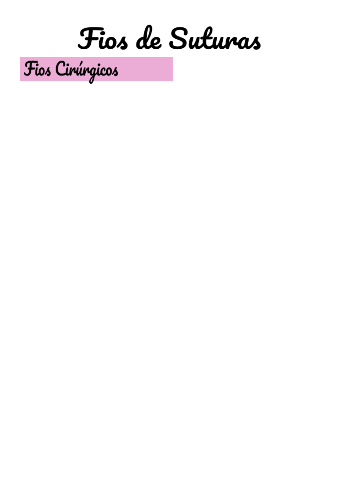 - Os fios cirúrgicos representam um dos componentes para a confecção de suturas e nós. - Podem ser compostos por material de várias origens, que podem ser orgânicos ou sintéticos, apresentar configurações e características diferentes, e seu uso ser norteado de acordo com a sua indicação em diferentes situações e tecidos orgânicos. Características dos Fios - Absorção de fluidos: é a capacidade de um fio de absorver fluido quando estiver totalmente imerso nesse meio. ° O ideal é que o fio tenha uma baixa absorção de fluido; - Capilaridade: é a capacidade de um fio absorver fluido quando apenas uma de suas extremidades estiver imersa em um meio líquido; - Configuração física: é relacionada com a configuração física do fio, que pode ser composto por um ou mais filamentos; - Aderência bacteriana: é a capacidade do fio de promover a aderência de bactérias a sua superfície, favorecendo a instalação do processo infeccioso; - Diâmetro: é o calibre do fio determinado em milímetros. ° Comercialmente isto é expresso com uma numeração específica utilizando-se o número de zeros. ° Quanto maior o número de zeros, menor é o fio. ° Esta característica também se relaciona com a resistência do material, portanto nem todo fio com a mesma numeração apresenta o mesmo calibre. ° A numeração dos fios varia de 12-0 (de 0,001 a 0,01 mm) a 3 (de 0,60 a 0,80 mm) - Força tênsil: pode ser definida como a relação entre a somatória das forças necessárias para romper o fio e o seu diâmetro; - Força do nó: é a força necessária para que um nó escorregue, estando relacionada com o coeficiente de atrito do fio; - Elasticidade: é a capacidade de distensão de um fio e seu retorno à forma original; - Plasticidade: a capacidade do fio de se moldar à nova forma após ser tracionado. - Memória: pode ser definida como a capacidade do fio de retornar a sua forma original. - Pliabilidade: representa a facilidade do cirurgião em manusear o fio; - Coeficiente de atrito: é a capacidade do fio em deslizar pelos tecidos. ° Quanto menor o coeficiente de atrito, maior a facilidade de deslizar pelos tecidos, entretanto também é maior a possibilidade de desfazer o nó; - Reação tecidual: é a capacidade de um fio em induzir uma reação tecidual, ocasionada pelo tipo de material utilizado no fio, pelo trauma da passagem da agulha e pela isquemia provocada pela confecção do fio. - Antigenicidade e alergenicidade: são características inerentes ao tipo de material que compõe o fio, bem como a reação orgânica do paciente. Fio ideal - O fio “ideal” deve ter: ° Um calibre fino e regular, causando pouco dano tecidual. ° Apresentar uma grande resistência à torção e à tração. ° Boa pliabilidade, ser flexível, mas não ser elástico. ° Apresentar uma baixa taxa de indução de reação tecidual e ser fácil de esterilizar. ° Baixa memória e capilaridade. Classificação - Absorvíveis ou não absorvíveis - Os fios absorvíveis podem ser de origem animal (ou biológico) ou sintéticos, sendo que os primeiros são absorvidos em curto espaço de tempo, enquanto os sintéticos são absorvidos em período intermediário ou longo, de acordo com sua origem. - Por definição, os fios não absorvíveis permanecem por tempo indeterminado nos tecidos, apesar de sofrerem alterações em sua estrutura. - É um fio produzido a partir de colágeno tratado e preservado, de origem animal. - É monofilamentar torcido, cortado em fitas e esterilizado por radiação iônica. - O categute simples é absorvido entre cinco e sete dias e o cromado, entre 15 e 20 dias. - Possui alta reação tecidual inflamatória, sendo maior no categute simples. - Sua absorção é irregular e acontece por fagocitose pelos neutrófilos e macrófagos, por digestão pelas enzimas proteolíticas dos lisossomos. - Possui baixa força tênsil, estando mais sujeito a deiscência, e, devido a sua alta capilaridade, o nó tende a afrouxar, principalmente em tecido edemaciado. - É indicado para tecidos com pouca resistência, ligaduras de vasos sanguíneos e vias urinárias. - Sua contra indicação está relacionada com o uso sob tensão, procedimentos neurológicos ou cardiovasculares. - Não deve ser utilizado em aponeuroses, tecido edemaciado e contaminado. - É um fio absorvível sintético, multifilamentar, sendo absorvido entre 40 e 70 dias. - Perde a maior parte da força tênsil em torno de 28 dias. - Sua absorção ocorre por hidrólise e possui boa pliabilidade. - É um fio mais estável e possui pequena reação inflamatória. - A aderência bacteriana é baixa e pode ser usada em tecidos infectados. - Sofre ação da lípase e amilase, não devendo ser usado no pâncreas. - Existe uma apresentação comercial que recebe um revestimento sintético conhecido como Dexon Plus ou Dexon II. - Sua utilização é indicada praticamente para todos os tecidos, sendo que seu uso em aponeurose é controverso devido à perda de sua resistência tênsil. - É contraindicado para neurocirurgias e cirurgias cardiovasculares. - Apresenta características similares às do ácido poliglicólico, sendo composta por ácido glicólico (90%) e ácido lático (10%), que aumenta sua resistência tênsil por dificultar a absorção de fluidos. - É absorvido por hidrólise, de forma similar ao ácido poliglicólico. ° É absorvido entre 30 e 40 dias. - Possui boa pliabilidade. - Tem as mesmas indicações do ácido poliglicólico e é contraindicado para oftalmologia, neurologia e cirurgia cardiovascular. - É um fio sintético monofilamentar produzido a partir do ácido poliglicólico e da épsilon-caprolactona e absorvido por hidrólise. - Apresenta boa pliabilidade. - Força tênsil regular. - Baixa memória e pouca reação tecidual. - É absorvido entre 90 e 120 dias e tem indicações de uso similares às dos fios anteriores. - As contraindicações de uso são: aponeurose, microcirurgia, neu