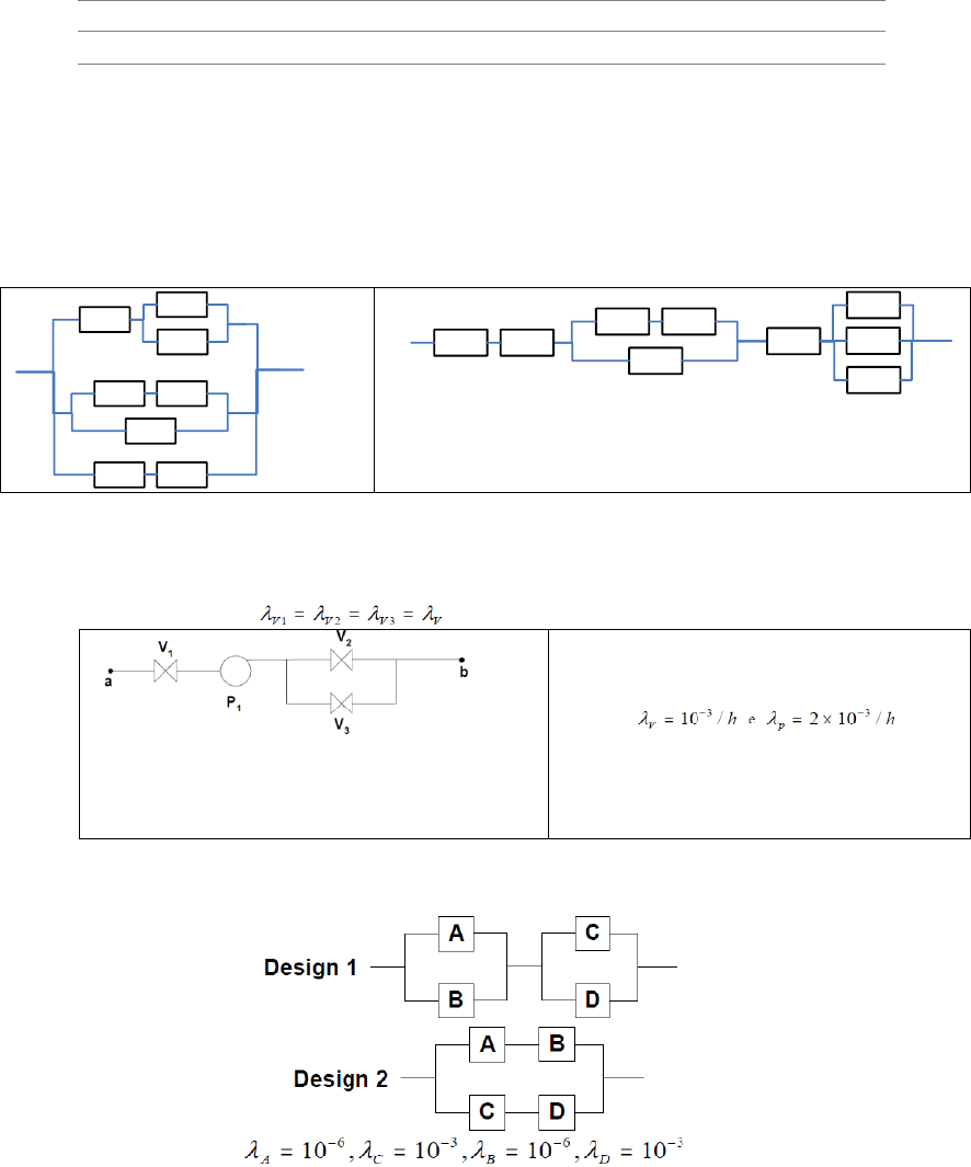 UNIFBV CURSO: ENG MECÂNICA DISCIPLINA: PLANEJ. PRODUÇÃO E MANUTENÇÃO PROFESSOR: HELDER DINIZ LISTA II – Análise da Confiabilidade de Sistemas 1 1. Em um sistema em série constituído por 30 componentes idênticos, qual deveria ser a confiabilidade mínima necessária em cada um desses componentes para que se obtenha uma confiabilidade total de 92%? 2. Calcule a confiabilidade do sistema nas figuras abaixo: 0,68 0,68 0,95 0,85 1 0,62 0,77 0,75 0,92 0,94 0,93 0,97 0,985 0,75 0,75 0,96 0,75 3. Considere o sistema de bombeamento mostrado na figura a seguir. A função do sistema é bombear água do ponto a ao ponto b. O tempo de falha para todas as válvulas e para a bomba podem ser representados por distribuições Exponenciais com taxas da falha a) Determine a função de confiabilidade para o sistema de bombeamento; b) Se , e sabendo que este sistema tem operado (sem falhas) por 10 horas, qual é a probabilidade que o mesmo opere sem falhas por um período adicional de 10 horas? 4. Compare o design 1 com o design 2 mostrados a seguir: (a) Assumindo que os componentes são não-reparáveis, qual dos designs acima mostrados é o melhor? UNIFBV CURSO: ENG MECÂNICA DISCIPLINA: PLANEJ. PRODUÇÃO E MANUTENÇÃO PROFESSOR: HELDER DINIZ LISTA II – Análise da Confiabilidade de Sistemas 2 5. No sistema mostrado a seguir, qual é a probabilidade de que não ocorram falhas durante o primeiro ano de operação? 6. Considere um sistema no qual duas bombas P1 e P2 com capacidades de 30 gal/min e 40 gal/min, respectivamente, estão (fisicamente) conectadas em paralelo. Uma saída de 50 gal/min é requerida para este sistema. As confiabilidades destas bombas para um dado período operacional são para bombas P1 e P2, respectivamente. (a) Determine o diagrama de blocos deste sistema (b) Estime a confiabilidade do sistema (c) Faça a arvore de Falhas 7. Considere um sistema de bombeamento no qual duas válvulas estão instaladas em série com o objetivo de cortar o fluxo quando necessário. As válvulas são abertas manualmente e quando falham, as mesmas falham abertas. As confiabilidades destas válvulas para uma determinada missão correspondem a . (a) Determine o diagrama de blocos deste sistema (b) Estime a confiabilidade do sistema (c ) Faça a arvore de Falhas 8.Um certo tipo de foguete utilizado no transporte de satélites para a orbita terrestre requer que dois de suas quatro turbinas operem satisfatoriamente para que o foguete atinja a orbita da Terra. Se cada turbina possui uma confiabilidade de 0.97, estime a probabilidade de sucesso do foguete alcançar a orbita. 9.O tempo de falha para dois componentes em serie segue uma distribuição de Weibull com α = 115 hs e β = 1.8 e α = 160 hs e β = 2. Determine: (a) Confiabilidade do sistema em 40hs (b) Probabilidade de Falha em 40hs. 10.Em um processo de transferencia de um Oleo, existe uma bomba para transportar o Oleo e em seguida um Filtro para remover as impurezas do Processo. Considere esses componentes em Serie. Suas taxas de Falhas seguem uma distribuição de Weibull com α = 115 hs e β = 1.8 e α = 105 hs e β = 1.9. Determine: a)Confiabilidade do sistema em 40hs b)Probabilidade de Falha em 40hs. UNIFBV CURSO: ENG MECÂNICA DISCIPLINA: PLANEJ. PRODUÇÃO E MANUTENÇÃO PROFESSOR: HELDER DINIZ LISTA II – Análise da Confiabilidade de Sistemas 3 11.Um sistema é formado por quatro componentes em série cada um dos quais possuindo tempo de falha distribuído de acordo com Weibull e com parâmetros fornecidos na seguinte tabela. Estime a Confiabilidade para um tempo de 10 horas.