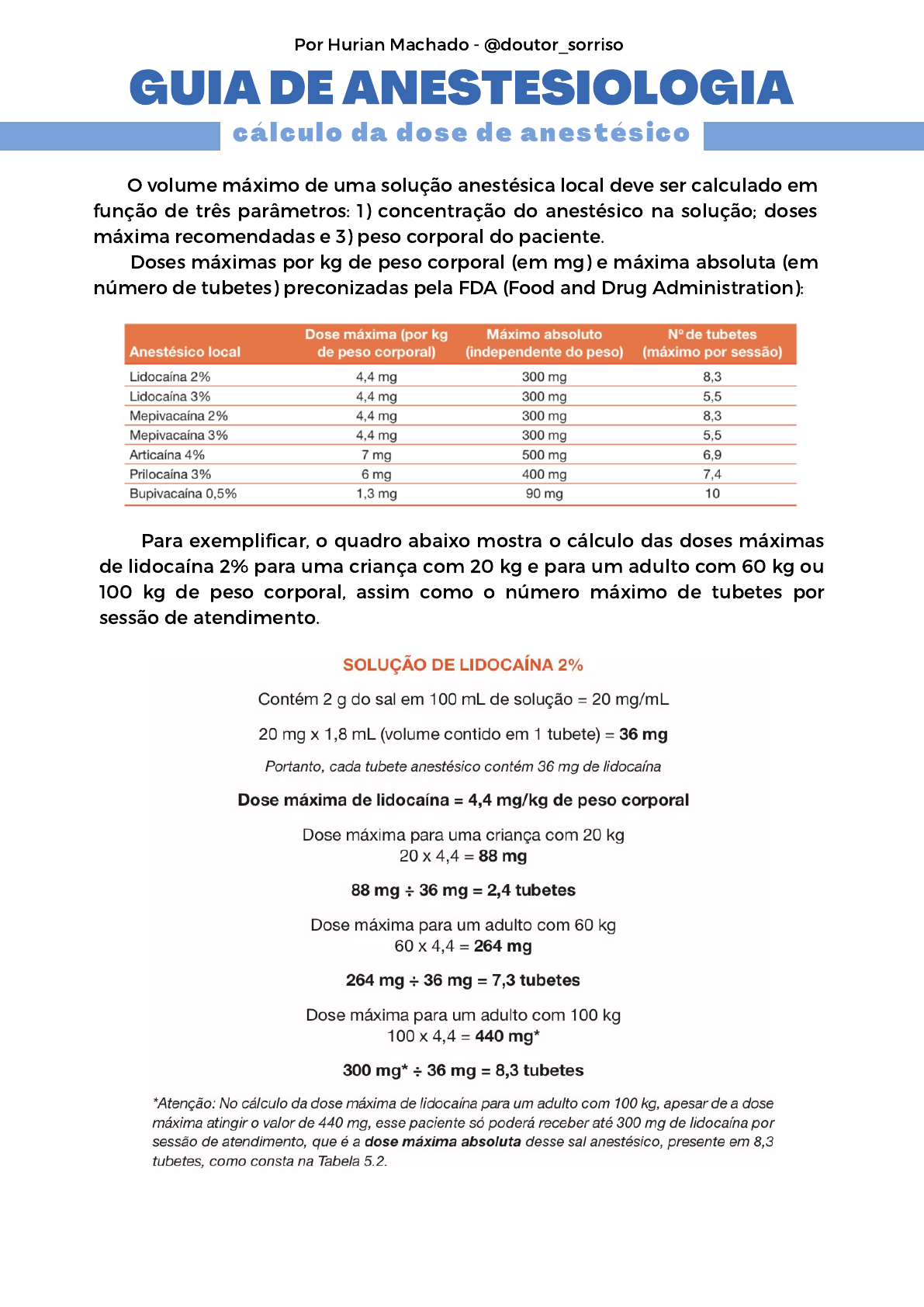c á l c u l o d a d o s e d e a n e s t é s i c o O volume máximo de uma solução anestésica local deve ser calculado em função de três parâmetros: 1) concentração do anestésico na solução; doses máxima recomendadas e 3) peso corporal do paciente. Doses máximas por kg de peso corporal (em mg) e máxima absoluta (em número de tubetes) preconizadas pela FDA (Food and Drug Administration): GUIA DE ANESTESIOLOGIA Por Hurian Machado - @doutor_sorriso Para exemplificar, o quadro abaixo mostra o cálculo das doses máximas de lidocaína 2% para uma criança com 20 kg e para um adulto com 60 kg ou 100 kg de peso corporal, assim como o número máximo de tubetes por sessão de atendimento. R e f e r ê n c i a sR e f e r ê n c i a sR e f e r ê n c i a s DE ANDRADE, Eduardo Dias. Terapêutica medicamentosa em odontologia. Artes Médicas Editora, 2014. Por Hurian Machado - @doutor_sorriso Oi, aqui é o Hurian! Espero que esse resumo seja útil e te ajude nos estudos. Uma dica: tenha ele no celular, para consultar sempre que quiser e precisar. Esse é um resumo breve e específico de um assunto da disciplina de cirurgia/ anestesiologia. Caso você tenha gostado desse material, eu tenho 27 apostilas super completas de diversas disciplinas do curso de Odontologia que podem te ajudar nos estudos. Essas apostilas são ideias para acadêmicos que estão na graduação e para cirurgiões- dentistas que buscam aprovação em concurso público. Quer saber mais sobre como adquirir o material completo? Me manda uma mensagem lá no Instagram (@doutor_sorriso) ;)