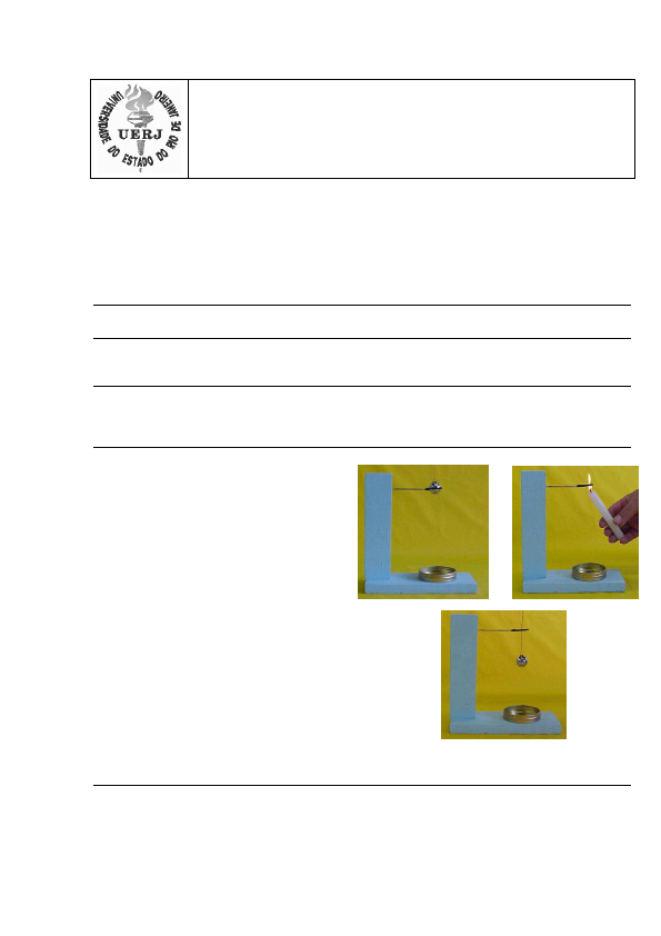 Instituto de Física Armando Dias Tavares Departamento de Física Aplicada e Termodinâmica Com Ciência Física Anel de Gravesande _______________________________________________________________________ Adelino Carlos Ferreira de Souza Jorgina Rosete Teixeira Paula de Oliveira Ribeiro Raquel Rodrigues Silva Vitoria Ferreira Fantoni Waleska Werneck Princípio Físico Dilatação linear. Objetivo Mostrar que o metal aquecido se dilata. Material Utilizado Esquema do Experimento 1 base de madeira (21 x 9 x 2) cm; 1 suporte de madeira (20 x 5 x 2) cm; 15cm de arame de 3 mm de diâmetro; 60cm de fio de cobre de 1mm de diâmetro; 1 esfera de metal ou bilha; 1 vela; Fósforos. Obs: enrolar o arame em formato de aro ou anel, com o diâmetro da esfera de metal a ser utilizada Funcionamento Verifica-se, inicialmente, que não é possível passar a esfera através do aro de metal. Porém, após aquecer o aro de metal, a esfera passa facilmente. (1) (3) (2) Explicação O aumento da temperatura, causado pela chama da vela no aro de metal, aumenta a agitação térmica das partículas do metal utilizado o que provoca o aumento do diâmetro do aro, facilitando, assim, a passagem da esfera.