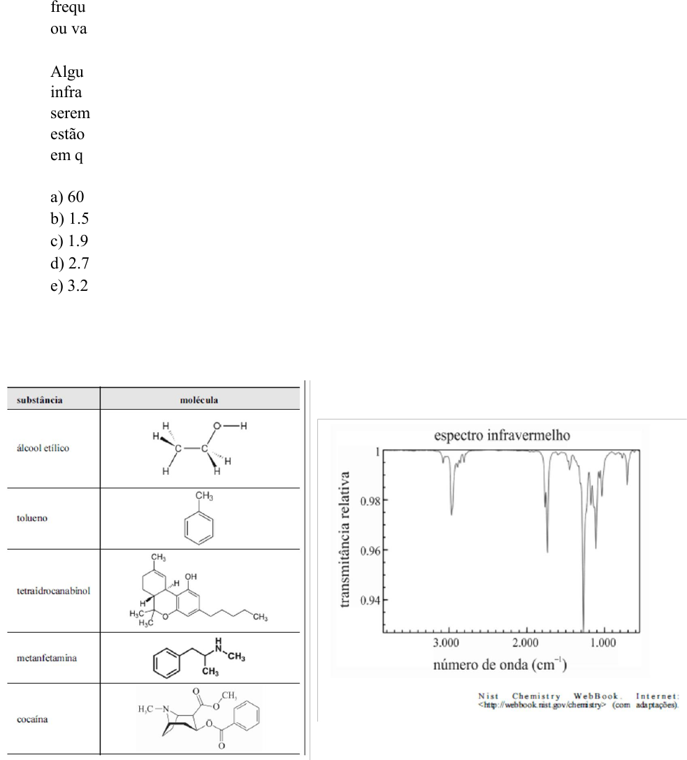 Espectroscopia de Infravermelho Nome: ________________________________________________ Data: __/__/____ 1. Só haverá absorção de luz infravermelha por uma molécula se: a) houver coincidência de frequências ou energias da luz incidente com a frequência de um modo normal de vibração da molécula. b) a luz incidente gerar ou variar o momento de dipolo elétrico na molécula. c) a molécula estiver no estado fundamental. d) a molécula estiver no estado excitado. e) houver coincidência de frequências ou energias da luz incidente com a frequência de um modo normal de vibração da molécula e a luz incidente gerar ou variar o momento de dipolo elétrico na molécula. 2. Algumas vibrações geram bandas e picos característicos no espectro de infravermelho, sendo facilmente identificados com um pouco de prática. Por serem muito abundantes na natureza, bandas associadas a vibrações da hidroxila estão presentes em muitos compostos analisados. Assinale a opção que demonstra em que região do espectro do infravermelho se encontram as bandas da hidroxila. a) 600 cm-1 a 1.500 cm-1 b) 1.500 cm-1 a 1.900 cm-1 c) 1.900 cm-1 a 2.300 cm-1 d) 2.700 cm-1 a 3.300 cm-1 e) 3.200 cm-1 a 3.700 cm-1 3. Um perito, por meio de espectroscopia de absorção molecular no infravermelho, analisou os padrões de solventes e das substâncias listadas na tabela precedente. A figura mostra um dos espectros obtidos após essa análise. Considerando-se essas informações, é correto afirmar que: a) O espectro mostrado é o da cocaína e apresenta bandas características relativas à vibração de estiramento dos grupos carbonila dos ésteres em aproximadamente 1.710 cm-1 e 1.730 cm-1. b) O espectro mostrado é do tetraidrocanabinol misturado ao etanol - as bandas na região de 3.000 cm-1 são relativas ao etanol e aquelas abaixo de 2.000 cm-1 são referentes ao tetraidrocanabinol. c) A banda em torno de 3.000 cm-1, relativa às vibrações de estiramento C-C, confirma que o espectro mostrado é do tolueno. d) A banda em torno de 735 cm-1 refere-se à água adsorvida na amostra. e) O espectro apresentado refere-se à metanfetamina.