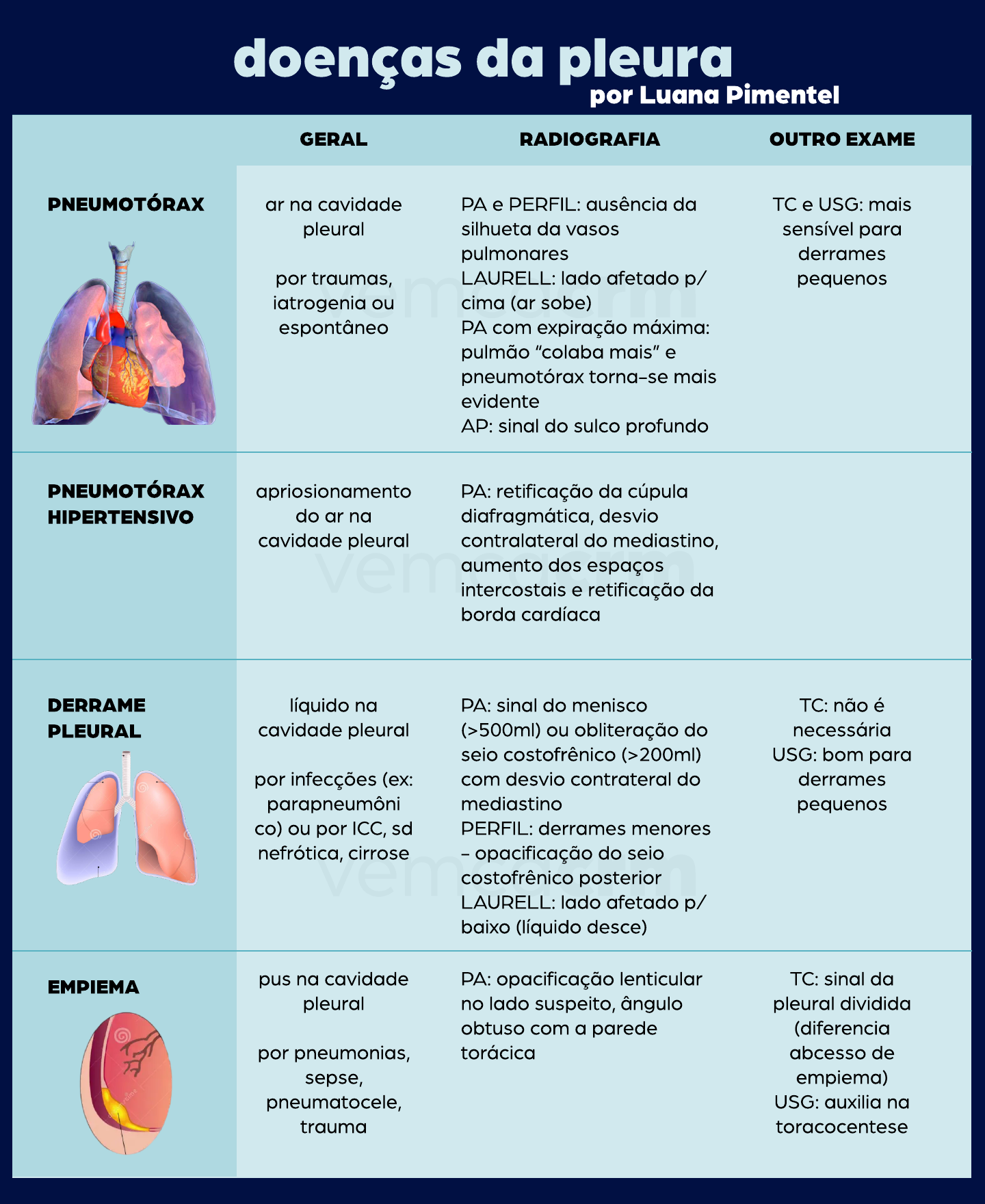 doenças da pleura PNEUMOTÓRAX PNEUMOTÓRAX HIPERTENSIVO DERRAME PLEURAL EMPIEMA GERAL RADIOGRAFIA OUTRO EXAME ar na cavidade pleural por traumas, iatrogenia ou espontâneo PA e PERFIL: ausência da silhueta da vasos pulmonares LAURELL: lado afetado p/ cima (ar sobe) PA com expiração máxima: pulmão “colaba mais” e pneumotórax torna-se mais evidente AP: sinal do sulco profundo TC e USG: mais sensível para derrames pequenos líquido na cavidade pleural por infecções (ex: parapneumôni co) ou por ICC, sd nefrótica, cirrose PA: sinal do menisco (>500ml) ou obliteração do seio costofrênico (>200ml) com desvio contrateral do mediastino PERFIL: derrames menores - opacificação do seio costofrênico posterior LAURELL: lado afetado p/ baixo (líquido desce) TC: não é necessária USG: bom para derrames pequenos pus na cavidade pleural por pneumonias, sepse, pneumatocele, trauma PA: opacificação lenticular no lado suspeito, ângulo obtuso com a parede torácica TC: sinal da pleural dividida (diferencia abcesso de empiema) USG: auxilia na toracocentese apriosionamento do ar na cavidade pleural PA: retificação da cúpula diafragmática, desvio contralateral do mediastino, aumento dos espaços intercostais e retificação da borda cardíaca por Luana Pimentel vemcacrm vemcacrm vemcacrm
