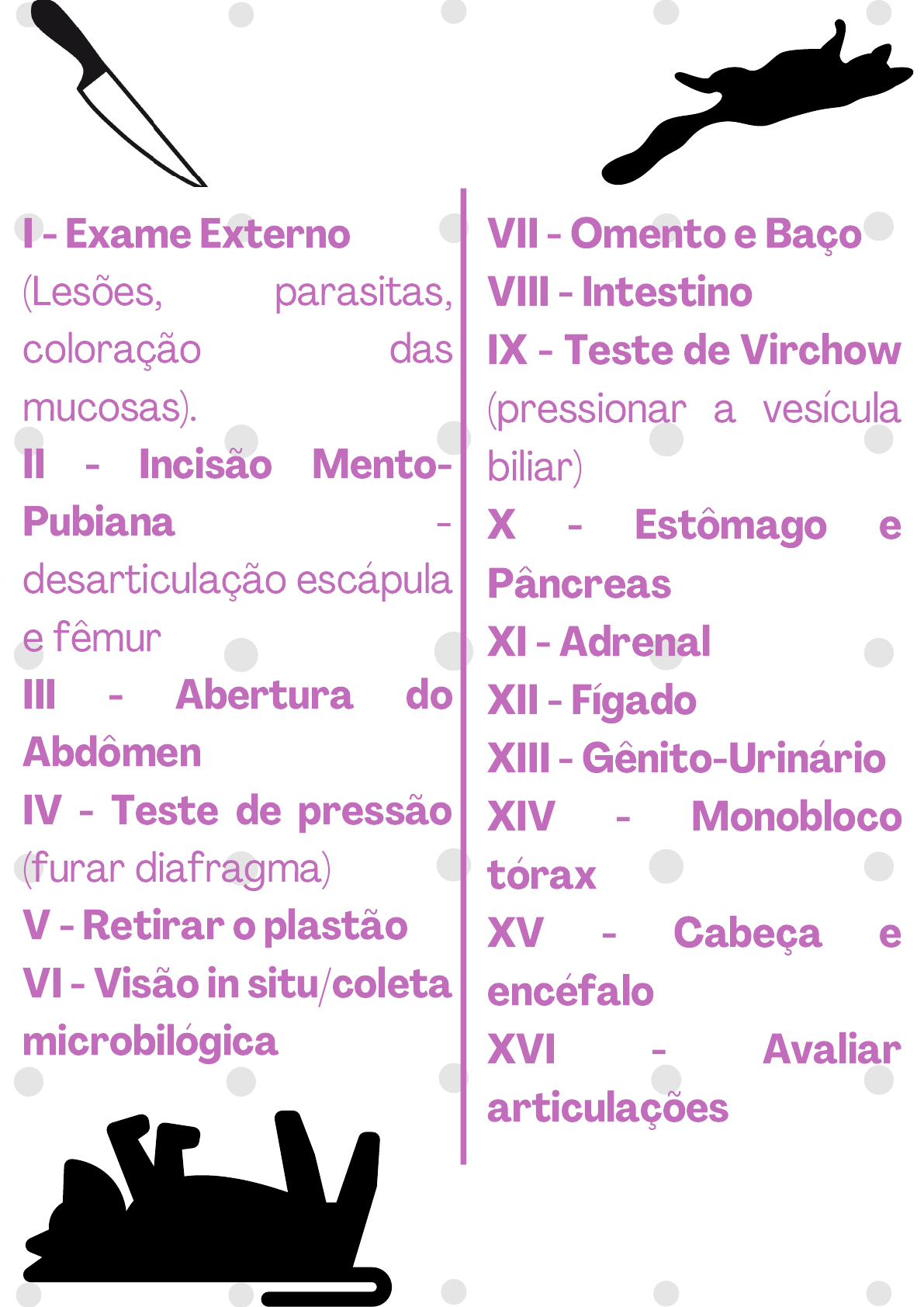 Roteiro de Necropsia I - Exame Externo (Lesões, parasitas, coloração das mucosas). II - Incisão Mento- Pubiana - desarticulação escápula e fêmur III - Abertura do Abdômen IV - Teste de pressão (furar diafragma) V - Retirar o plastão VI - Visão in situ/coleta microbilógica VII - Omento e Baço VIII - Intestino IX - Teste de Virchow (pressionar a vesícula biliar) X - Estômago e Pâncreas XI - Adrenal XII - Fígado XIII - Gênito-Urinário XIV - Monobloco tórax XV - Cabeça e encéfalo XVI - Avaliar articulações