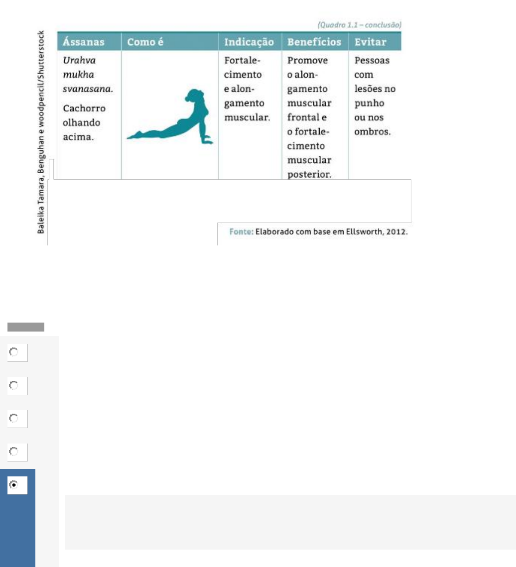 Questão 1/10 - Atividades Físicas Alternativas Leia o quadro a seguir: Após esta avaliação, caso queira ler o texto integralmente, ele está disponível em: SCOPEL, A. J. S. G. et al. Atividades físicas alternativas: práticas corporais de aventura. Curitiba: InterSaberes, 2020. p. 41. Considerando o quadro e os conteúdos do livro-base Atividades físicas alternativas: práticas corporais de aventura sobre os elementos da atividade alternativa denominada ioga, assinale a alternativa que apresenta a definição correta das ássanas: Nota: 10.0 A São técnicas de respiração. B São linhas espirituais seguidas na prática da ioga. C São movimentos lineares e lentos. D São ritmos de meditação. E São posturas de ioga. Você acertou! Esta é a alternativa correta. De acordo com o livro-base: “Como espiritualidade, está relacionada ao hinduísmo e ao budismo; porém, como prática corporal, está associada à linha do hata-ioga, ou seja, ao emprego de técnicas de respiração (pranayamas), posturas de ioga (ássanas) e meditação para alcançar o equilíbrio físico e mental” (livro-base, p. 40). Questão 2/10 - Atividades Físicas Alternativas Atente para a citação: “Em decorrência de seu potencial adaptativo, o parkour pode ser praticado em qualquer ambiente”. Após esta avaliação, caso queira ler o texto integralmente, ele está disponível em: SCOPEL, A. J. S. G. et al. Atividades físicas alternativas: práticas corporais de aventura. Curitiba: InterSaberes, 2020. p. 118. Considerando a citação e os conteúdos do livro-base Atividades físicas alternativas: práticas corporais de aventura sobre as áreas e espaços no ensino e treino do parkour, assinale a alternativa correta: Nota: 10.0 A Lagos e riachos. B Academia de paintball ou de escalada. C Parques, praças, academias, entre outros pontos da cidade. Você acertou! Esta é a alternativa correta. De acordo com o livro-base: “[...] torna-se possível identificar espaços e equipamentos para praticá-las. Portanto, parques, praças, academias, entre outros pontos da cidade [são espaços utilizados para o treino e a prática do parkour]” (livro-base, p. 118). D Circo e arenas. E Campo de futebol, pistas de atletismo e ginásio de ginástica artística. Questão 3/10 - Atividades Físicas Alternativas Leia a citação: “O parkour tem como finalidade possibilitar movimentação ou percursos por meio de técnicas próprias de deslocamento e transposição de obstáculos em qualquer ambiente”. Após esta avaliação, caso queira ler o texto integralmente, ele está disponível em: SCOPEL, A. J. S. G. et al. Atividades físicas alternativas: práticas corporais de aventura. Curitiba: InterSaberes, 2020. p. 92. Considerando a citação e os conteúdos do livro-base Atividades físicas alternativas: práticas corporais de aventura sobre a história do parkour e a raiz do seu método, é correto afirmar que: Nota: 10.0 A Teve sua raiz nas técnicas militares. B Teve sua raiz no método natural de Educação Física. Você acertou! Esta é a alternativa correta. De acordo com o livro-base: “A história dessa modalidade tem raízes no Método Natural de Educação Física, desenvolvido por Georges Hébert.” (livro-base, p. 92). C Teve sua raiz na prática do alpinismo. D Teve sua raiz na ginástica artística. E Teve sua raiz nas atividades circenses. Questão 4/10 - Atividades Físicas Alternativas Leia o fragmento de texto: "A navegação é uma ferramenta altamente eficaz para o tratamento de qualquer temática, além de desenvolver autonomia, autoconfiança e responsabilidade, como também favorecer atitudes de cooperação, solidariedade [...]". Após esta avaliação, caso queira ler o texto integralmente, ele está disponível em: SCOPEL, A. J. S. G. et al. Atividades físicas alternativas: práticas corporais de aventura. Curitiba: InterSaberes, 2020. p. 77. Considerando o fragmento de texto e os conteúdos do livro-base Aspectos físicas alternativas: práticas corporais de aventura sobre a corrida de orientação realizada como atividade de aprendizagem da navegação, assinale a alternativa correta: Nota: 10.0 A São provas de corrida realizadas em área urbana como ruas e avenidas nas quais o participante tem a opção de escolher o seu percurso. B Consiste em realizar um percurso predeterminado no menor tempo possível, sendo obrigatório registar a passagem por pontos estabelecidos. Você acertou! "Corrida de orientação: Consiste em realizar um percurso no menor tempo possível, desde a saída até a chegada, passando por diferentes controles ou balizas. Emprega-se um mapa, uma bússola e um cartão de controle, este último deve conter ao final a marcação de todos os pontos para garantir que se passou pelos diferentes lugares estabelecidos, essa marcação poderá ser por meio de um picotador manual ou eletrônico" (livro-base, p. 77). C São realizadas com a orientação de um técnico de navegação durante todo o percurso, pois os participantes não podem utilizar acessórios como mapas e bússolas. D Caracteriza-se por uma corrida em montanhas com o percurso marcado por subidas, descidas e obstáculos naturais. E Consiste em uma prova realizada com os olhos vendados, na qual o participante deve seguir a orientação de um técnico. Questão 5/10 - Atividades Físicas Alternativas Atente para a citação: “A maioria dos movimentos no parkour é realizada durante uma corrida e quase tudo pode ser transformado em obstáculos”. Após esta avaliação, caso queira ler o texto integralmente, ele está disponível em: SCOPEL, A. J. S. G. et al. Atividades físicas alternativas: práticas corporais de aventura. Curitiba: InterSaberes, 2020. p. 106. Considerando a citação e os conteúdos do livro-base Atividades físicas alternativas: práticas corporais de aventura, assinale a alternativa que apresenta corretamente os obstáculos que podem ser utilizados na prática do parkour: Not