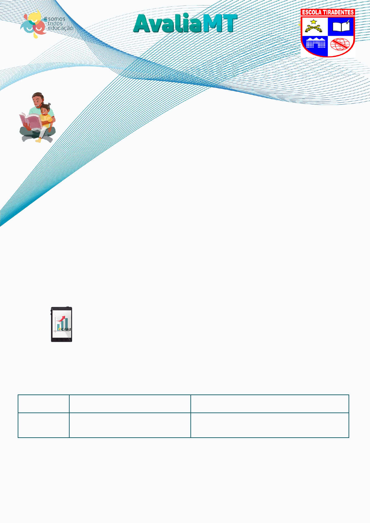 AVALIAÇÃO DIAGNÓSTICA 2021 Senhores Pais e/ou Responsáveis, A Seduc-MT, por meio da Secretaria Adjunta de Gestão Educacional, vem orientar a aplicação da Avaliação Diagnóstica - 2021 que será realizada no dia 25 de maio de 2021. O objetivo desta avaliação é verificar as aprendizagens dos estudantes do ensino fundamental e do ensino médio, de modo a analisar o que eles já aprenderam e o que ainda precisam aprender. Os resultados da avaliação serão utilizados pelos professores no planejamento de ações interventivas para que as dificuldades dos estudantes possam ser minimizadas. A prova será disponibilizada na versão digital, os pais e/ou responsáveis deverão acessar os cadernos de provas na plataforma do Caed, através do seguinte link: https://avaliacaoemonitoramentomatogrosso.caeddigital.net/ Importante: O login e a senha de acesso é o número do cadastro do aluno no Sistema SigEduca. Esse número é o mesmo que compõem o email do estudante. Os cadernos das provas estão organizados da seguinte maneira: ENSINO FUNDAMENTAL - INÍCIO 08H00MIN Anos Número de questões Disciplinas a serem avaliadas 7º ao 9º 52 questões Língua Portuguesa e Matemática. https://avaliacaoemonitoramentomatogrosso.caeddigital.net/ ENSINO MÉDIO/VESPERTINO – INÍCIO 14H00MIN ENSINO MÉDIO/NOTURNO – INÍCIO 20H00MIN Anos Número de questões Disciplinas a serem avaliadas 1º ao 3º 52 questões Língua Portuguesa e Matemática. ORGANIZAÇÃO DO TEMPO PARA REALIZAÇÃO DA AVALIAÇÃO INFORMAMOS AINDA QUE NÃO HAVERÁ AULA DEVIDO A APLICAÇÃO DO AVALIA MT. APLICAÇÃO TURMAS DURAÇÃO DA PROVA PREENCHIMENTO DO GABARITO TOTAL DE ITENS DISCIPLINAS A SEREM AVALIADAS 1º Dia 7º ao 9º ano (EF) 3 horas 20 min. 52 Língua Portuguesa e Matemática 1º Dia 1º ao 3º ano (EM) 3 horas 20 min. 52 Língua Portuguesa e Matemática
