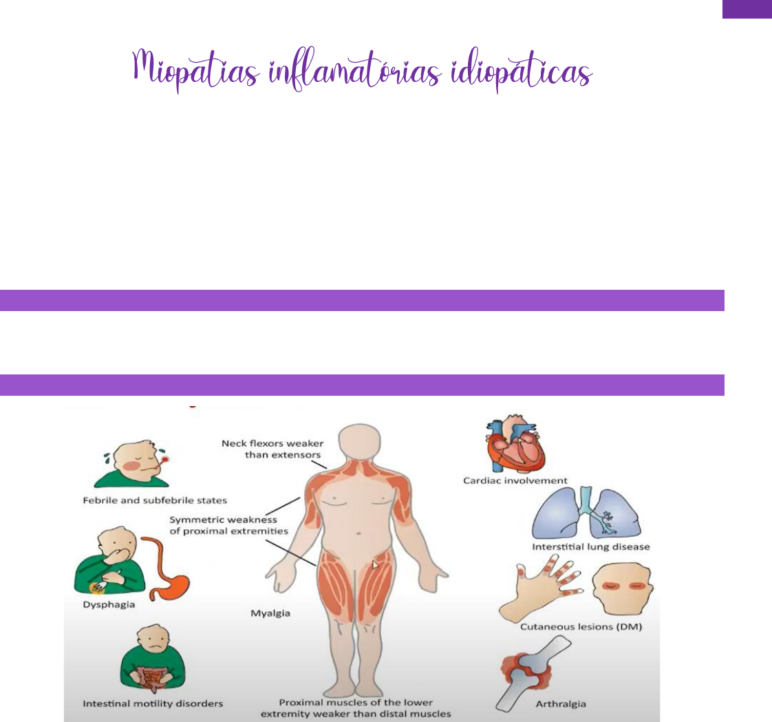 1 Reumatologia Izadora Bohier – medUfes 103 • Grupo heterogêneo que acomete principalmente a musculatura esquelética, sendo a fraqueza muscular a manifestação clínica mais frequente • Manifestações extra articulares: pele, pulmão, articulações, coração, TGI o Dermatomiosite – DM o Polimiosite – PM o Miopatia por corpúsculo de inclusão (MCI) o Miopatia necrotizante imune mediada (MNIM) o Sobreposição – LES, ES, Síndrome de Sjogren, artrite reumatoide, síndrome anti sintetase ETIOPATOGENIA • Indivíduos com predisposição genética, quando são infectados com vírus, bactérias, tabagismo, sílica, drogas, química, radiação → células T e B, citocinas, autoanticorpos, macrófagos → manifestações clínicas MANIFESTAÇÕES CLÍNICAS • Fraqueza muscular o Insidiosa ou subaguda, progressiva o Proximal e simétrica da musculatura escapular e pélvica (fraqueza distal → MCI ou fase tardia) o Músculo estriado da orofaringe e musculatura torácica (disfagia e aspiração) o Fraqueza do m. extensor do pescoço – cabeça caída o Mialgia • Manifestações cutâneas o Áreas fotossensíveis, eritematosas, edemaciadas e por vezes pruriginosas o Pápulas de Gottron → manchas hiperemiadas em cima das articulações metacarpo falangianas e interfalangianas o Sinal de Gottron → mesma manchas hiperemiadas, mas sobre o joelho o Heliótropo → eritema violáceo (parece que o paciente passou uma sombra violeta bem clarinha nas pálpebras) o Sinal do V → região de fotos sensibilidade na região do colo o Sinal do Xale → área de hiperemia (como se a paciente estivesse usando um xale no local) o Poiquilodermia o Hemorragia periungueal e hipertrofia cuticular 2 Reumatologia Izadora Bohier – medUfes 103 o Vasculites o Mãos de mecânico o Calcinose • Calcinose o Mais frequente DM juvenil: 20-40% (20% dos adultos com DM) o Depósito de sais de cálcio em pele, tecido subcutâneo, fáscia, tendão, músculo esquelético o Trauma e inflamação X isquemia vascular X desregulação dos mecanismos de cálcio e fósforo X dano mitocondrial nas células musculares 3 Reumatologia Izadora Bohier – medUfes 103 • Articular o Poliartrite simétrica: IFPs, MCFs, punhos e joelhos o Não erosiva o Anti Jo1 • Gastrointestinal o M. estriado (1/3 superior do esôfago) e m. orofaríngeo o Disfagia proximal o Disfonia o Dismotilidade esofágica o Pneumonia aspirativa • Vascular o Reynaud • Pulmonar o Miosite por sobreposição (Sd Antissintetase) e DM o Pode proceder a manifestação muscular em 20% o Pneumonia intersticial não específica (PINE) o Pneumonia em organização (PO) e pneumonia intersticial usual (PIU) • Cardíaca o Epicárdio (raro) - Pericardite - Derrame pericárdico - Tamponamento o Miocárdio (mais frequente) - Miocardite - Cardiomiopatia - Distúrbios de condução - Arritmias SV o Endocárdio - Espessamento valvar - Regurgitação o Coronárias - Aterosclerose 4 Reumatologia Izadora Bohier – medUfes 103 DIAGNÓSTICO • Autoanticorpos o Diagnóstico o Órgão envolvido o Risco de neoplasia o Doença refratária o Prognóstico • AC miosite associado o LES, ES, Síndrome de Sjogren, DMTC o Anti-U1RNP (20-30%): DMTC o PM-Sci: DM ou PM/ES (50%) o Anti-Ku: DM ou PM/ES o Anti-cN1A (anticitosólicos 5´nucleotidase) → MCI 30-50%; LES, ES Síndrome de Sjogren, DMTC 5 Reumatologia Izadora Bohier – medUfes 103 • Eletroneuromiografia o Potencial de unidade motora polifásica, curta e pequenas o Fibrilação o Ondas finas (sharp) positivas o Irritabilidade insercional o Descargas repetitivas de alta frequência • RNM o Vantagens: - Avaliar grupos musculares - Diagnóstico - Guiar biópsia - Cronicidade X atividade - T1: atrofia; lipossubstituição gordurosa (significa que está mais avançado, mais crônica, tem mias sequela) - T2/STIR: edema/inflamação (a doença está muito ativa) o Desvantagens - Edema muscular inespecífico - Trauma, mionecrose, infecção, rabdomiólise e miopatias não inflamatórias o Polimiosite → músculos da coxa globalmente ou região posterior; edema muscular regular o Dermatomiosite → inflamação muscular, além de edema dos tecidos subcutâneos e fáscia; edema muscular irregular o MCI → anterior da coxa; lipossubstituição gordura e atrofia (edema) o MNIM → lipossubstituição intensa; atrofia; menos envolvimento da musculatura anterior • Biópsia muscular o Dermatomiosite → infiltrado inflamatório em perimísio e perivascular com predomínio de células B, células TCD4 e dendríticas. Atrofia perifascicular (patognomômico) o Polimiosite → regeneração e necrose de fibras musculares, infiltrado inflamatório em endomísio e perivascular com células T CD4 e macrófagos o MNIM → fibras musculares necróticas e inflamação escassa em fibras musculares o MCI → infiltrado inflamatório com células T CD8 e macrófagos em endomísio; vacúolo e inclusões citoplasmáticas dentro das fibras musculares o Sd antissintetase → infiltrado inflamatório com células dendríticas e macrófagos em perimísio e perivascular, atrofia perifascicular e necrose de miócitos perifascicular. • Rastreio de manifestações extra musculares o PFP/difusão pulmonar o TC de tórax o ECG/ECO o Screening para neoplasia 6 Reumatologia Izadora Bohier – medUfes 103 • Diagnóstico diferencial 7 Reumatologia Izadora Bohier – medUfes 103 DERMATOMIOSITE AMIOPÁTICA • Ausência de miopatia por pelo menos 6 meses • Anti MDA 5 (anti-melanoma differentation-associated gene 5) • Ulcerações cutâneas mucocutâneas • DPI rapidamente progressiva 8 Reumatologia Izadora Bohier – medUfes 103 MIOPATIA POR CORPÚSCULO DE INCLUSÃO • Acima dos 50 anos de idade • CK normal até 15 vezes o valor de normalidade • Fraqueza muscular proximal e distal, insidiosa, progressiva, assimétrica • Predomínio de fraqueza em quadríceps e/ou flexores dos dedos • Média de diagnóstico: 5 anos • Disfagia 5