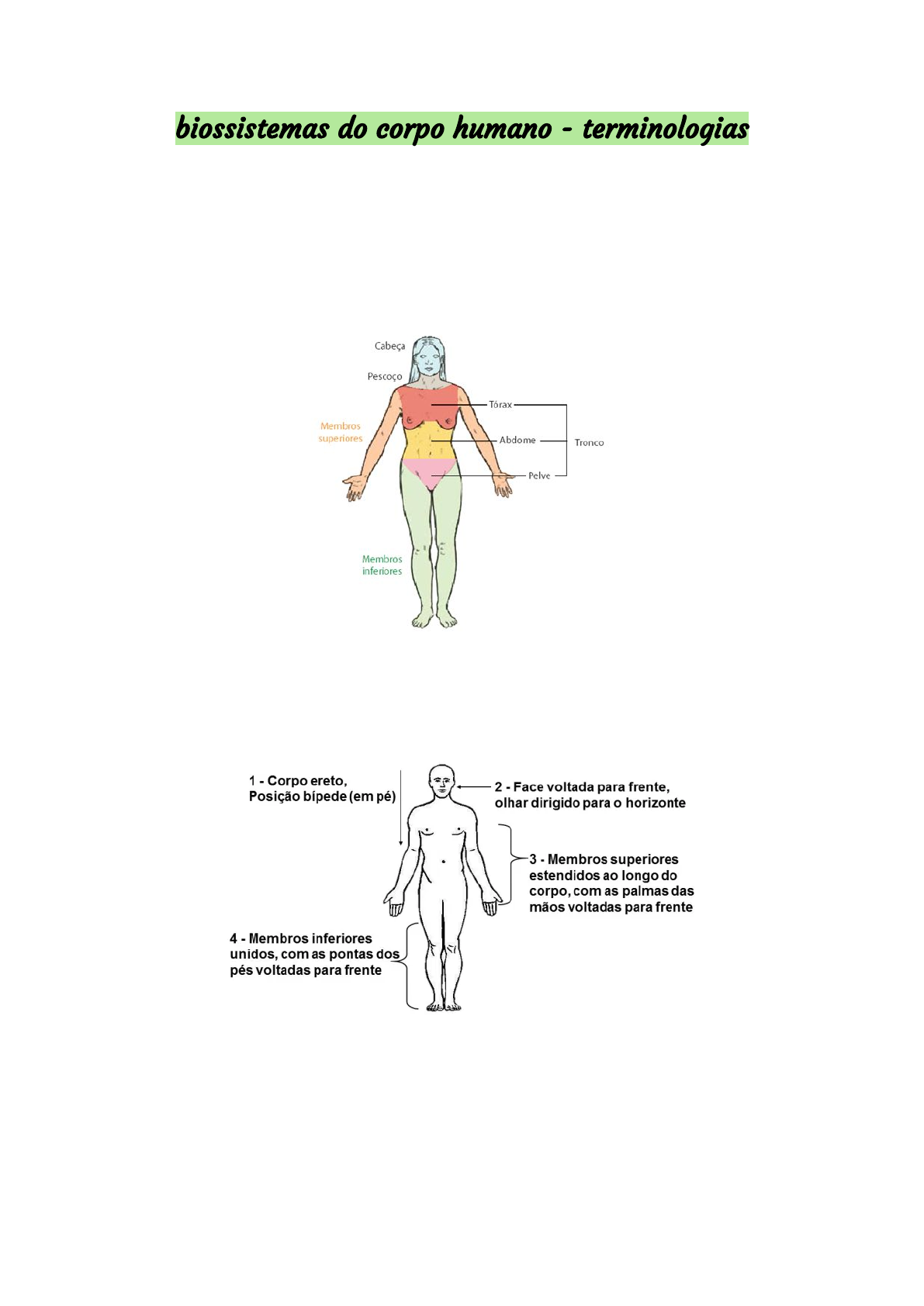 biossistemas do corpo humano - terminologias Segmentos corporais ● cabeça e pescoço ● tronco (peito e costa superior, abdômen e costa inferior) ● extremidade superior (braço, antebraço e mão) ● extremidade inferior (coxa, perna e pé) Posições anatômicas convenção adotada em anatomia para descrever as posições espaciais dos órgãos, ossos e demais componentes do corpo humano. Terminologia das posições ● Decúbito lateral: Deitado de costas com a face anterior do corpo para cima. ● Decúbito dorsal: Deitado de lado (esquerda ou direita). ● Decúbito ventral: Deitado de frente, com a face anterior do corpo para baixo ( a cabeça pode estar virada para um lado). Termos de relação ● Anterior/Ventral/frontal: na direção da frente do corpo. ● Posterior/Dorsal: na direção das costas (traseiro). ● Inferior/Caudal: na direção da parte inferior do corpo. ● Superior/Cranial: na direção da parte superior do corpo. ● Medial: na direção do plano sagital mediano. ● Lateral: mais afastado do plano sagital mediano. ● Médio: estrutura ou órgão interposto entre um superior e um inferior ou entre anterior e posterior. ● Proximal: próximo da raiz do membro na direção do tronco. ● Distal: afastado da raiz do membro, longe do tronco, ou do ponto de inserção. ● Superficial: significa mais perto da superfície do corpo. ● Profundo: significa mais afastado da superfície do corpo. ● Homolateral/Ipsilateral: do mesmo lado do corpo ou de outra estrutura. ● Contralateral: do lado oposto do corpo ou de outra estrutura. Movimentos dos segmentos Planos e eixos de movimentos Na posição anatômica, o corpo é referenciado de acordo com três planos mutuamente ortogonais (formam um ângulo reto). O Plano coronal ou frontal, divide o corpo em partes anterior (ventral) e posterior (dorsal). As ações articulares ocorrem em torno de um eixo ântero-posterior (AP) e incluem a abdução e a adução. (polichinelo) O Plano Sagital divide o corpo simetricamente em partes direita e esquerda. As ações articulares ocorrem em torno de um eixo latero-lateral e incluem os movimentos de flexão e extensão. O Plano transversal ou Horizontal divide o corpo em partes superior (cranial) e inferior (caudal). As ações articulares ocorrem em torno de um eixo longitudinal ou vertical e incluem a rotação medial-lateral e pronação-supinação.