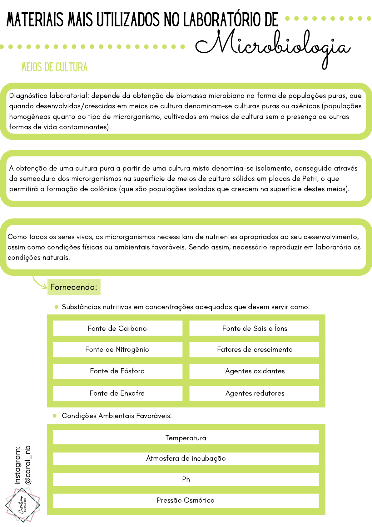 MATERIAIS MAIS UTILIZADOS NO LABORATÓRIO DE Microbiologia Diagnóstico laboratorial: depende da obtenção de biomassa microbiana na forma de populações puras, que quando desenvolvidas/crescidas em meios de cultura denominam-se culturas puras ou axênicas (populações homogêneas quanto ao tipo de microrganismo, cultivados em meios de cultura sem a presença de outras formas de vida contaminantes). A obtenção de uma cultura pura a partir de uma cultura mista denomina-se isolamento, conseguido através da semeadura dos microrganismos na superfície de meios de cultura sólidos em placas de Petri, o que permitirá a formação de colônias (que são populações isoladas que crescem na superfície destes meios). Como todos os seres vivos, os microrganismos necessitam de nutrientes apropriados ao seu desenvolvimento, assim como condições físicas ou ambientais favoráveis. Sendo assim, necessário reproduzir em laboratório as condições naturais. Fornecendo: Fonte de Carbono Fonte de Nitrogênio Fonte de Fósforo Fonte de Enxofre Fonte de Sais e Íons Fatores de crescimento Agentes oxidantes Agentes redutores Temperatura Atmosfera de incubação Ph Pressão Osmótica MEIOS DE CULTURA Substâncias nutritivas em concentrações adequadas que devem servir como: Condições Ambientais Favoráveis: In st ag ra m : @ ca ro l_ nb Umidade OS MEIOS DE CULTURAS SÃO UTILIZADOS EM TRÊS TIPOS DIFERENTES DE CONSISTÊNCIA: Líquida:utilizados para crescimento em massa (não promovem a formação de colônias, mas sim, crescimento por dispersão). Sólida: propiciam a formação de colônias sobre ou dentro do substrato sólido. Ideal para realização de isolamento de colônias. Semissólida: para verificação de motilidade. OS MEIOS DE CULTURAS PODEM SER CLASSIFICADOS EM, QUANTO À FUNÇÃO: Meios de transporte:meios utilizados para garantir a viabilidade dos microrganismos que não podem ser semeados logo após a coleta e que poderiam morrer. Ex.: Ringer- Pras (próprio para transporte de bactérias anaeróbias). Meios de triagem: meios utilizados para identificação presuntiva ou separação de bactérias em grandes grupos ou níveis taxonômicos mais amplos. Ex. separação de bactérias de uma mesma família - Ágar tríplice açúcar ferro (TSI) quando utilizado para triagem de bactérias da família Enterobacteriaceae. Meios enriquecidos: Aumentam possibilidade de crescimento da espécie desejada, quando a mesma se encontra em pequeno número, ou demanda nutrientes/fatores de crescimento particulares. Adicionam-se ao meio substâncias de enriquecimento, tais como sangue, soro, ovo, extrato de levedura, extrato de carne, vitaminas, etc. Ex: Ágar sangue. Meios complexos:possuem os componentes essenciais ao crescimento da maioria dos organismos quimioheterotróficos. A composição química exata não é inteiramente conhecida Instagram : @ carol_nb Meios seletivos:inibem o desenvolvimento de determinados microrganismos, devido à adição de substâncias inibidoras (antibióticos, sais biliares, substâncias químicas, corantes, etc), favorecendo o crescimento dos microrganismos de interesse. Ex. Meio Bacteroides Bile Esculina (BBE). Meios indicadores (ou diferenciais): meios que revelam uma propriedade bioquímica particular, permitindo uma identificação presuntiva. Ex.: caldo lactose c/ vermelho neutro (indicador de fermentação da lactose). Meios seletivos indicadores (ou seletivo-diferenciais): são utilizados para o isolamento e identificação presuntiva de microrganismos. Exemplo: Ágar MacConkey (seletivo por conter cristal violeta e sais biliares que inibem o crescimento de bactérias Gram positivo e Gram negativo exigentes, e indicador da fermentação da lactose evidenciada pelo vermelho neutro). Meios redutores: meios que servem para crescimento de bactérias anaeróbias obrigatórias, pois possuem substâncias capazes de se combinar com o oxigênio dissolvido, eliminando-o do meio de cultura. Ex. BHI c/L-cistina. Meios quimicamente definidos: meio no qual a composição química exata é conhecida. Exemplo: meio para o cultivo de bactérias quimioheterotróficas exigentes. TÉCNICAS DE SEMEADURA Conceitos importantes Isolamento de um microorganismo: Obtenção de uma cultura pura - identificação do microorganismo. Semeadura: Plantio de um microorganismo em um meio de cultura. Repique: transferência de um microrganismo de um meio de cultura para outro Instagram: @carol_nb