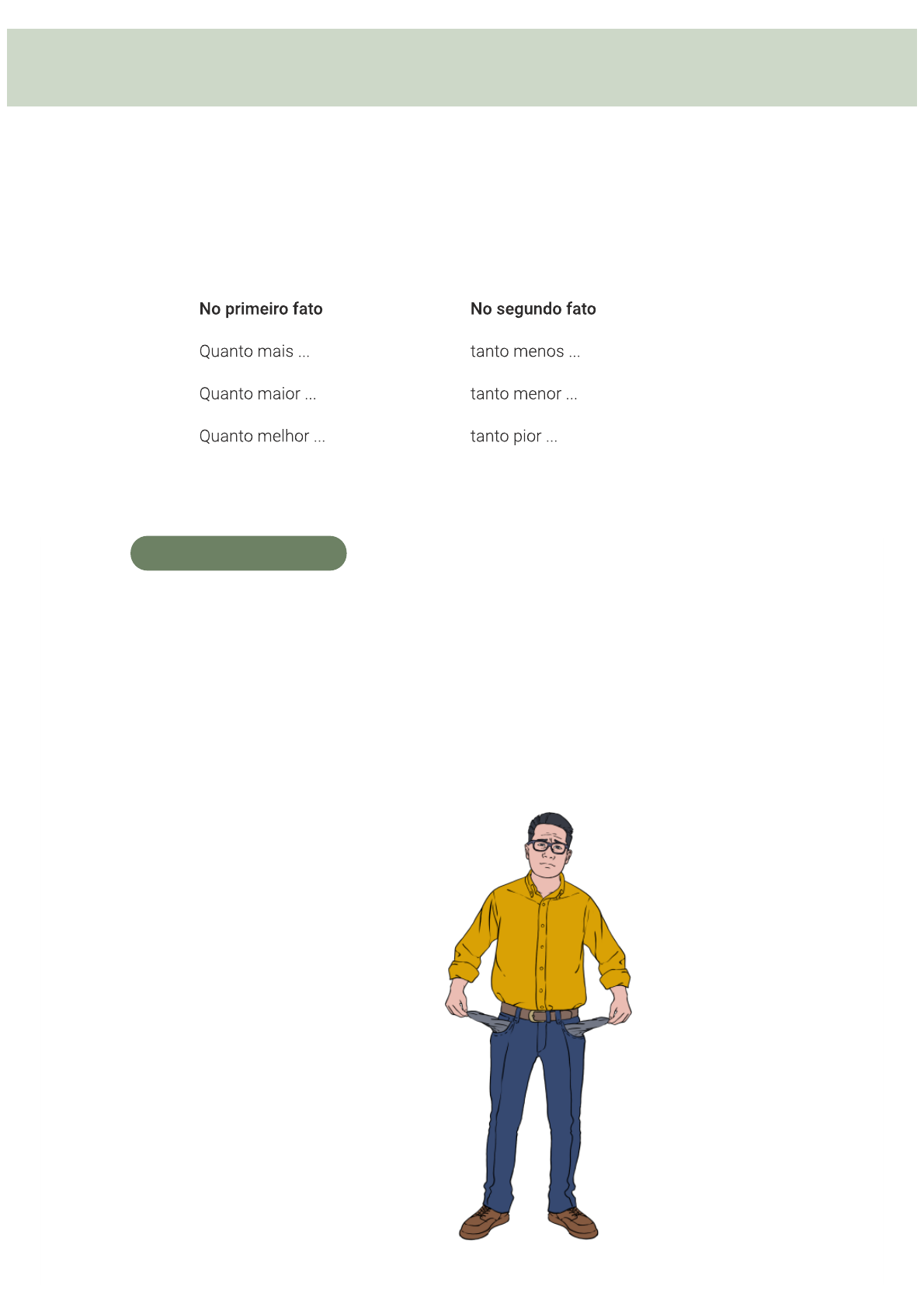 PRÁTICAS DE PRODUÇÃO DE TEXTO MÓDULO 11: COMPARAÇÃO 6. COMPARAÇÃO DE DIFERENÇA. É possível estabelecer a diferença numa comparação. Neste caso, necessariamente, você terá: Alfredo trabalha. Ele fica pobre. Transformação: Quanto menos Alfredo trabalha, mais pobre fica. (as ideias se correspondem) EXEMPLOS EXERCÍCIO Nº 15 1 Alfredo trabalha. Ele fica pobre. 2 O professor explica. O assunto fica mais difícil. 3 A mulher fala mais. Os ouvintes ficam contentes. 4 A minha preocupação é grande. A minha saúde é pequena. No entanto as ideias podem ser contraditórias, por qualquer razão. Veja: Quanto mais Alfredo trabalha, menos dinheiro consegue guardar. O professor explica. Eu não o entendo. Quanto mais o professor explica, menos o entendo. Quanto menos o professor explica, mais difícil fica o assunto. Transforme os períodos, apresentando a diferença em gradação contrária, mas com as ideias correspondentes: Digite aqui... Digite aqui... Digite aqui... Digite aqui... 5 A chuva é boa para os lavradores. Ela é ruim para os pescadores. GABARITO 1 Quanto menos Alfredo trabalha, tanto mais pobre fica. 2 Quanto menos o professor explica, (tanto) mais difícil fica o assunto. 3 Quanto mais a mulher fala, (tanto) menos ficam contentes os ouvintes. 4 Quanto maior é a minha preocupação, (tanto) menor é a minha saúde. 5 Quanto melhor é a chuva para os lavradores, (tanto) pior ela é para os pescadores. Respondidas 5 de 5 questões EXERCÍCIO Nº 16 1 Alfredo trabalha. Consegue guardar pouco dinheiro. Digite aqui... Atividade concluída Transforme os períodos, apresentando a diferença em gradação contrária, mas com as ideias imprevistas, (contrárias ao que era se esperar): Digite aqui... 2 O aluno se esforça. A nota é ruim. 3 O professor falava. Eu o entendia menos. 4 A tarefa é grande. A recompensa é pequena. 5 O produto é bom. O preço é bom (baixo). GABARITO 1 Quanto mais Alfredo trabalha, (tanto) menos dinheiro consegue guardar. 2 Quanto mais o aluno se esforça, (tanto) pior é a nota. 3 Quanto mais o professor falava, (tanto) menos eu o entendia. 4 Quanto maior é a tarefa, (tanto) menor é a recompensa. 5 Quanto melhor é o produto, (tanto) menor é o preço. Respondidas 5 de 5 questões Digite aqui... Digite aqui... Digite aqui... Digite aqui... Atividade concluída 2021. CAPES - PROGRAMA DE ACOLHIMENTO DA UNIVERSIDADE ABERTA DO BRASIL. 9 de 18 1 2 3 4 5 6 7 8 9 10 11 12 13 14 15 16 17 18 Progresso do Módulo https://avamec.mec.gov.br/ava-mec-ws/instituicao/sealf/conteudo/modulo/4041/uni11/slide8.html https://avamec.mec.gov.br/ava-mec-ws/instituicao/sealf/conteudo/modulo/4041/uni11/slide10.html https://avamec.mec.gov.br/ava-mec-ws/instituicao/sealf/conteudo/modulo/4041/uni11/slide1.html https://avamec.mec.gov.br/ava-mec-ws/instituicao/sealf/conteudo/modulo/4041/uni11/slide2.html https://avamec.mec.gov.br/ava-mec-ws/instituicao/sealf/conteudo/modulo/4041/uni11/slide3.html https://avamec.mec.gov.br/ava-mec-ws/instituicao/sealf/conteudo/modulo/4041/uni11/slide4.html https://avamec.mec.gov.br/ava-mec-ws/instituicao/sealf/conteudo/modulo/4041/uni11/slide5.html https://avamec.mec.gov.br/ava-mec-ws/instituicao/sealf/conteudo/modulo/4041/uni11/slide6.html https://avamec.mec.gov.br/ava-mec-ws/instituicao/sealf/conteudo/modulo/4041/uni11/slide7.html https://avamec.mec.gov.br/ava-mec-ws/instituicao/sealf/conteudo/modulo/4041/uni11/slide8.html https://avamec.mec.gov.br/ava-mec-ws/instituicao/sealf/conteudo/modulo/4041/uni11/slide9.html https://avamec.mec.gov.br/ava-mec-ws/instituicao/sealf/conteudo/modulo/4041/uni11/slide10.html https://avamec.mec.gov.br/ava-mec-ws/instituicao/sealf/conteudo/modulo/4041/uni11/slide11.html https://avamec.mec.gov.br/ava-mec-ws/instituicao/sealf/conteudo/modulo/4041/uni11/slide12.html https://avamec.mec.gov.br/ava-mec-ws/instituicao/sealf/conteudo/modulo/4041/uni11/slide13.html https://avamec.mec.gov.br/ava-mec-ws/instituicao/sealf/conteudo/modulo/4041/uni11/slide14.html https://avamec.mec.gov.br/ava-mec-ws/instituicao/sealf/conteudo/modulo/4041/uni11/slide15.html https://avamec.mec.gov.br/ava-mec-ws/instituicao/sealf/conteudo/modulo/4041/uni11/slide16.html https://avamec.mec.gov.br/ava-mec-ws/instituicao/sealf/conteudo/modulo/4041/uni11/slide17.html https://avamec.mec.gov.br/ava-mec-ws/instituicao/sealf/conteudo/modulo/4041/uni11/slide18.html