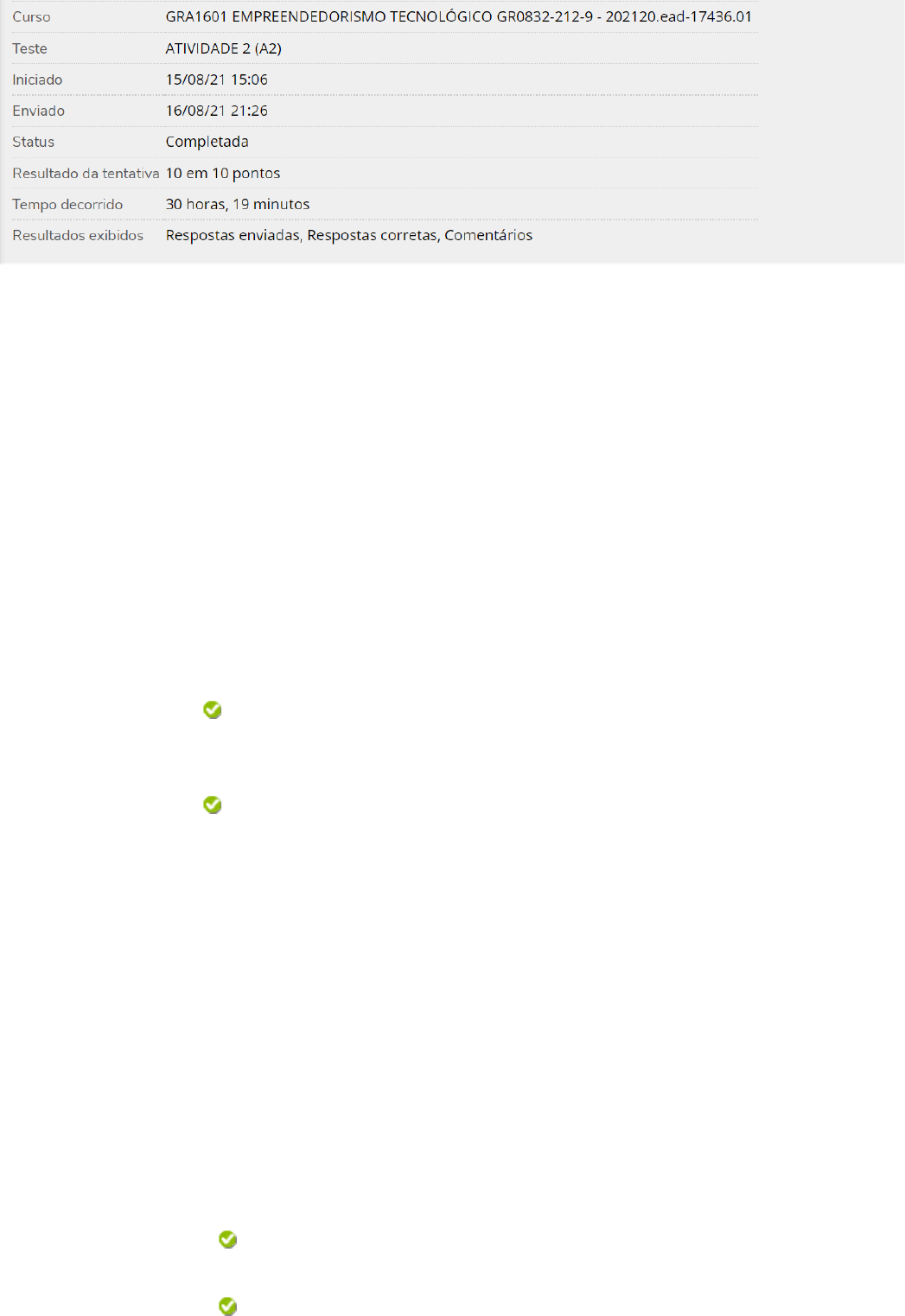 Pergunta 1 1 em 1 pontos Sabe-se que uma boa ideia não é certeza de sucesso no mundo dos negócios. Ideias inovadoras e com alto potencial podem até conseguir um ápice. No entanto, se o empreendedor não seguir um ciclo de criar a ideia, passar a mesma por um processo de refinamento e, posterior a isso, efetuar um planejamento, certamente os riscos e as incertezas serão maiores e mais frequentes em seu negócio. A partir do apresentado, analise as asserções a seguir e a relação proposta entre elas. I. Só é possível mudar e refinar determinada questão a respeito do que conhecemos. Pois: II. Sem entendimento e conhecimento, toda mudança será em vão e até poderá render prejuízos incalculáveis. A seguir, assinale a alternativa correta. Resposta Selecionada: As asserções I e II são proposições verdadeiras e a II é uma justificativa correta da I. Resposta Correta: As asserções I e II são proposições verdadeiras e a II é uma justificativa correta da I. Comentário da resposta: Resposta correta. A alternativa está correta, pois a asserção I é uma proposição verdadeira, dado que, a partir do momento em que uma ideia é criada, pode ser necessário refinar, sendo que, para que o refinamento aconteça com assertividade, é recomendado conhecimento aprofundado sobre a ideia. Pergunta 2 1 em 1 pontos O cenário empreendedor exige o tempo todo que as empresas e profissionais explorem novas oportunidades no mercado com grande potencial para geração de inovações. Com isso e como consequência dessa dinâmica do mercado, as empresas estão adotando técnicas inadequadas à sua realidade. Considerando o apresentado, assinale a alternativa que indica quais são as práticas consideradas inadequadas executadas pelo empreendedor. Resposta Selecionada: Práticas extremamente burocráticas, inflexíveis e pouco inovadoras. Resposta Correta: Práticas extremamente burocráticas, inflexíveis e pouco inovadoras. Comentário da resposta: Resposta correta. A alternativa está correta, pois, ao tentar dinamizar as práticas de mercado, o empreendedor acaba caindo em algumas armadilhas, e impõe, dessa forma, práticas extremamente burocráticas de acesso ao seu produto/serviço, tendo um contexto não inovador e inflexível. Pergunta 3 1 em 1 pontos Empreender não significa, necessariamente, criar um negócio que gere lucros e receitas para os criadores. A geração da ideia que irá culminar no negócio tem que ter a capacidade de trilhar de maneira escalável, ou seja, deve-se pensar em algo que não seja pontual, portanto, momentâneo. O empreendedorismo realizado de forma ampla pode contemplar outros assuntos que compõem o ecossistema do empreendedorismo tecnológico. Sobre as possibilidades do empreendedorismo de uma forma mais profunda, analise as afirmativas a seguir. 1. Diminuir desigualdades sociais na sociedade. 2. Conhecer a fundo o mundo dos negócios. 3. Entender como funciona as startups. 4. Compreender o universo das tecnologias da informação. Está correto o que se afirma em: Resposta Selecionada: I, II e III, apenas. Resposta Correta: I, II e III, apenas. Comentário da resposta: Resposta correta. A alternativa está correta, pois, ao vislumbrar o empreendedorismo de forma profunda, tem-se, automaticamente, o contato com outros universos relacionados, no caso, duas premissas são factíveis: a primeira é a que adentra mais a fundo no mundo dos negócios, e a segunda conhece os aspectos das startups. Pergunta 4 1 em 1 pontos “Muitas pessoas pensam em abrir um negócio ou começar um novo projeto, mas não sabem como chegar a uma ideia inovadora”. Algumas ferramentas se fazem necessárias para que o refinamento seja realizado de forma assertiva. Uma das ferramentas se chama “Funil de ideias que ajudam através de duas abordagens: a primeira parte da vivência do empreendedor e a segunda de uma observação de mercado”. 10 FERRAMENTAS para validar e executar novas ideias. Portal Sebrae , seção Pessoas. Disponível em: https://www.sebrae.com.br/sites/PortalSebrae/artigos/10-ferramentas-para-validar-e-executar-novas- ideias,c30d9594aaff6510VgnVCM1000004c00210aRCRD . Acesso em: 6 fev. 2020. Observa-se que a fase de refinamento é importante para a lapidação da ideia. Nesse sentido, assinale a https://www.sebrae.com.br/sites/PortalSebrae/artigos/10-ferramentas-para-validar-e-executar-novas-ideias,c30d9594aaff6510VgnVCM1000004c00210aRCRD https://www.sebrae.com.br/sites/PortalSebrae/artigos/10-ferramentas-para-validar-e-executar-novas-ideias,c30d9594aaff6510VgnVCM1000004c00210aRCRD alternativa que apresenta o entendimento quando a fase de refinamento acontece de formas sucessivas. Resposta Selecionada: A ideia de partida não é referenciada pela experiência real, sendo o protótipo reorientado em função do que se vai aprendendo. Resposta Correta: A ideia de partida não é referenciada pela experiência real, sendo o protótipo reorientado em função do que se vai aprendendo. Comentário da resposta: Resposta correta. A alternativa está correta, pois não há problema em se ter sucessivas fases de refinamento, mas o que tem que ser observado é o tempo e os recursos investidos a cada volta à fase inicial. Não é uma regra, mas, geralmente, quando se tem muitas fases de refinamento, o empreendedor não possui domínio amplo de seu produto/serviço, ou seja, quanto menor o conhecimento, maior será a probabilidade de retorno para a lapidação da ideia, pois várias hipóteses devem ser testadas. Pergunta 5 1 em 1 pontos Empreender está ligado à ação e a atividades. Com isso, é necessário se atentar aos movimentos do ecossistema do empreendedorismo, aos eventos que ocorrem nos ambientes interno e externo e de que forma influenciam o cotidiano das pessoas. A partir do contexto exposto, analise as assertivas a seguir e verifique a correta forma sequencial. I. Propor soluções para os consumidores. II. Gerar ideias. III. Identificar necess