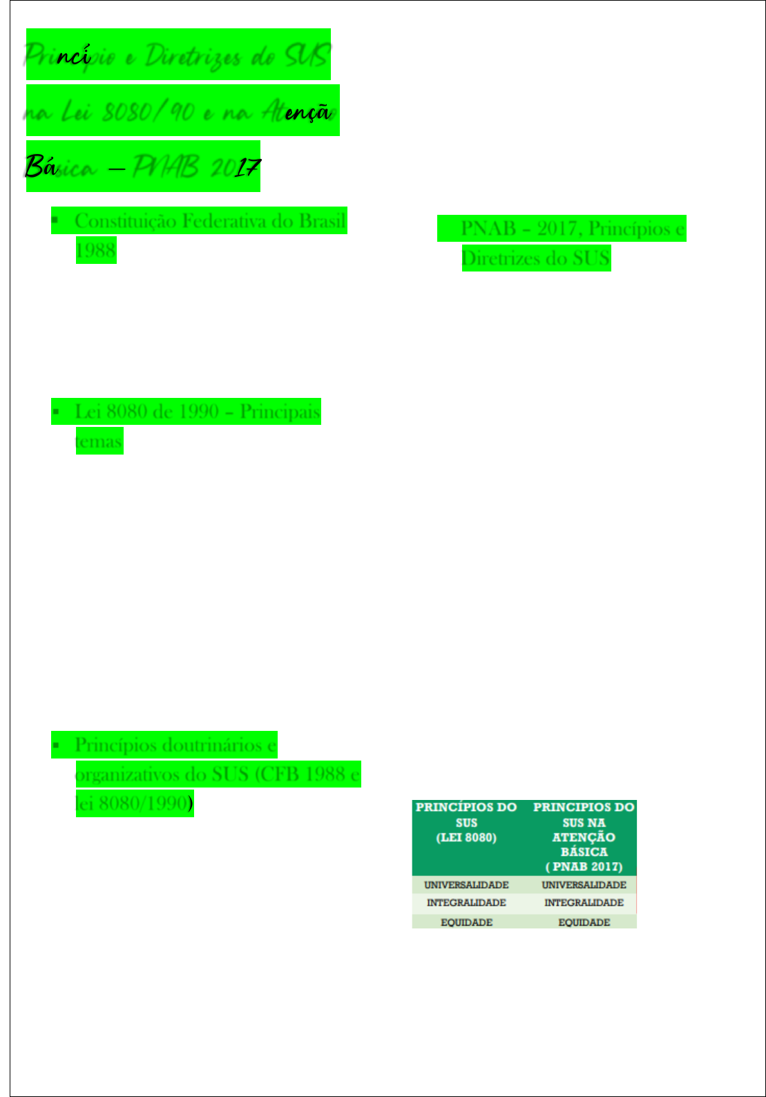 SCAPS (11/05) 1 Princ pio e Diretrizes do SUS na Lei 8080/90 e na Aten o B sica – PNAB 2017 ▪ Constituição Federativa do Brasil 1988 -Criação do SUS -Determinação dos princípios e diretrizes gerais do SUS -Gratuidade do SUS ▪ Lei 8080 de 1990 – Principais temas -Determinantes sociais em saúde -Vigilância em saúde -Princípios e diretrizes do SUS (geral) -Políticas para populações específicas -Responsabilidade das 3 esferas de governo -Estrutura de governança do SUS -Política de recursos humanos -Participação complementar do privado ▪ Princípios doutrinários e organizativos do SUS (CFB 1988 e lei 8080/1990) -Princípios doutrinários: -Universalidade -Equidade -Integralidade -Princípios organizativos: -Descentralização -Regionalização -Hierarquização -Participação e controle social (conselhos de saúde e conferências de saúde) -Resolutividade -Complementariedade do setor privado ▪ PNAB – 2017, Princípios e Diretrizes do SUS -Art. 3 São princípios e diretrizes do SUS e da RAS a serem operacionalizados na Atenção Básica: 1- Princípios: -Universalidade -Equidade -Integralidade 2- Diretrizes: -Regionalização e hierarquização -Territorialização -População adscrita -Cuidado centrado na pessoa -Resolutividade -Longitudinalidade do cuidado -Coordenação do cuidado -Ordenação da rede -Participação da comunidade SCAPS (11/05) 2 ▪ PNAB de 2017 -Portaria número 2.436, de 21 de setembro de 2017 -Aprova a política Nacional de Atenção Básica, estabelecendo a revisão de diretrizes para a organização da Atenção Básica, no âmbito do SUS o Universalidade -Acesso universal -Direito de TODOS, inclusive de estrangeiros -Acesso a todos os níveis de atenção via redes de atenção -Porta principal de acesso: UBS o Equidade -Justiça social -Dar mais para quem precisa o Integralidade -Atendimento em todos os níveis de atenção -Atendimento de forma integral (completa) o Descentralização -Redistribuição de responsabilidades – nível federal, estadual e municipal -Municipalização da Atenção Básica – promoções das ações de saúde direto aos seus cidadãos -Maior chance de criação e inovação SCAPS (11/05) 3 -Aumento da eficiência (relação entre os resultados obtidos e os recursos empregados) -Quanto mais perto do fato a decisão for formada, mais chance haverá de acerto o Complementariedade do setor privado -O setor privado participa do SUS de forma complementar, por meio de contratos e convênios de prestação de serviço ao estado – quando as unidades públicas de saúde não são suficientes para garantir o atendimento a toda a população de uma determinada região -Preferência de empresas sem fins lucrativos Ex.: organizações sociais (OS) o Regionalização e hierarquização -Regionalização: -Pontos de atenção da RAS, tendo a Atenção Básica como ponto de comunicação entre esses -Considera-se regiões de saúde como um recorte espacial estratégico para fins de planejamento, organização e gestão de redes de ações e serviços de saúde em determinada localidade -Hierarquização: forma de organização de pontos de atenção da RAS entre si, com fluxos e referências estabelecidos o Territorialização e adstrição -Permitir o planejamento, programação descentralizada e o desenvolvimento de ações setoriais e intersetoriais com foco em um território específico, com impacto na situação, nos condicionantes e determinantes da saúde das pessoas e coletividades que constituem aquele espaço e estão, adstritos a ele -Território: -Unidade geográfica única, de construção descentralizada do SUS na execução das ações estratégicas destinadas à vigilância, promoção, prevenção, proteção e recuperação da saúde -População adscrita: população que está presente no território da UBS, de forma a estimular o desenvolvimento de relações de vínculo e responsabilização entre as equipes e a população, garantindo a continuidade das ações da saúde e a longitudinalidade do cuidado e com o objetivo de ser referência para o seu cuidado SCAPS (11/05) 4 o Cuidado centrado na pessoa: -Aponta para o desenvolvimento de ações de cuidado de forma singularizada, que auxilie as pessoas a desenvolverem os conhecimentos, aptidões, competências e a confiança necessária para gerir e tomar decisões embasadas sobre sua própria saúde e ser cuidado de saúde de forma mais efetiva -O cuidado é construído com as pessoas, de acordo com suas necessidades e potencialidades na busca de uma vida independente e plena -A família, comunidade e outras formas de coletividade são elementos relevantes, muitas vezes condicionantes ou determinantes na vida das pessoas e, por consequência, no cuidado o Resolutividade -Reforça a importância da Atenção Básica ser resolutiva, utilizando e articulando diferentes tecnologias de cuidado individual e coletivo, por meio de uma clínica ampliada capaz de construir vínculos positivos e intervenções clínica e sanitariamente efetivas, centrada na pessoa, na perspectiva de ampliação dos graus de autonomia dos indivíduos e grupos sociais -Deve ser capaz de resolver a grande maioria dos problemas de saúde da população, coordenando o cuidado do usuário em outros pontos da RAS, quando necessário o Longitudinalidade do cuidado -Pressupõe a continuidade da relação de cuidado -Construção de vínculo -Responsabilização entre profissionais e usuários ao longo do tempo e de modo permanente e consistente -Acompanha os efeitos das intervenções em saúde e de outros elementos na vida das pessoas -Evita a perda de referências e diminuindo os riscos de iatrogenia que são decorrentes do desconhecimento das histórias de vida e da falta de coordenação do cuidado o Coordenar o cuidado -Elaborar, acompanhar e organizar o fluxo dos usuários entre os pontos de atenção das RAS -Atuando como o centro de comunicação entre os diversos ponto