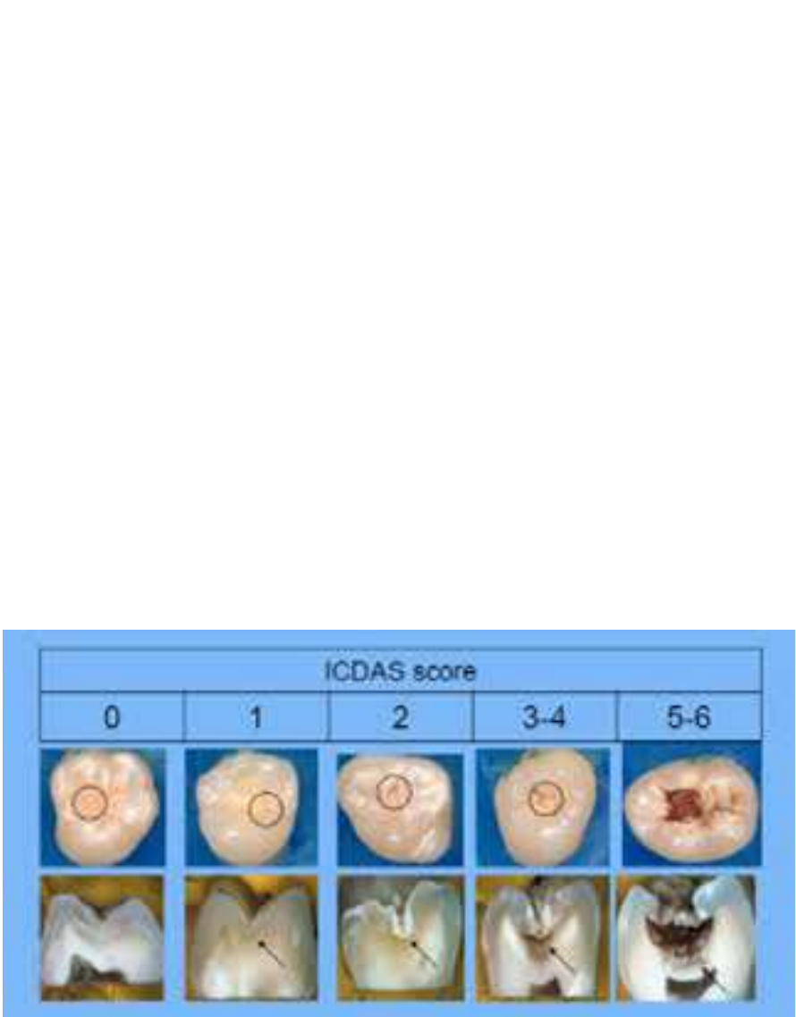 Sistema de Avaliação Internacional de pontuação e Detecção de carie (ICDAS) e descrições correspondentes. 1. A) escore 0: Superfície do dente Saudável. 2. B) escore 1: Alteração inicial de esmalte, notável após a secagem. 3. C) escore 2: Alteração de esmalte visível, sem secagem 4. D) escore 3: Cavitação localizada em esmalte sem tecido dentinário visível ou sombreamento subjacente. 5. E) escore 4: Sombreamento da dentina com ou sem cavitação do esmalte. 6. F) escore 5: Cavitação com exposição de dentina visível. 7. G) escore 6: Cavitação extensa com exposição de dentina subjacente.