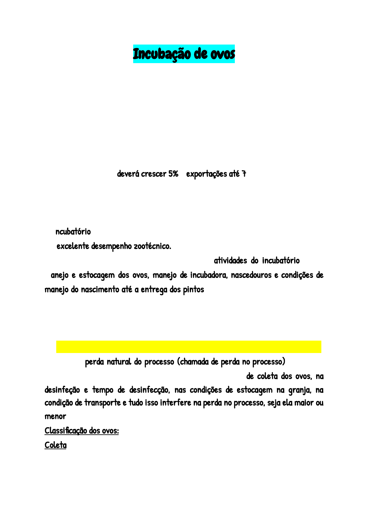 Incubação de ovos Por: Vinícius Souza Mendes Existe uma diferença na qualidade do pintinho de um dia e no seu desenvolvimento de acordo com o processo de recebimento e incubação do ovo O mercado de carne de aves (frango e peru) ainda está em crescimento, e é um mercado muito aquecido A produção industrial – tecnologias disponíveis importantes para aumentar a produção e produzir o que o mercado demanda - temos um mercado crescente A produção de frango deverá crescer 5% e exportações até 7% em 2020 A produção industrial permite atender a demanda comercial .A demanda por carne de aves é crescente. Em 2019, o Brasil produziu 13 milhões de carne. O incubatório tem a responsabilidade de disponibilizar pintinhos que apresentem um excelente desempenho zootécnico. Porém, existem múltiplos fatores inerentes às atividades do incubatório como: manejo e estocagem dos ovos, manejo de incubadora, nascedouros e condições de manejo do nascimento até a entrega dos pintos na granja que requerem uma série de cuidados e que precisam ser conhecidos para que se possa padronizá-los dentro do sistema de controle, que permita modi�cações quando for preciso, para manter a qualidade dos pintinhos de um dia. As matrizes tem papel importante/in�uencia na qualidade do pintinho de um dia. Existe uma perda natural do processo (chamada de perda no processo) que são os ovos férteis que não vão eclodir consequência na forma de coleta dos ovos, na desinfeção e tempo de desinfecção, nas condições de estocagem na granja, na condição de transporte e tudo isso interfere na perda no processo, seja ela maior ou menor. Classi�cação dos ovos: Coleta -> Manual (tem mais pessoas/�uxo, o risco é maior de contaminação e fere a biosseguridade) ou automática (bem melhor, menos mão de obra) Idade da ave -> quanto mais nova menor o ovo, casca mais rígida/espessa; quanto mais velha, maior ovo em dimensão; casca mais �na, maior permeabilidade de microorganismos (como fungos, bactérias) para dentro do ovo (Super�cie da casca do ovo pode ter mais de dois mil poros) Integridade e forma da casca/peso do ovo -> Pode predispor contaminação bacteriana ou fúngica se houver perda da integridade da casca. Ovos sujos e de cama (desinfecção de ovos) -> as primeiras horas os ovos de cama tem mais chances de contaminação. As peruas podem armazenar espermatozoides viáveis por até 84 dias, isso in�uencia na eclosão, galinhas menos, mas ainda assim é um período longo. Ovos sujos de cama -> é uma bomba relógio. - O ovo de cama deve ser muito bem manipulado para evitar perdas econômicas, ainda compensa utiliza-los desde que o procedimento seja adequado: coletados o mais rápido possível (importância do número de coletas por dia) e passe pelo processo de limpeza e desinfecção, há lotes que chegam a 15% de ovos de cama (geralmente se tem de 3 a 5% de ovos de cama , quantidade grande, não dá pra descartar, se tiver protocolo de limpeza e desinfecção, armazenamento e segregação durante a incubação, consegue ter um pintinho de qualidade, mesmo que seja um ovo de cama, a não ser que ele esteja muiiito sujo). - Existe uma grande proporção de ovos de cama, que torna seu descarte inviável economicamente. - Para evitar perdas relacionadas a esses ovos devem se observar as boas práticas de manejo. - Ovos postos fora do ninho precisam de um manejo especi�co, são ovos potencialmente contaminados devido ao contato direto com a matéria orgânica da cama - Nas primeiras duas horas pós postura é quando a casca é mais permeável - Importante que o recolhimento dos ovos e o processo de desinfecção ocorra o mais rápido possível , para impedir menos contaminação possivel da casca para dentro do ovo. - Quando se limpa o ovo de cama mesmo que de forma e�ciente, ainda assim há potencial de contaminação maior. - Quando o ovo de cama é aquecido na incubadora, as bactérias começam a se desenvolver muito mais rápido, gera uma fermentação natural, produz gases (além de que pode dar umas bolas na casca) e pode levar o ovo a explodir e contaminar os demais ovos - Esses ovos de cama devem ser armazenados em locais especí�cos, separados dos outros ovos, manipulados em máquina de incubação separada ou no mínimo em bandeja separada posta na parte de baixo da incubadora (caso exploda não contamina os ovos de cima). - No processo de vacinação em ovo, que ocorre entre 18 e 19 dias, é um ovo muito fácil de disseminar a contaminação para outros ovos. Peso do ovo: Matrizes mais velhas bota ovos maiores (com isso, o pinto será maior) -> terá menor densidade especí�ca -> casca mais �na (ocorre mais trocas gasosas com o ambiente, perde umidade) -> maior perda de peso do ovo na incubação (pela perda da umidade) -> maior mortalidade embrionária -> menor eclodibilidade - A incubação deve considerar faixa de idade da matriz (NOVA, INTERMÉDIÁRIA E VELHA) - importante para fazer a segregação da incubação para evitar desuniformidade do lote de pintinhos. (pois ovos maiores de galinhas mais velhas darão pintinhos maiores e eles comem mais em relação ao ovo menor de galinhas mais novas que comem menos). - Para programar a incubação se olha primeiro o status sanitários e depois a faixa de idade (melhora a uniformidade a campo) - A desinfecção dos ovos deva ser feita o quanto antes e mais rápido possível, pode ser seca (essa é a melhor) ou úmida - > A desinfecção seca pode ser feita em fumigador, pode ser usado desde ácido peracético até formalina – preferível – porque quando se fornece umidade, fornece pra bactéria um meio para entrar para dentro do ovo. - > A desinfecção úmida pode ser feita por imersão ou aspersão do desinfetante; com ácido ou amônia quaternária, só que como é por imersão, pode ser um meio para que a bactéria entre dentro do ovo. - A escolha do método de desinfecção varia de granja a granja - A