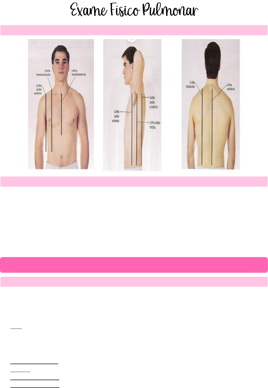 Sabrina Evelyn – MED XV BETA ic ii prática – 3º ciclo (212) Linhas torácicas Anamnese (sinais e sintomas característicos) • Dispneia – é necessário saber diferenciar uma dispneia fatal de uma relacionada a fatores psicológicos. • Padrão respiratório anormal. • Secreção aumentada → a secreção de certas enfermidades são características (ex.: a expectoração do edema pulmonar agudo tem aspecto seroso e do asmático, mucóide). • Hipoxemia. • Cianose. • Dor torácica → para se compreender a fisiopatologia da dor, é conveniente considerá-la sob três características: localização, irradiação e referência. O exame físico pulmonar segue, nessa ordem, os seguintes processos: inspeção; palpação; percussão e ausculta. Além disso, sempre é necessário avaliar o tórax anterior e posterior, nunca um só lado. Inspeção estática Examina-se a forma do tórax e suas anomalias congênitas ou adquiridas, localizadas ou difusas, simétricas ou não. A morfologia torácica varia conforme o biotipo do paciente – o reconhecimento desse fator é útil para ter uma certa correlação com algumas doenças do respiratório. → Pele: - Pelos normodistribuídos; - Cianose: central ou generalizada; - Coloração; → Implantação mamilar; → Simetria; → Forma e tipo de tórax; → Ossos inspecionados: Sabrina Evelyn – MED XV BETA ic ii prática – 3º ciclo (212) - Esterno; - Clavícula; - Costelas; - Coluna vertebral; - Escápula. Inspeção dinâmica Observam-se os movimentos respiratórios, suas características e alterações. → Músculos: - Intercostais externos; - Escalenos; - Esternocleidomastóideo; - Diafragma. → Tipo Respiratório: observar a movimentação do tórax e do abdome, com o objetivo de reconhecer em que regiões os movimentos são mais amplos. - Torácico (mais comum em mulheres); - Abdominal (mais comum em homens e crianças); - Tóraco-abdominal (mais comum em pacientes terminais); Sabrina Evelyn – MED XV BETA ic ii prática – 3º ciclo (212) → Ritmo Respiratório: → Tiragem Intercostal: indica retração de costela – os mm intercostais internos estão trabalhando mais que o normal. *Ponto de ancoragem: paciente faz a posição de jogar o corpo para frente – anterioriza o pulmão e facilita a respiração – sinal indicativo de dispneia. Palpação Além de complementar a inspeção, avaliando a mobilidade da caixa torácica, a palpação torna possível que lesões superficiais sejam mais bem examinadas quanto a sua forma, seu volume e sua consistência. → Verifica sensibilidade; temperatura; lesões (presença de massa/nódulo). → Verifica expansibilidade (tórax anterior: base; posterior: ápice e base). - Fazer uma prega com as duas mãos na região anterior logo abaixo do peitoral (mesma coisa na região posterior correspondente). - Posteriormente, também, deve-se apoiar as duas mãos no ombro do paciente a fim de avaliar a expansibilidade. Sabrina Evelyn – MED XV BETA ic ii prática – 3º ciclo (212) → Verifica frêmito tóraco-vocal (anteriores: 3 pontos; posteriores: 4 pontos). - Avalia presença de líquido: ausência de vibração indica líquido na pleura; aumento da vibração indica, normalmente, pneumonia. → Palpação de linfonodos supraclaviculares (quando palpáveis indica metástase na maioria das vezes) e axilares (principalmente perto da mama quando é mulher). Percussão Deve-se iniciar a percussão do tórax pela sua face posterior, de cima para baixo, ficando o médico atrás e à esquerda do paciente. A mão esquerda, com os dedos ligeiramente separados, deve apoiar-se suavemente sobre a parede, e o dedo médio, sobre o qual se percute, exerce apenas uma leve pressão sobre o tórax. → Som Claro Pulmonar: normal – predominantemente no lado direito. → Som Maciço: presença de órgão – predominantemente no lado esquerdo. → Som Timpânico: parece um oco – tem mais ar –, som mais alto que o normal. A percussão só possibilita captar os sons de estruturas localizadas no máximo a 5 em do ponto de impacto do dedo percussor. Esse fato faz com que o método só tenha valor no estudo das lesões até essa profundidade e cujo tamanho seja suficiente para modificar a densidade relativa da região. Causas ligadas à parede torácica, como obesidade, massas musculares hipertrofiadas e edema, reduzem a nitidez dos sons normais, fazendo com que ele se torne submaciço ou mesmo maciço. Sabrina Evelyn – MED XV BETA ic ii prática – 3º ciclo (212) Ausculta → Murmúrio Vesicular: Os ruídos respiratórios ouvidos na maior parte do tórax são produzidos pela turbulência do ar circulante ao chocar-se contra as saliências das bifurcações brônquicas, ao passar por cavidades de tamanhos diferentes, tais como dos bronquíolos para os alvéolos, e vice-versa. O componente inspiratório é mais intenso, mais duradouro e de tonalidade mais alta em relação ao componente expiratório. → Som Brônquico e Som Traqueal: quando o ar passa pela traqueia – o som inspiratório é constituído de um ruído soproso rude, após o qual há um curto intervalo silencioso; o som expiratório é um pouco mais forte e prolongado. → Som Broncovesicular: somam-se as características da respiração brônquica com as do murmúrio vesicular. É auscultada na região esternal superior, na interescápulo-vertebral direita e ao nível da terceira e quarta vértebras dorsais. Todos são fisiológicos – se estiverem normais, no relatório se escreve MVFs/RA (murmúrio vesicular fisiológico sem ruídos adventícios). Ruídos adventícios → Descontínuos: - Estertores Finos ou Creptantes: são mais suaves, de tom mais agudo. São auscultados do meio ao final da inspiração (fibrose pulmonar). - Estertores Grosseiros ou Bolhosos: ocorrem na inspiração inicial e duram ao longo da expiração, apresentando estalidos. São auscultados em qualquer região pulmonar e não variam com a posi