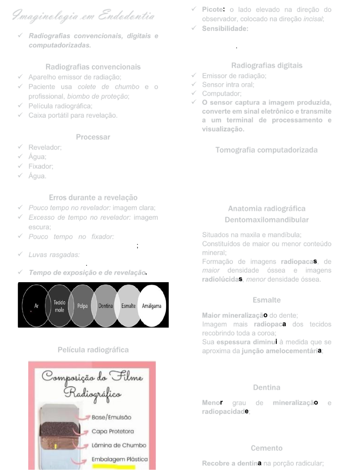 Imaginologia em Endodontia ✓ Radiografias convencionais, digitais e computadorizadas. Radiografias convencionais ✓ Aparelho emissor de radiação; ✓ Paciente usa colete de chumbo e o profissional, biombo de proteção; ✓ Película radiográfica; ✓ Caixa portátil para revelação. Processar ✓ Revelador; ✓ Água; ✓ Fixador; ✓ Água. Erros durante a revelação ✓ Pouco tempo no revelador: imagem clara; ✓ Excesso de tempo no revelador: imagem escura; ✓ Pouco tempo no fixador: não fixação correta da imagem, cor esverdeada; ✓ Luvas rasgadas: passagem de luz para a caixa de revelação. ✓ Tempo de exposição e de revelação. Película radiográfica ✓ Picote: o lado elevado na direção do observador, colocado na direção incisal; ✓ Sensibilidade: os principais filmes são os E e F pois necessitam de menos exposição do que o D. Radiografias digitais ✓ Emissor de radiação; ✓ Sensor intra oral; ✓ Computador; ✓ O sensor captura a imagem produzida, converte em sinal eletrônico e transmite a um terminal de processamento e visualização. Tomografia computadorizada ✓ Dimensão mais detalhada da área; ✓ Pode ser em cortes; ✓ Melhor avaliação para chegar ao diagnóstico. Anatomia radiográfica Dentomaxilomandibular ✓ Situados na maxila e mandíbula; ✓ Constituídos de maior ou menor conteúdo mineral; ✓ Formação de imagens radiopacas, de maior densidade óssea e imagens radiolúcidas, menor densidade óssea. Esmalte ✓ Maior mineralização do dente; ✓ Imagem mais radiopaca dos tecidos recobrindo toda a coroa; ✓ Sua espessura diminui à medida que se aproxima da junção amelocementária; ✓ Discreta diferença de radiopacidade entre esmalte e dentina. Dentina ✓ Menor grau de mineralização e radiopacidade; ✓ Maior porção radiopaca do órgão dentário, recoberta por cemento na raiz. Cemento ✓ Recobre a dentina na porção radicular; ✓ Impossível distinguir da dentina, por ter a mesma radiopacidade e ser muito fina. Polpa ✓ Situados elementos nutritivos; ✓ Área radiolúcida; ✓ Se estende da porção coronária, simula o formato da coroa, adquirindo forma afilada nas raízes, representada pelos condutos radiculares. Espaço Pericementário ✓ Correspondente ao ligamento periodontal; ✓ Linha radiolúcida delgada; ✓ Contornando a periferia das raízes dentárias. Lâmina Dura ✓ É a cortical óssea que envolve a porção radicular; ✓ Linha radiopaca contínua; ✓ Contorna o espaço pericementário; ✓ Sua descontinuidade representa o primeiro sinal radiográfico das alterações periapicais. Fossas Nasais (Cavidade Nasal) ✓ Aparecem na radiografia periapical de incisivos centrais superiores, acima dos ápices dentários; ✓ Radiolúcidas de forma ovalada sobre o osso alveolar dando a impressão de ser uma lesão periapical, são separadas por uma faixa radiopaca; ✓ Dentro dela tem estruturas radiopacas, são as conchas nasais; ✓ Assoalho da cavidade nasal aparece radiograficamente como uma linha radiopaca continua e retilínea. Espinha Nasal Anterior ✓ Saliência óssea localizada na região mediana da borda inferior da cavidade nasal; ✓ Observado também nas radiografias periapicais; ✓ Incisivos centrais superiores, acima dos ápices dentários, na região da linha média; ✓ Radiopaca em forma de V. Sombra de Cartilagem Nasal ✓ Sobreposição da cartilagem nasal sobre o processo alveolar; ✓ Incisivos superiores, aumenta a radiopacidade; ✓ Mais evidenciado em periapical de pacientes edêntulos. Forame Incisivo ✓ Entre as raízes dos incisivos centrais superiores; ✓ A imagem deve movimentar saindo de cima das raízes dos incisivos; ✓ Radiolúcida com formato ovalado ou arredondado; ✓ Varia de tamanho e lucidez; ✓ Difícil identificação; ✓ Representa a abertura do canal incisivo para a cavidade bucal. Sutura Intermaxilar ✓ Junção das maxilas; ✓ Linha radiolúcida, com contorno irregular; ✓ Entre os incisivos centrais superiores; ✓ Sobreposta ao forame incisivo; ✓ Mais evidenciada em periapicais de jovens. Seio Maxilar ✓ Mais ampla das cavidades paranasais; ✓ Ocupa a parte cetra da maxila; ✓ Presente ao nascimento; ✓ Radiolúcido com corticais radiopacas, sendo o assoalho curvilíneo (sinuoso); ✓ Divididas por linhas radiopacas, os septos ou tabiques; ✓ Algumas extensões, consideradas variações da normalidade; ✓ Se tiver dúvida, obter RX de ambos os lados. Imagens associadas com o Seio Maxilar ✓ Edentuação / abaulamento: curvatura que o assolho do seio assume ao contornar a raiz do dente; ✓ Superposição: raiz do dente tem sua projeção no interior do seio; ✓ Perfuração: ruptura da cortical do seio, provocada por agente externo ou quando as lesões endodônticas desgastam a cortical do maxilar. Canais Nutricionais ✓ Trajetos intraósseos de arteríolas e veias; ✓ Linhas radiolúcidas; ✓ Encontradas entre as raízes dos incisivos inferiores e dentro dos seios. Processo Zigomático da Maxila ✓ Radiografia periapical de molares superiores; ✓ Linha radiopaca em forma de U ou V; ✓ Sobreposta à região dos molares superiores. Linha Oblíqua Canal Mandibular ✓ Inicia no forame da mandíbula e termina no forame mentual; ✓ Pré-molares inferiores; ✓ Tamanho e localização variáveis. Depressão da glândula mandibular (fóvea) ✓ Area radiolúcida abaixo dos ápices dos molares inferiores; ✓ Pode existir cisto ósseo traumático que pode ser confundido com lesão periapical. Forame mentual ✓ Radiolúcido arredondada ou ovalada; ✓ Entre raízes ou sobrepostas aos ápices dos pré-molares inferiores; ✓ Pode ser confundido com lesão periapical. Tecido ósseo ✓ Tecidos intrabeculares se encontram amplos e próximos aos ápices dentários; ✓ Deve-se radiografar o lado oposto, em caso de confusão com lesão periapical. Erros mais frequentes ✓ Filme curvado: revelará uma imagem com aspecto alongado. Deve ter 