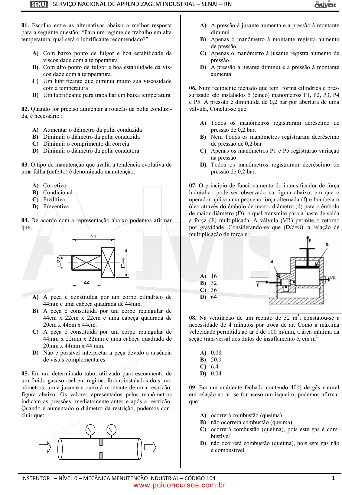 pcimarkpci MDAwMDowMDAwOjAwMDA6MDAwMDowMDAwOmZmZmY6YmI0Nzo5MDVm:TW9uLCAyMSBKdW4gMjAyMSAwOTo1MzowOCAtMDMwMA== SERVIÇO NACIONAL DE APRENDIZAGEM INDUSTRIAL – SENAI – RN INSTRUTOR I – NÍVEL 0 – MECÂNICA MENUTENÇÃO INDUSTRIAL – CÓDIGO 104 1 01. Escolha entre as alternativas abaixo a melhor resposta para a seguinte questão: “Para um regime de trabalho em alta temperatura, qual será o lubrificante recomendado?” A) Com baixo ponto de fulgor e boa estabilidade da viscosidade com a temperatura B) Com alto ponto de fulgor e boa estabilidade da vis- cosidade com a temperatura C) Um lubrificante que diminui muito sua viscosidade com a temperatura D) Um lubrificante para trabalhar em baixa temperatura 02. Quando for preciso aumentar a rotação da polia conduzi- da, é necessário : A) Aumentar o diâmetro da polia conduzida B) Diminuir o diâmetro da polia conduzida C) Diminuir o comprimento da correia D) Diminuir o diâmetro da polia condutora 03. O tipo de manutenção que avalia a tendência evolutiva de uma falha (defeito) é denominada manutenção: A) Corretiva B) Condicional C) Preditiva D) Preventiva 04. De acordo com a representação abaixo podemos afirmar que; A) A peça é constituída por um corpo cilíndrico de 44mm e uma cabeça quadrada de 44mm. B) A peça é constituída por um corpo retangular de 44cm x 22cm x 22cm e uma cabeça quadrada de 20cm x 44cm x 44cm. C) A peça é constituída por um corpo retangular de 44mm x 22mm x 22mm e uma cabeça quadrada de 20mm x 44mm x 44 mm. D) Não e possível interpretar a peça devido a ausência de vistas complementares. 05. Em um determinado tubo, utilizado para escoamento de um fluido gasoso real em regime, foram instalados dois ma- nômetros, um à jusante e outro à montante de uma restrição, figura abaixo. Os valores apresentados pelos manômetros indicam as pressões imediatamente antes e após a restrição. Quando é aumentado o diâmetro da restrição, podemos con- cluir que: A) A pressão à jusante aumenta e a pressão à montante diminui. B) Apenas o manômetro à montante registra aumento de pressão. C) Apenas o manômetro à jusante registra aumento de pressão. D) A pressão à jusante diminui e a pressão à montante aumenta. 06. Num recipiente fechado que tem forma cilíndrica e pres- surizado são instalados 5 (cinco) manômetros P1, P2, P3, P4 e P5. A pressão é diminuída de 0,2 bar por abertura de uma válvula, Conclui-se que: A) Todos os manômetros registraram acréscimo de pressão de 0,2 bar. B) Nem Todos os manômetros registraram decréscimo de pressão de 0,2 bar C) Apenas os manômetros P1 e P5 registrarão variação na pressão D) Todos os manômetros registraram decréscimo de pressão de 0,2 bar. 07. O princípio de funcionamento do intensificador de força hidráulico pode ser observado na figura abaixo, em que o operador aplica uma pequena força alternada (f) e bombeia o óleo através do êmbolo de menor diâmetro (d) para o êmbolo de maior diâmetro (D), o qual transmite para a haste de saída a força (F) multiplicada. A válvula (VR) permite o retorno por gravidade. Considerando-se que (D/d=8), a relação de multiplicação de força é: A) 16 B) 32 C) 36 D) 64 08. Na ventilação de um recinto de 32 m 3 , constatou-se a necessidade de 4 minutos por troca de ar. Como a máxima velocidade permitida ao ar é de 100 m/min, a área mínima da seção transversal dos dutos de insuflamento é, em m 2 A) 0,08 B) 50.0 C) 6,4 D) 0,04 09. Em um ambiente fechado contendo 40% de gás natural em relação ao ar, se for aceso um isqueiro, podemos afirmar que: A) ocorrerá combustão (queima) B) não ocorrerá combustão (queima) C) ocorrerá combustão (queima), pois este gás é com- bustível D) não ocorrerá combustão (queima), pois este gás não é combustível www.pciconcursos.com.br pcimarkpci MDAwMDowMDAwOjAwMDA6MDAwMDowMDAwOmZmZmY6YmI0Nzo5MDVm:TW9uLCAyMSBKdW4gMjAyMSAwOTo1MzowOCAtMDMwMA== SERVIÇO NACIONAL DE APRENDIZAGEM INDUSTRIAL – SENAI – RN INSTRUTOR I – NÍVEL 0 – MECÂNICA MENUTENÇÃO INDUSTRIAL – CÓDIGO 104 2 10. Ao aquecermos um metal posicionando-o no topo da chama do gás natural, este poderá atingir uma temperatura: A) no máximo igual a temperatura de chama do gás na- tural B) mais alta do que a temperatura de chama do gás na- tural C) mais baixa do que a temperatura de chama do gás natural D) igual a temperatura de chama do gás GLP 11. Qual o tipo de tubo que deve ser utilizado para serviço de alta pressão e grande responsabilidade: A) sem costura e qualquer número de SCHEDULES ou SÉRIE B) com costura e um número baixo de SCHEDULES ou SÉRIE C) com costura e um número alto de SCHEDULES ou SÉRIE D) sem costura e um número alto de SCHEDULES ou SÉRIE 13. A cota máxima de tem o valor de: A) 17,91 mm B) 17,95 mm C) 18,05 mm D) 18,09 mm 14. Em um líquido que escoa por um tubo, está caracterizada uma grandeza denominada vazão, que é medida. Sua unidade no SI é: A) mmHg B) N/h C) m3/s D) kg/ m3 15. Um micrômetro com parafuso micrométrico de passo 0,5 mm e escala do tambor com 50 divisões, tem um deslocamen- to correspondente a uma divisão do tambor equivalente a: A) 1,00 mm B) 0,10 mm C) 0,01 mm D) 0,001 mm 16. Uma medida que corresponde a 16 divisões em uma esca- la graduada com divisões de 1/32", tem o valor equivalente a: A) 1/2" B) 1/4" C) 3/8" D) 3/4" www.pciconcursos.com.br