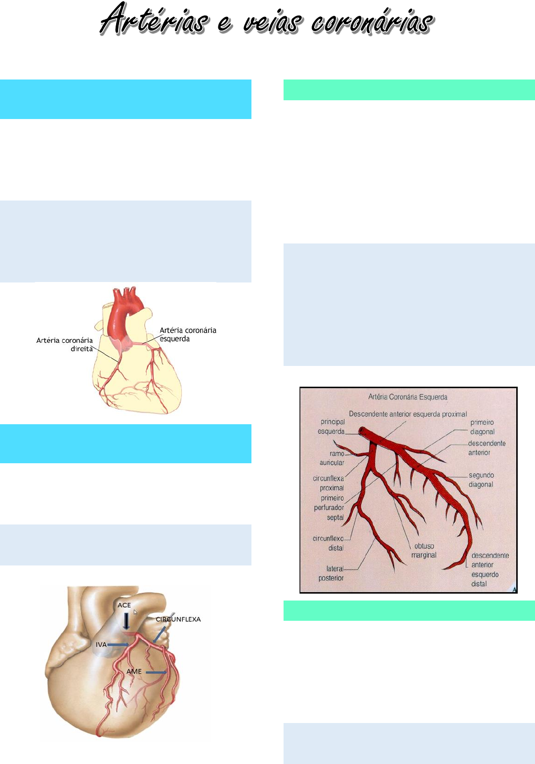 Surgimento As artérias coronárias surgem a partir do ramo ascendente da artéria aorta e fornecem sangue oxigenado para o miocárdio. São duas artérias coronárias: a) Artéria coronária direita (surge no ramo ascendente direito da aorta); b) Artéria coronária esquerda (surge no ramo ascendente esquerdo da aorta). Artéria coronária esquerda A artéria coronária esquerda passa inferiormente à aurícula esquerda e se divide em dois ramos principais: a) Ramo interventricular anterior; b) Ramo circunflexo. Ramo interventricular anterior O ramo interventricular anterior, também conhecido como ramo descendente anterior, encontra-se anteriormente ao sulco interventricular anterior (repousado no sulco) e fornece sangue oxigenado às paredes dos dois ventrículos, bem como ao septo interventricular, seguindo em direção ao ápice do coração. Ele emite alguns ramos: a) Ramos diagonais ou marginais: podem ser primários (que são maiores e mais próximos aos ramos principais) ou secundários (menores e mais afastados do ramo principal); b) Ramos interventriculares septais (perfurantes). Ramo circunflexo Já o ramo circunflexo se encontra no sulco coronário e distribui sangue oxigenado às paredes do ventrículo esquerdo e átrio esquerdo. Ele emite os seguintes alguns ramos, os quais podemos destacar: a) Ramo marginal esquerdo; b) Ramo posterior do ventrículo esquerdo; c) Ramos atriais; d) Ramo interventricular posterior. Artéria coronária direita A artéria coronária direita passa através do sulco atrioventricular para o lado direito, e continua para a superfície posterior do coração. Ela supre as câmaras do lado direito, bem como parte do ventrículo esquerdo, áreas dos septos interatrial e interventricular, o nó sinoatrial e o nó atrioventricular. Emite diversos ramos, como: a) Ramo do nó sinoatrial; b) Ramo do nó atrioventricular; c) Ramo marginal direito; d) Ramo interventricular posterior (ou descendente posterior); e) Ramo do cone arterial; f) Ramos atriais; g) Ramo póstero-lateral direito. Seio coronariano Após a passagem do sangue pelas artérias da circulação coronariana, ele flui para os capilares, onde fornece oxigênio e nutrientes ao tecido cardíaco e coleta dióxido de carbono e escórias metabólicas, deslocando-se para as veias coronárias na sequência. A maior parte do sague venoso do miocárdio drena para um grande seio vascular no sulco coronário na face posterior do coração, o seio coronário. O sangue venoso do seio coronário drena para o átrio direito pelo óstio do seio coronário. As artérias que transportam o sangue para o seio coronário são: Veia cardíaca magna No sulco interventricular anterior, que drena as áreas do coração irrigadas pela artéria coronária esquerda (ventrículos direito e esquerdo e átrio esquerdo). É a maior, e, derivada dela, temos a veia marginal esquerda (vista na face anterior). Veia interventricular posterior No sulco interventricular posterior, que drena as áreas irrigadas pelo ramo interventricular posterior da artéria coronária direita (ventrículos esquerdo e direito). Veia cardíaca parva No sulco coronário, que drena o átrio direito e o ventrículo direito. É a menor, e, derivada dela, temos a meia marginal direita, encontrada na face posterior. Veias anteriores do ventrículo direito Drenam o ventrículo direito e drenam diretamente para o átrio direito.