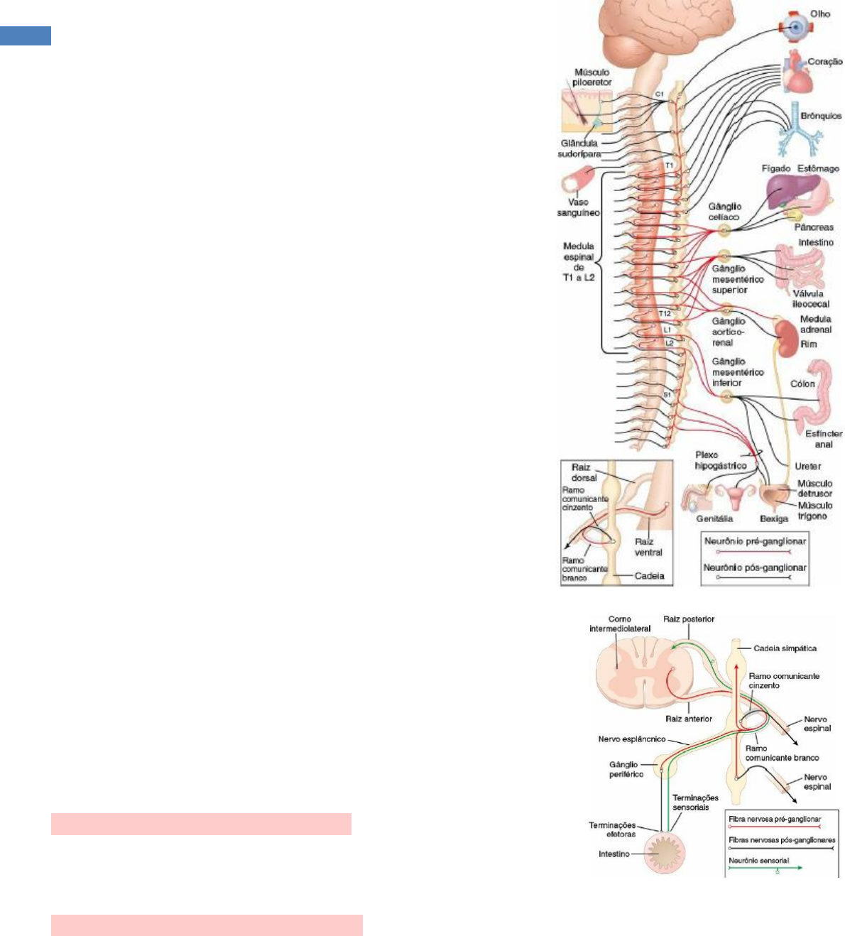 @bene.med 1 Problema 03 – Módulo VI: Experiências O SNA é a porção do SNC que controla a maioria das funções viscerais. Esse sistema ajuda a controlar a PA, a motilidade gastrointestinal, a secreção gastrointestinal, o esvaziamento da bexiga, a sudorese, a temperatura corporal e etc, sendo algumas parcialmente e outras totalmente controladas. Uma característica importante do SNA é a rapidez a intensidade com que ele pode alterar essas funções. Por exemplo, em 3 a 5 segundos ele pode aumentar a FC até valores duas vezes maiores que o normal. Organização Geral do SNA – ele é ativado principalmente por centros localizados na medula espinal, no tronco cerebral e no hipotálamo. Além disso, porções do córtex cerebral, em especial o sistema límbico, podem transmitir sinais para os centros inferiores, e isso pode influenciar o controle autônomo. O SNA também opera por meio de reflexos viscerais, ou seja, por sinais sensoriais subconscientes de órgãos viscerais que podem chegar aos gânglios autônomos, no tronco cerebral ou no hipotálamo, e então retornar como respostas reflexas subconscientes, diretamente aos órgãos viscerais para controle de suas atividades. Os sinais autônomos eferentes são transmitidos aos diferentes órgãos do corpo por meio de duas subdivisões chamadas Sistema Nervoso Simpático e Sistema Nervoso Parassimpático. As fibras nervosas simpáticas se originam na medula espinal junto com os nervos espinais entre os segmentos T1 e L2, projetando-se primeiro para a cadeia simpática e, daí, para os tecidos e órgãos que são estimulados pelos nervos simpáticos. Neurônios Simpáticos Pré e Pós Ganglionares – cada via simpática da medula ao tecido estimulado é composta de dois neurônios, o pré e o pós. O corpo celular de cada neurônio pré- ganglionar está situado no corno intermediolateral da medula espinal, e sua fibra passa pela raiz ventral da medula para o nervo espinal correspondente. Após o nervo espinal deixar o canal espinal, as fibras simpáticas pré-ganglionares deixam o nervo espinal e passam pelo ramo comunicante branco para um dos gânglios da cadeia simpática. As fibras podem fazer sinapse com neurônios simpáticos pós-ganglionares, pode se dirigir para cima ou para baixo na cadeia e fazer sinapse com outro gânglio da cadeia, ou ainda pode percorrer distancia variáveis pela cadeia e dirigir- se para fora dela, fazendo finalmente sinapse em gânglio simpático periférico. O neurônio simpático pós-ganglionar origina-se nos gânglios da cadeia simpática ou nos gânglios simpáticos periféricos, dirigindo-se para seu destino em diversos órgãos. »FIBRAS NERVOSAS SIMPÁTICAS NOS NERVOS ESQUELÉTICOS: algumas fibras pós-ganglionares passam de volta da cadeia simpática para os nervos espinhais, pelos ramos comunicantes cinzentos. Essas fibras são finas, do tipo C, e se estendem para todas as partes do corpo por meio dos nervos esqueléticos. Elas controlam vasos sanguíneos, glândulas sudoríparas e os músculos piloeretores, sendo aproximadamente 8% das fibras dos nervos esqueléticos. »DISTRIBUIÇÃO SEGMNTAR DAS FIBRAS NERVOSAS SIMPÁTICAS: as vias que se originam nos diferentes segmentos da medula espinal não são necessariamente distribuídas para as mesmas partes do corpo como as fibras nervosas espinais somáticas dos mesmos segmentos. As fibras simpáticas do segmento T1 se projetam para cima da cadeia, para terminar na cabeça, de T2 para terminar no pescoço, de T3/T4/T5/T6 para terminar no tórax, de T7/T8/T9/T10/T11 para o abdome, e de T12/L1/L2 para as pernas. A distribuição dos nervos simpáticos para cada órgão é definida pela localização original do órgão no embrião. Desse modo, o coração recebe muitas fibras vindas da porção cervical da cadeia simpática, pois ele se origina embriologicamente na região cervical do embrião. A maioria dos órgãos abdominais recebe inervação simpática dos segmentos inferiores da medula espinal torácica, pois o intestino primitivo se originou nessa área. @bene.med 2 Problema 03 – Módulo VI: Experiências »NATUREZA ESPECIAL DAS TERMINAÇÕES NERVOSAS SIMPÁTICAS NAS MEDULAS ADRENAIS: fibras nervosas simpáticas pré-ganglionares se projetam diretamente sem fazer sinapse, desde o corno intermediolateral da medula, passando pelas cadeias simpáticas e pelos nervos esplâncnicos para, por fim, fazer sinapse nas medulas adrenais. Elas terminam nas células neuronais que secretam epinefrina e norepinefrina na corrente sanguínea, as quais são embriologicamente derivadas do tecido nervoso e são verdadeiros neurônios pós-ganglionares. Anatomia Fisiológica do Sistema Nervoso Parassimpático – as fibras parassimpáticas deixam o sistema nervoso central pelos III, VII, IX e X nervos cranianos, e as fibras parassimpáticas adicionais deixam a parte mais inferior da medula espinal, pelo segundo e pelo terceiro nervos espinais sacrais, e ocasionalmente pelo primeiro e pelo quarto nervos sacrais. 75% das fibras simpáticas cursam pelo nervo vago (X), passando para todas as regiões torácicas e abdominais, e supre o coração, os pulmões, o esôfago, o estomago, todo o intestino delgado, a metade proximal do cólon, o fígado, a vesícula biliar, o pâncreas, os rins e as porções iniciais dos ureteres. As fibras do terceiro nervo craniano vão para o esfíncter pupilar e o musculo ciliar do olho. Fibras do sétimo nervo craniano se projetam para as glândulas lacrimais, nasais e submandibulares, e fibras do nono nervo craniano vão para a glândula parótida. As fibras parassimpáticas sacrais cursam pelos nervos pélvicos, que passam pelo plexo espinal sacral de cada lado da medula, no nível de S2 e S3. Essas fibras se distribuem para o cólon ascendente, o reto, a bexiga e as porções inferiores dos ureteres. Além disso, esse grupo sacral parassimpático supre sinais nervosos para toda a genitália externa, causando ereção. »